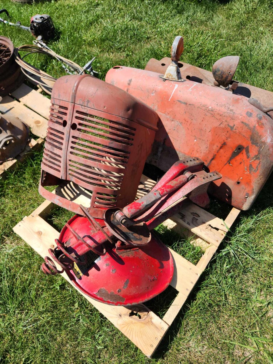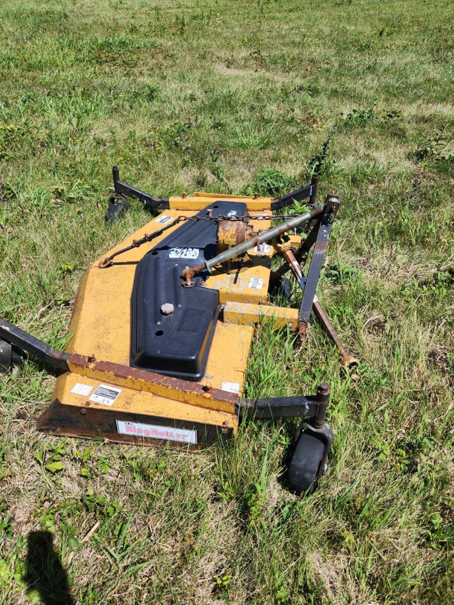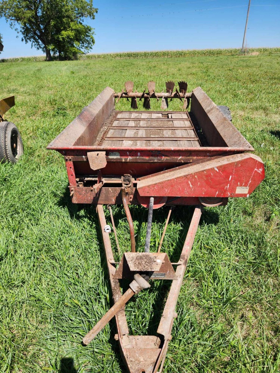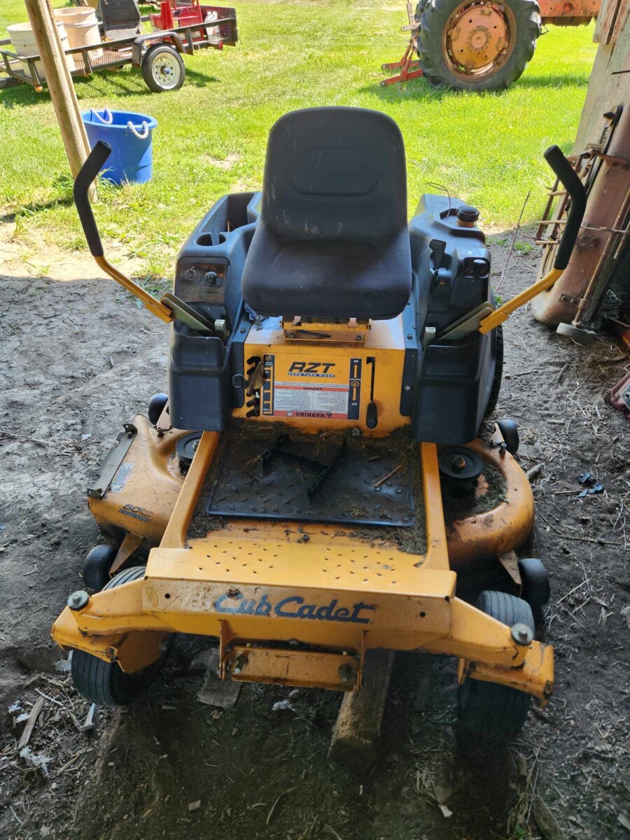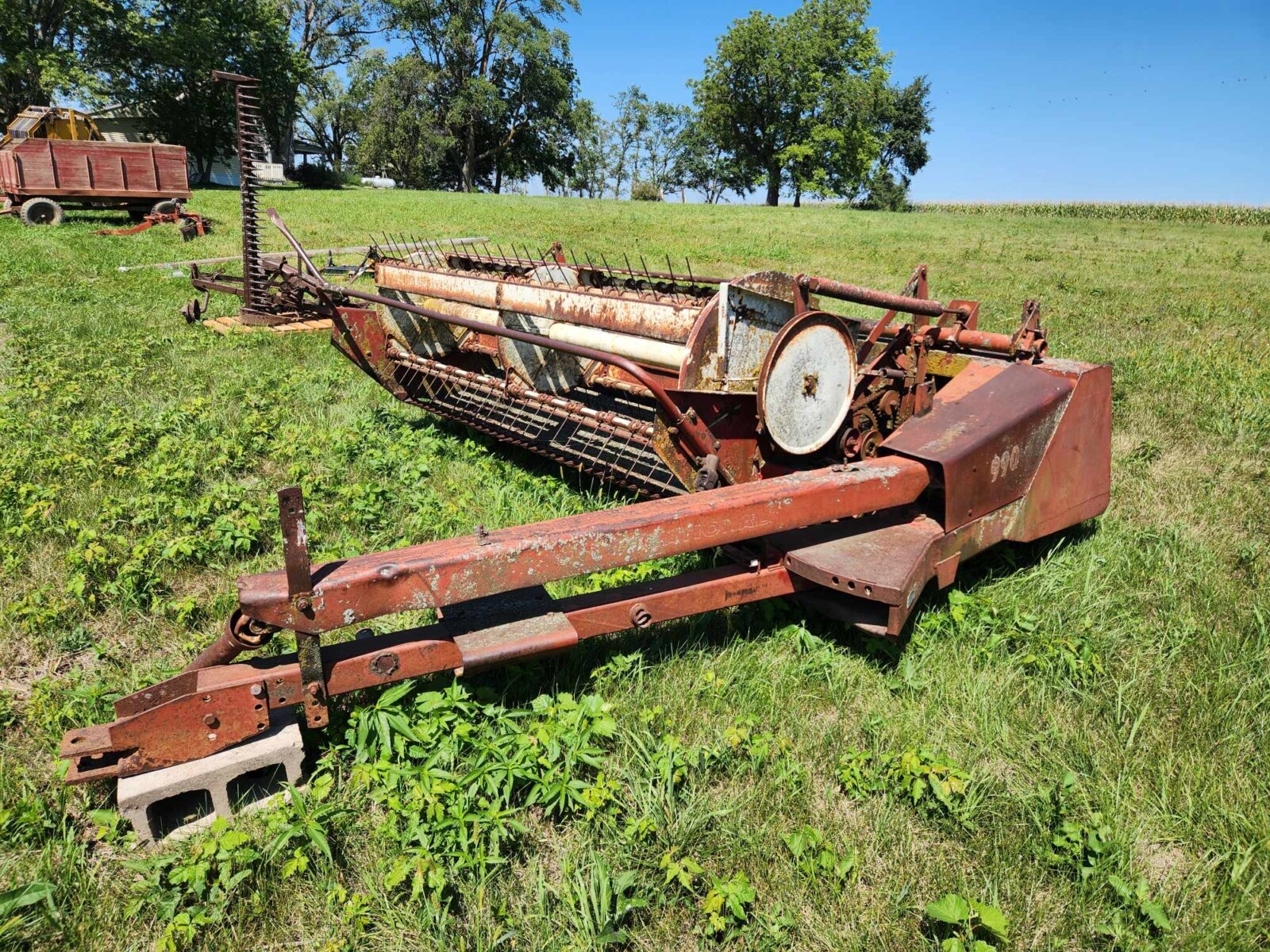 3 pt carrier; IH ground drive manure spreader; bob sled horse drawn; Vermeer 605 baler; Massey Ferguson 110, 3 pt spreader; barge box w/ Big Bear gear; Allis Chalmers 8.5′ snap coupler blade; IH 1650 hydrostatic garden tractor; Allis Chalmers 3 bottom snap coupler; utility trailer; Massey Harris flare side w/ hoist; JD 2 bottom plow pull type, 14′; 4 section harrow; 25 gal tractor tire fluid, calcium chloride; Allis Chalmers snap coupler 7′ sickle mower; King Kutter finish mower, 3 pt; #5 JD sickle mower; IH 990 mower conditioner, 10′; JD 120 lawn mower; 2012 50″ RZTS Cub Cadet lawn mower, 23 hp Kohler; 50″ RZT cub cadet lawn mower, 23 hp Kawasaki engine; 318 JD lawn mower; Huffy 3 wheel bike; torch tube for a D14;