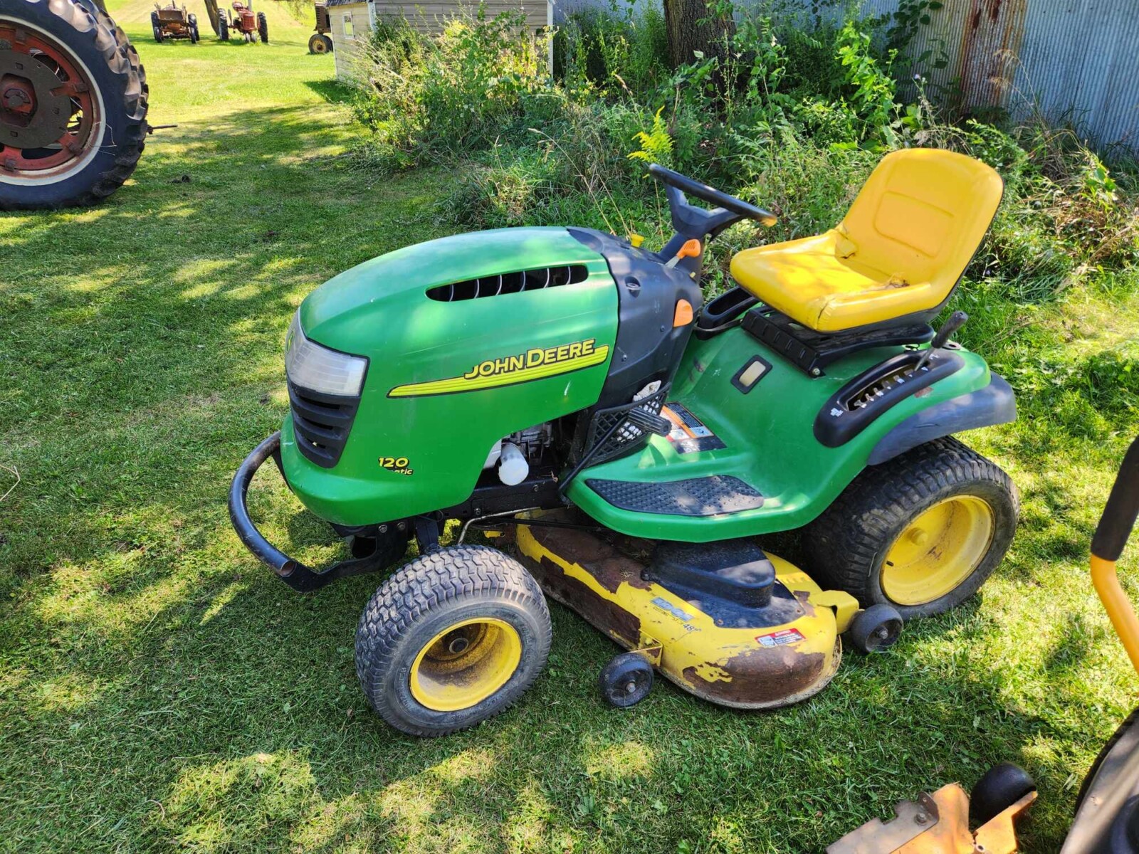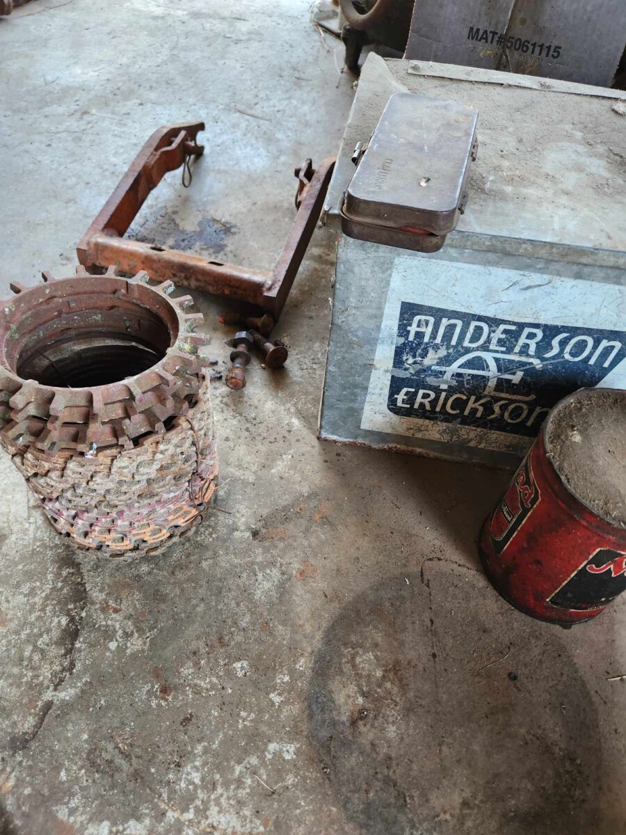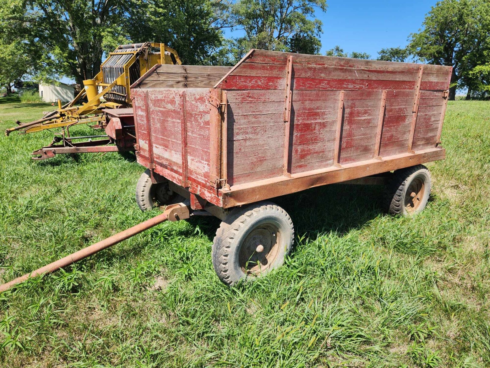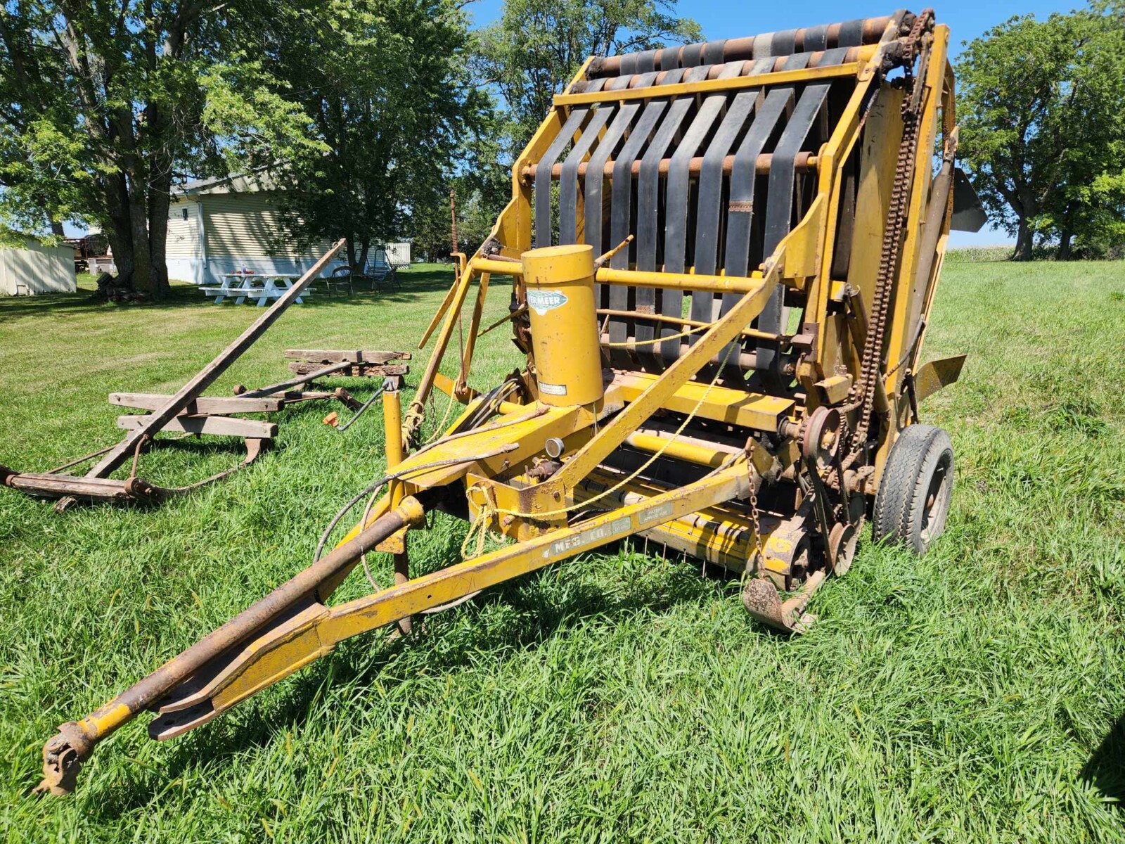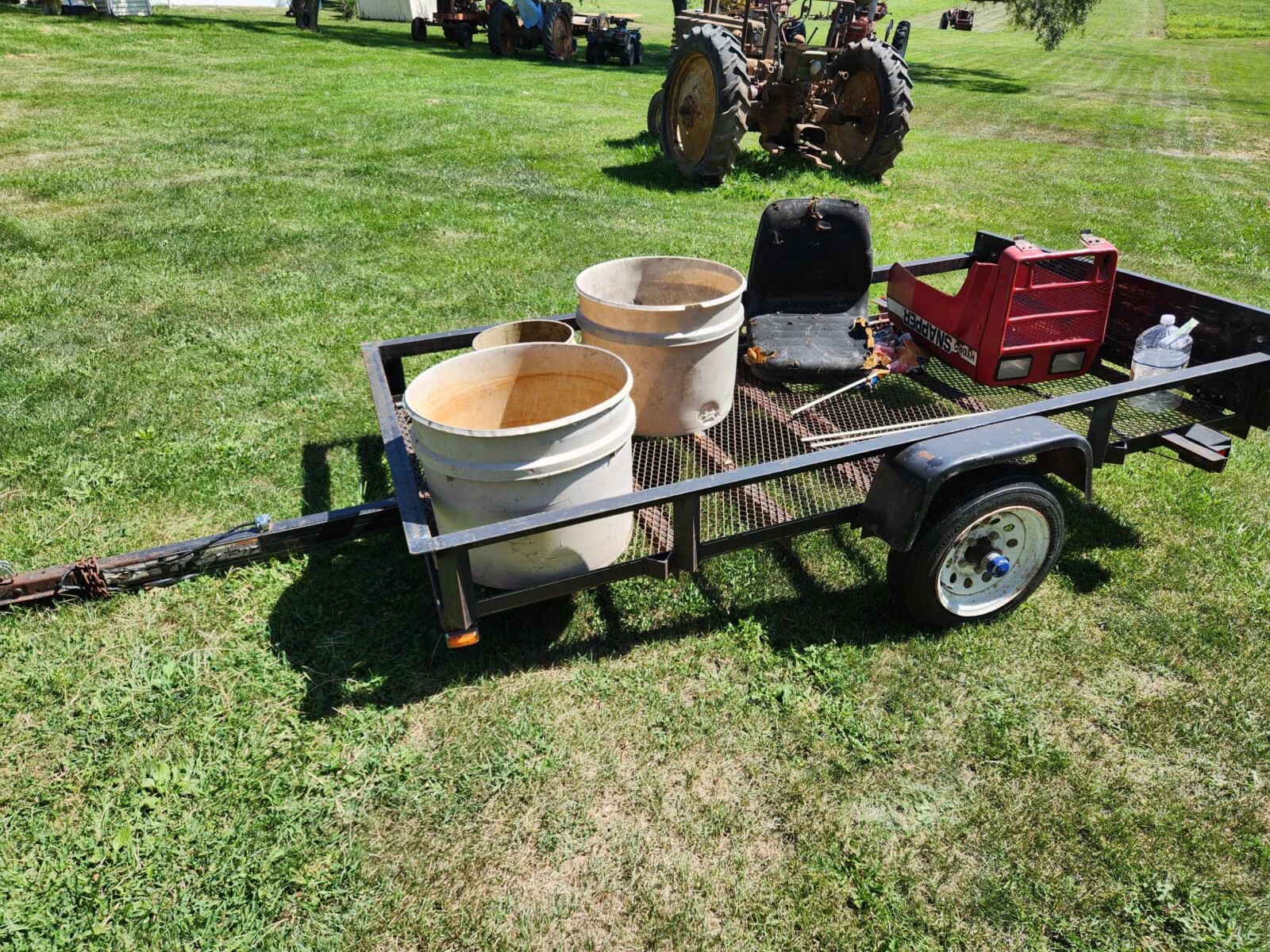 3 pt carrier; IH ground drive manure spreader; bob sled horse drawn; Vermeer 605 baler; Massey Ferguson 110, 3 pt spreader; barge box w/ Big Bear gear; Allis Chalmers 8.5′ snap coupler blade; IH 1650 hydrostatic garden tractor; Allis Chalmers 3 bottom snap coupler; utility trailer; Massey Harris flare side w/ hoist; JD 2 bottom plow pull type, 14′; 4 section harrow; 25 gal tractor tire fluid, calcium chloride; Allis Chalmers snap coupler 7′ sickle mower; King Kutter finish mower, 3 pt; #5 JD sickle mower; IH 990 mower conditioner, 10′; JD 120 lawn mower; 2012 50″ RZTS Cub Cadet lawn mower, 23 hp Kohler; 50″ RZT cub cadet lawn mower, 23 hp Kawasaki engine; 318 JD lawn mower; Huffy 3 wheel bike; torch tube for a D14;