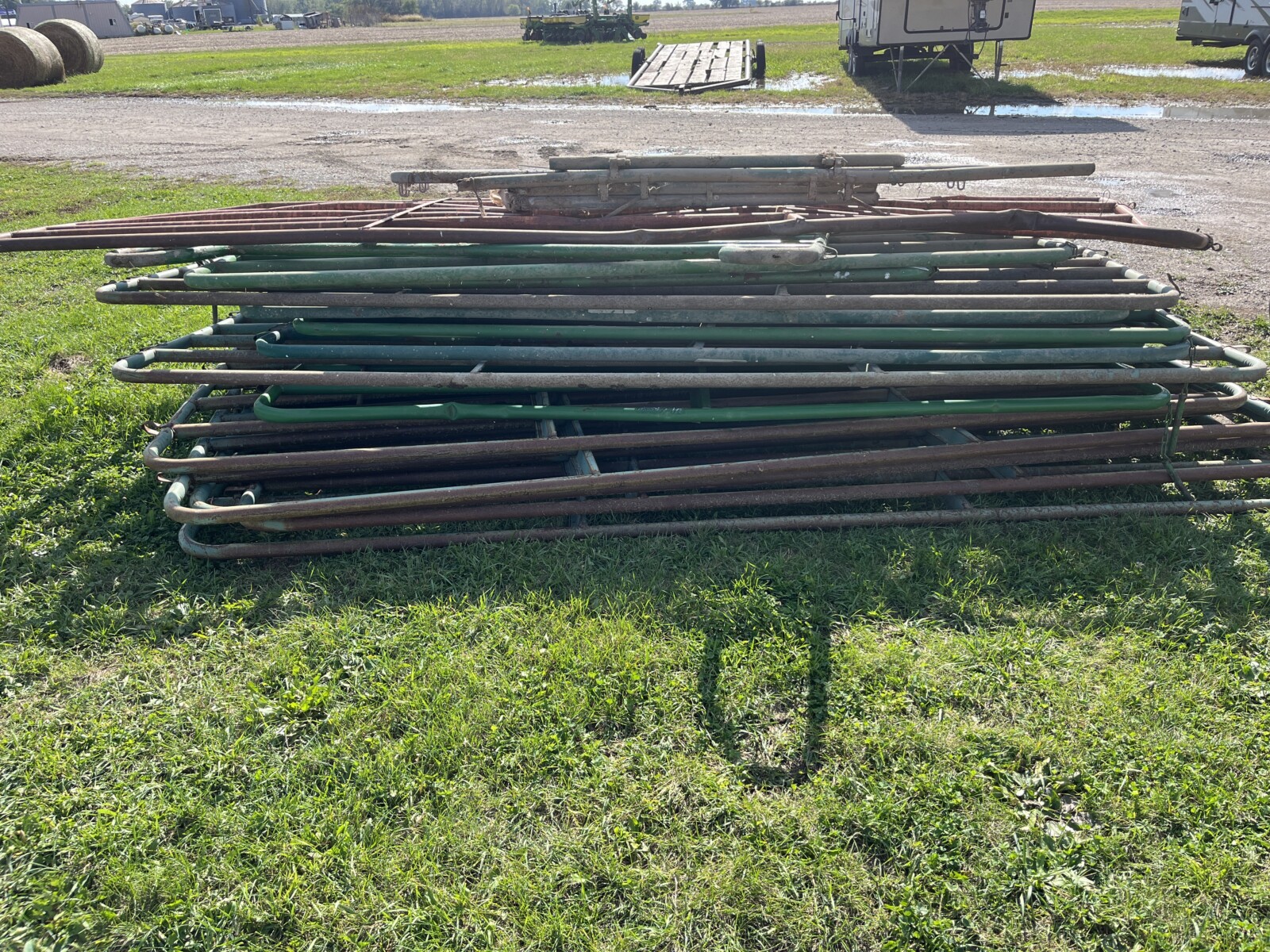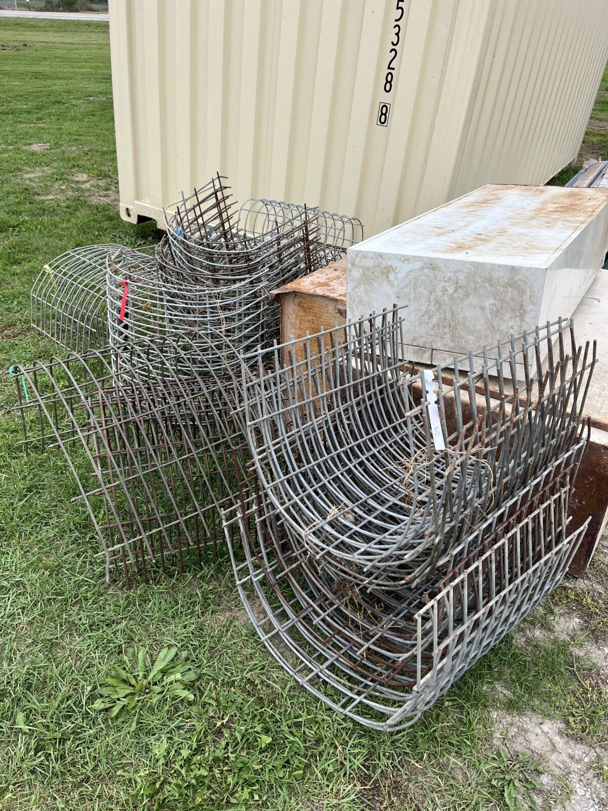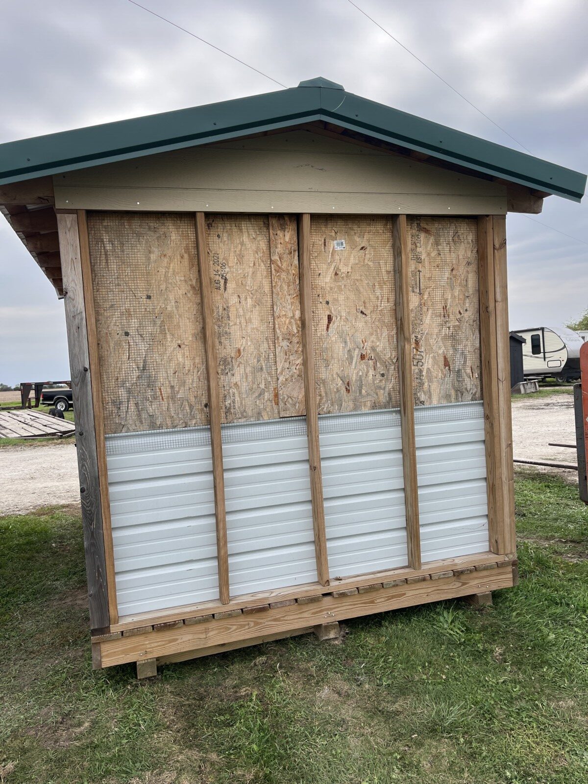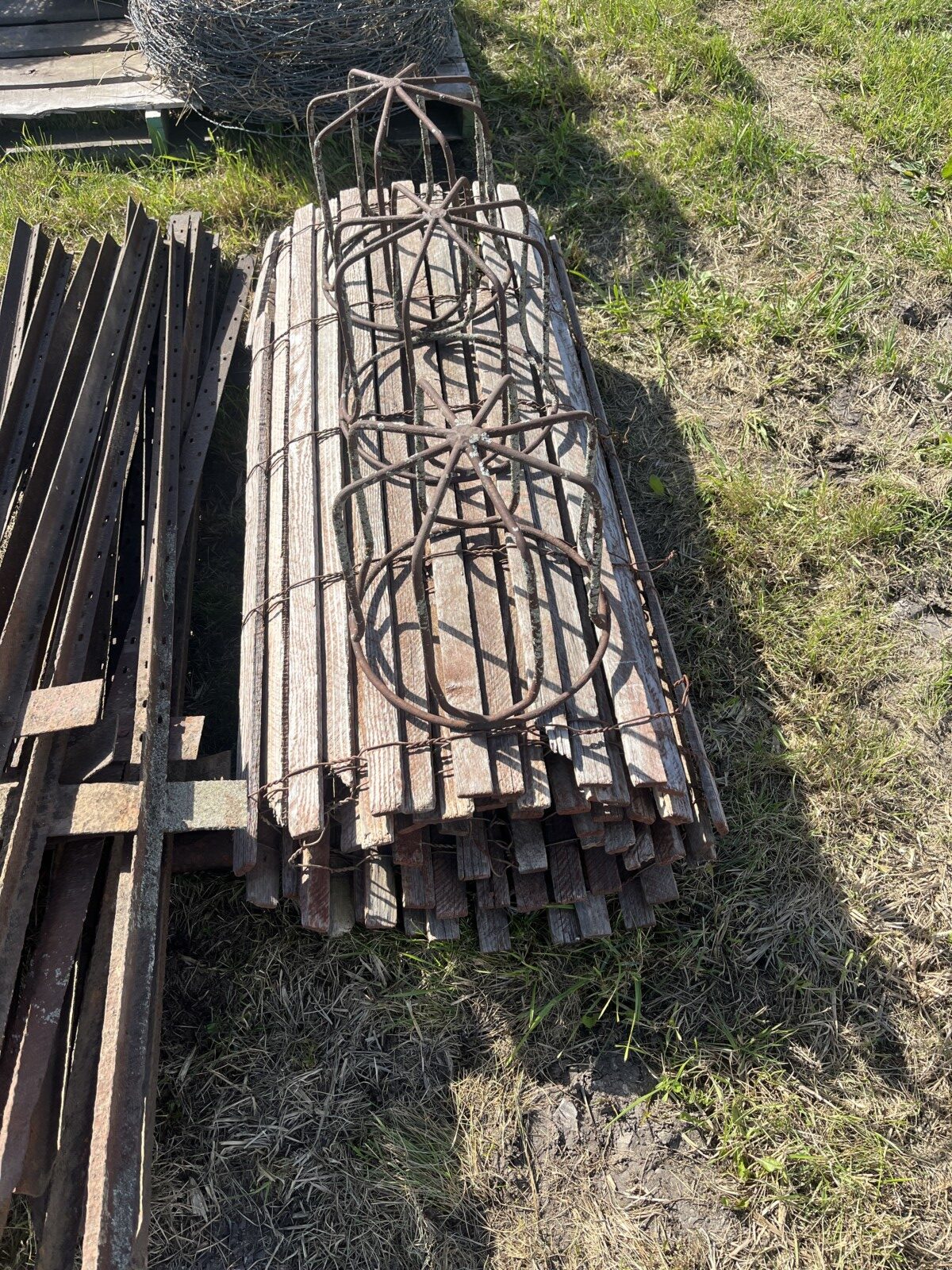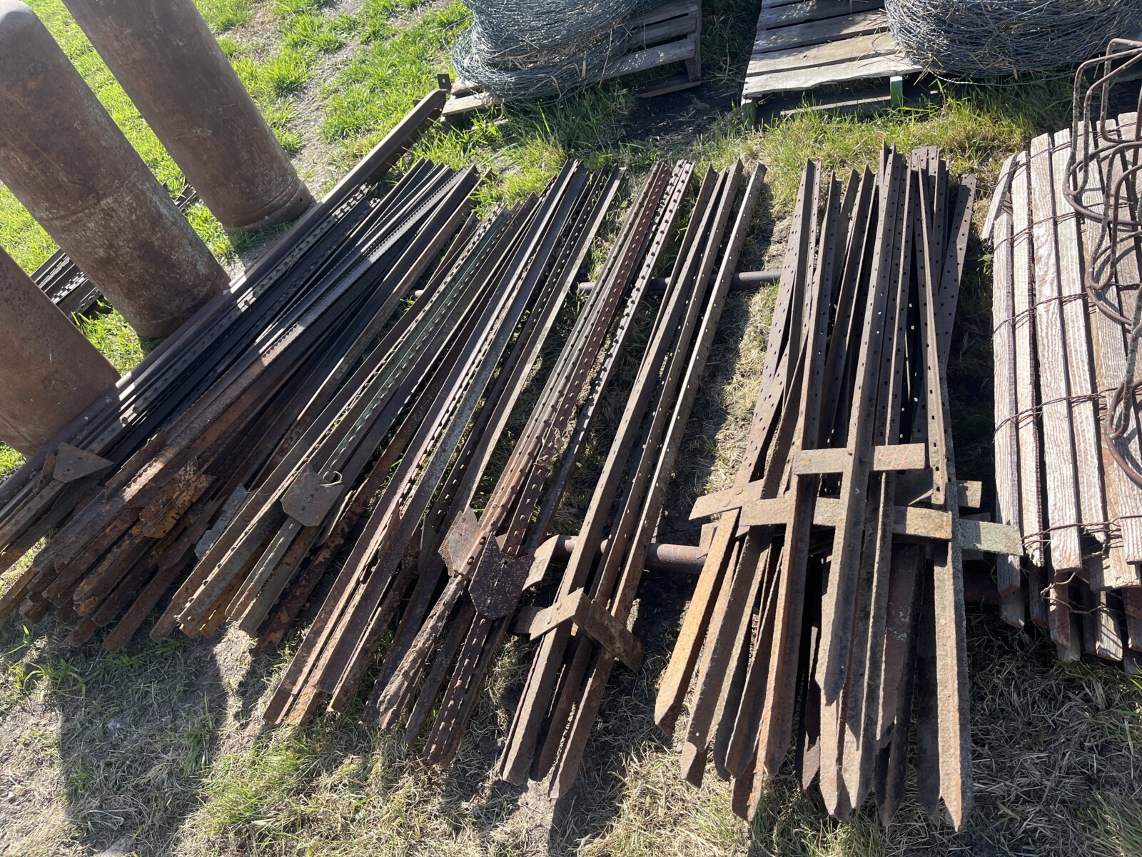 Panels; 7′ steel post; 6′ steel posts; 3′ gates; misc.; fence posts; wooden posts; snow fence; fence braces; woven wire; fiberglass posts; goat feeder; (3) mineral block feeders; 6 ton bin; 2024 6×12 chicken coop, basically brand new, made in Lamoni, Ia by Backyard portable buildings; tan shed; rolls of barb wire; bale ring; 6 ton bin; 5.5 ton bin; (9) stainless steel hog feeders; (2) hog crates;