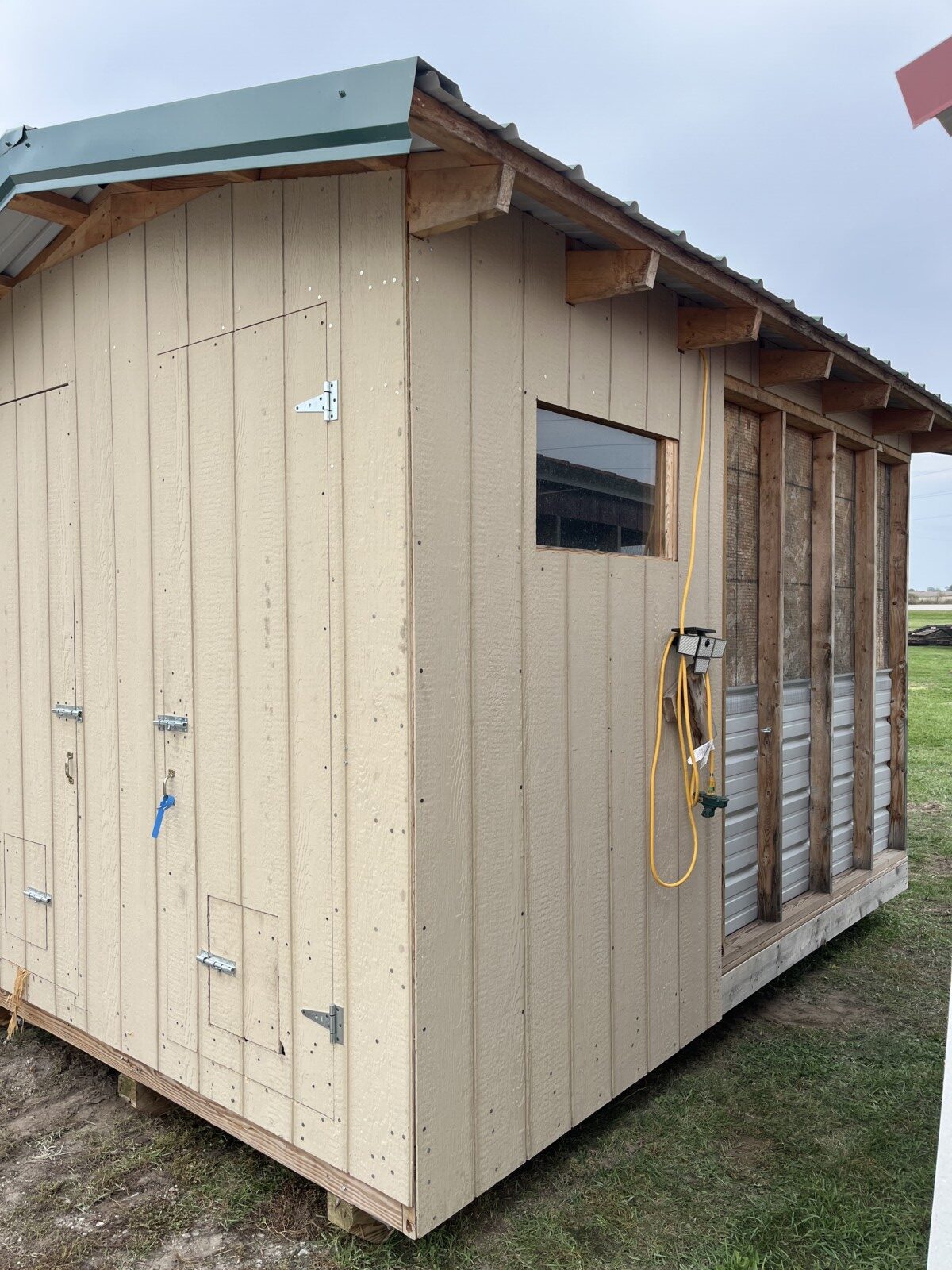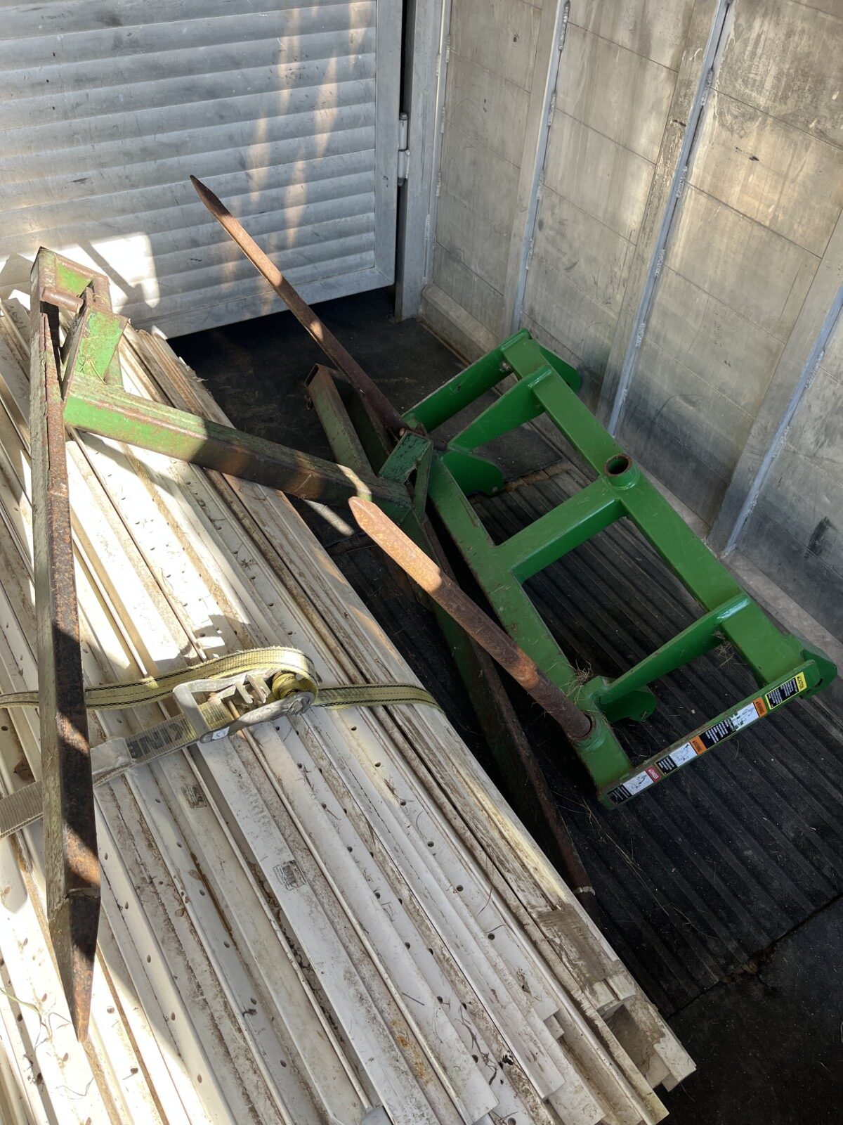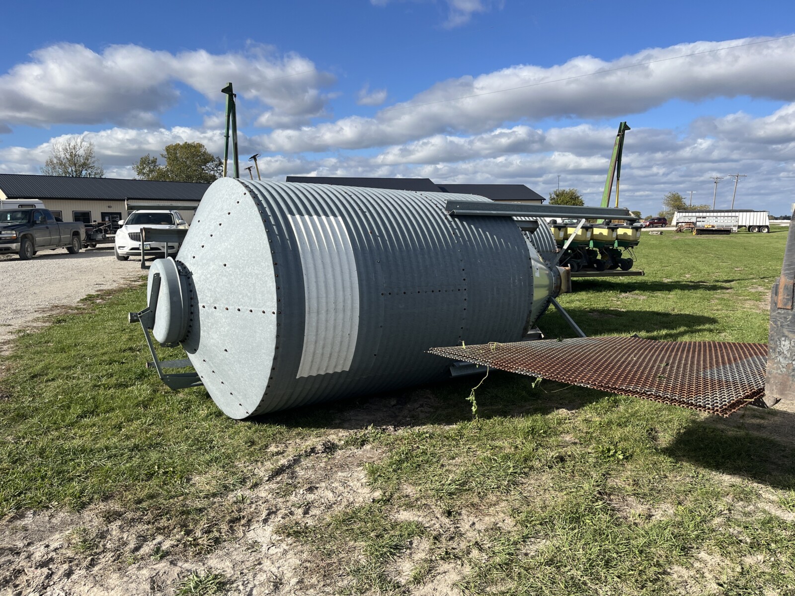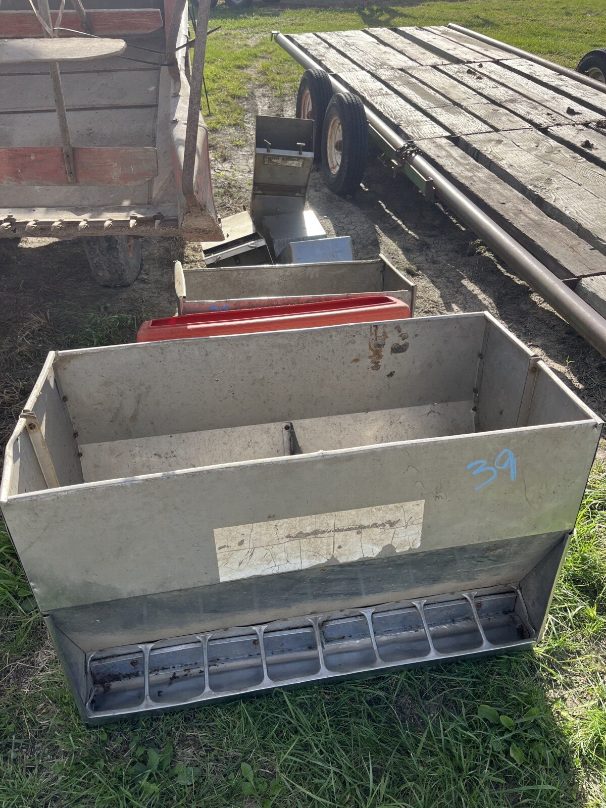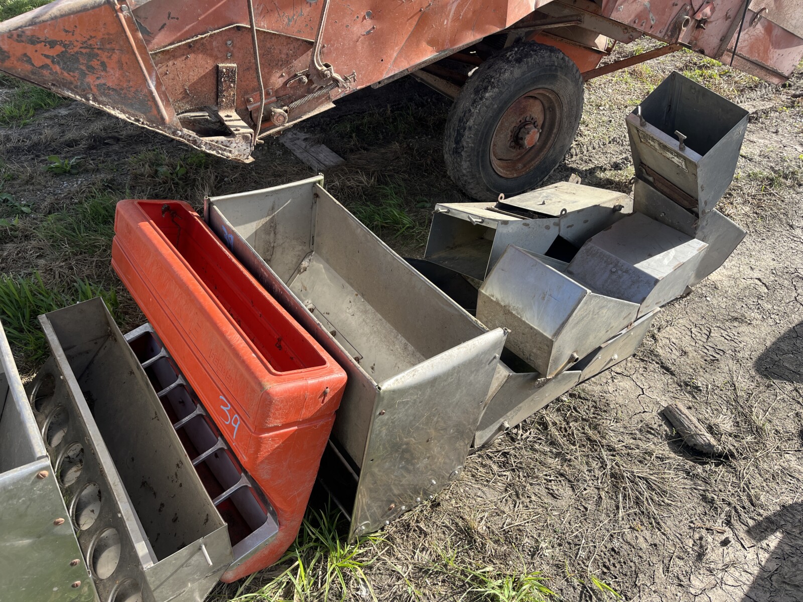 Panels; 7′ steel post; 6′ steel posts; 3′ gates; misc.; fence posts; wooden posts; snow fence; fence braces; woven wire; fiberglass posts; goat feeder; (3) mineral block feeders; 6 ton bin; 2024 6×12 chicken coop, basically brand new, made in Lamoni, Ia by Backyard portable buildings; tan shed; rolls of barb wire; bale ring; 6 ton bin; 5.5 ton bin; (9) stainless steel hog feeders; (2) hog crates;