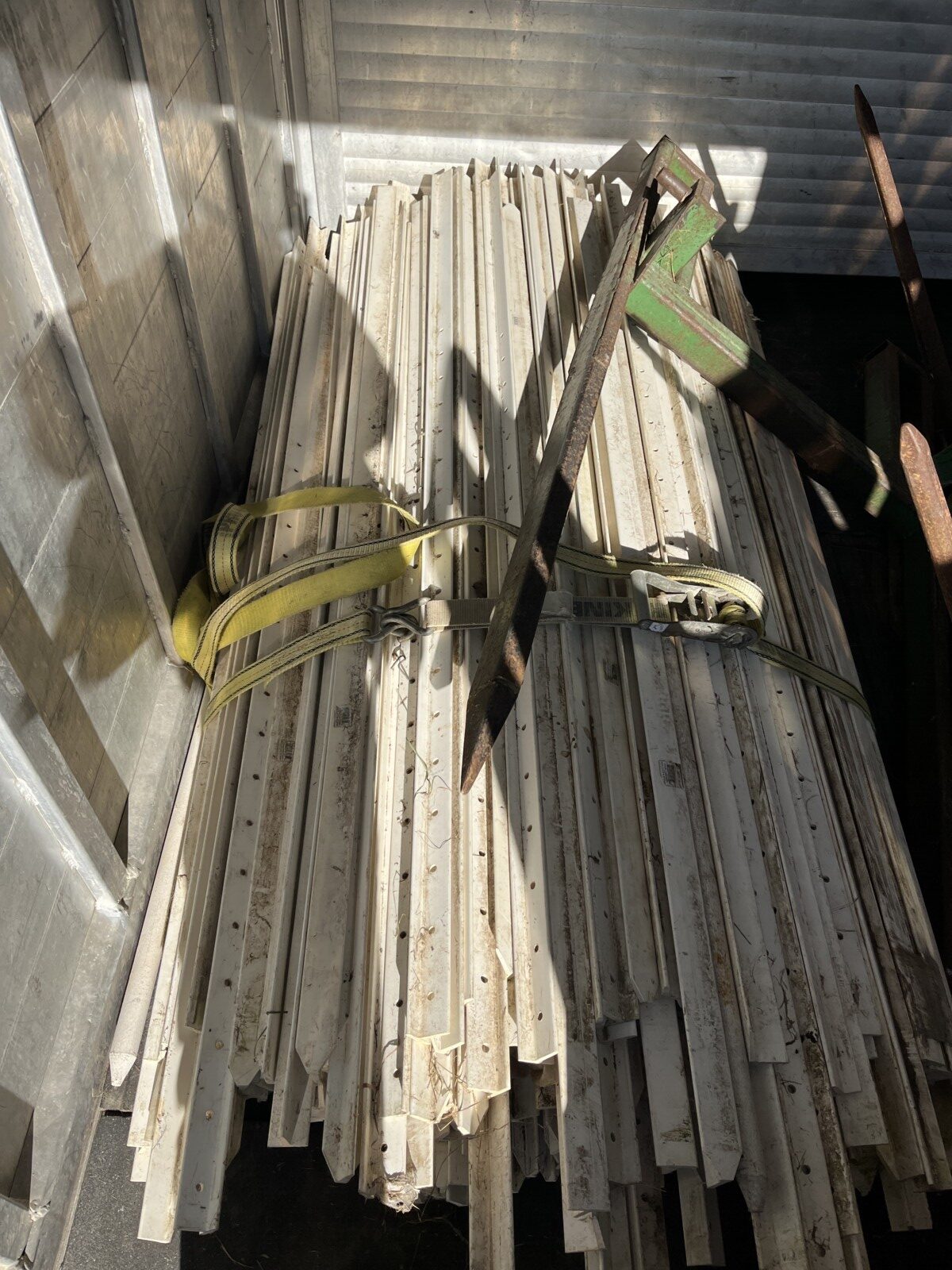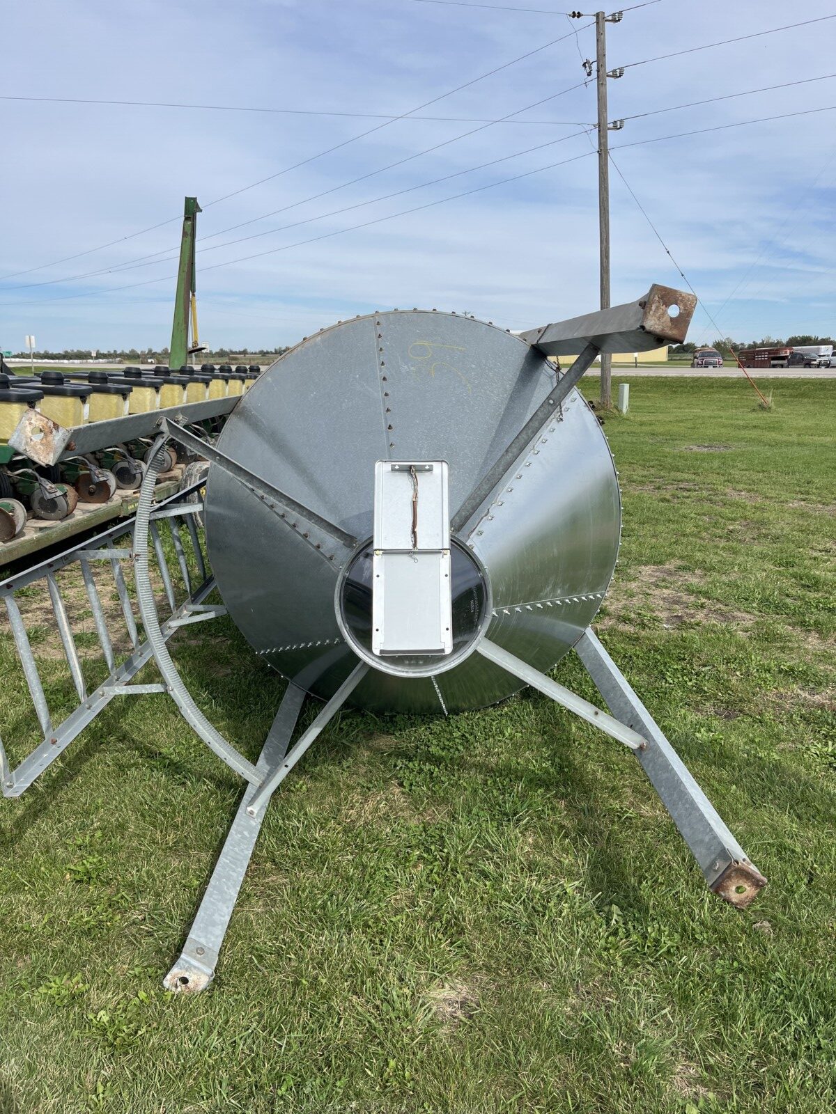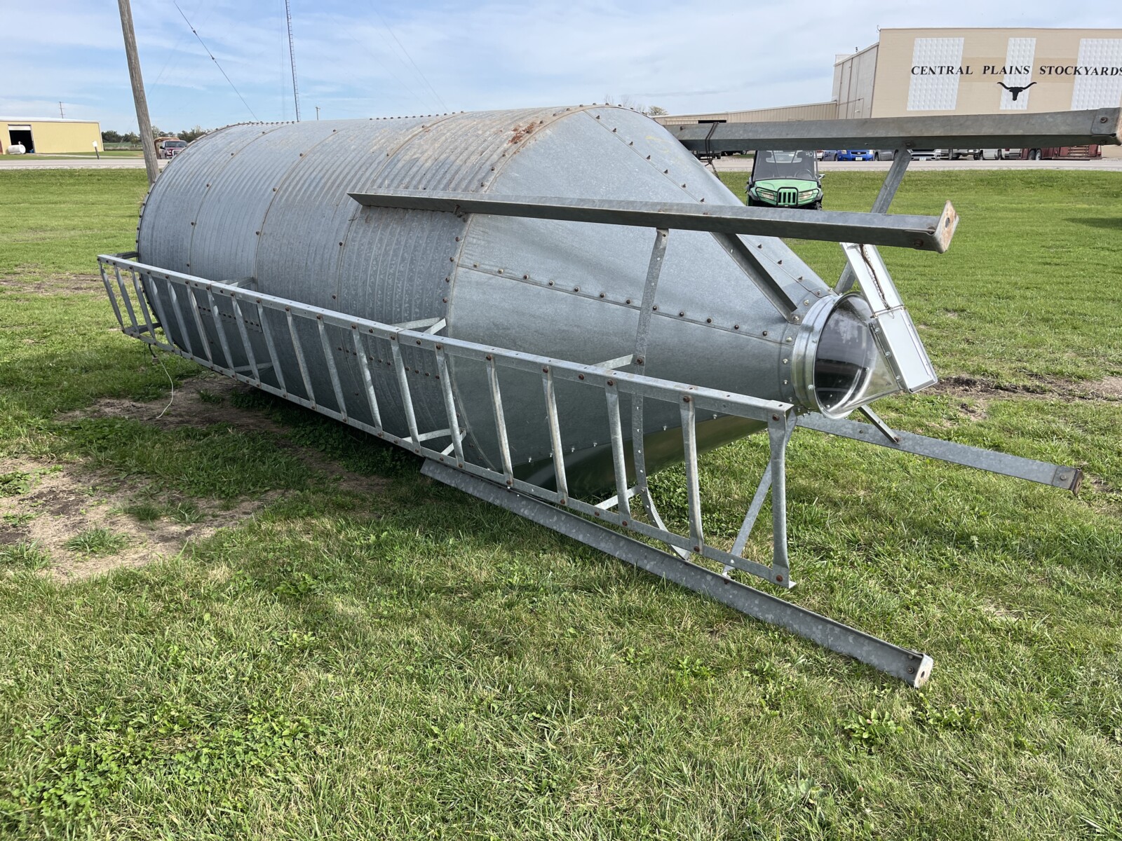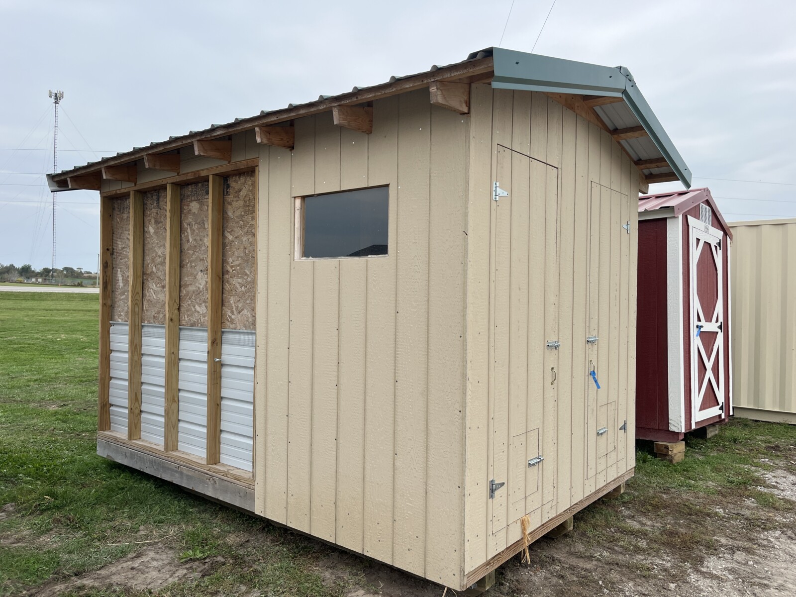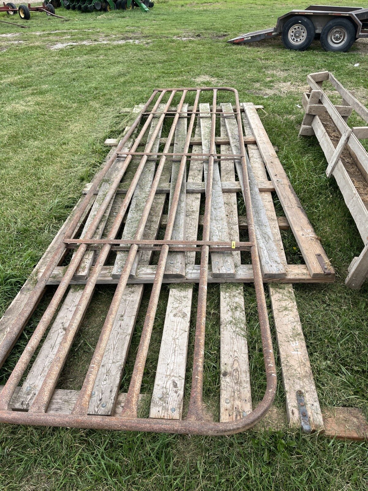 Panels; 7′ steel post; 6′ steel posts; 3′ gates; misc.; fence posts; wooden posts; snow fence; fence braces; woven wire; fiberglass posts; goat feeder; (3) mineral block feeders; 6 ton bin; 2024 6×12 chicken coop, basically brand new, made in Lamoni, Ia by Backyard portable buildings; tan shed; rolls of barb wire; bale ring; 6 ton bin; 5.5 ton bin; (9) stainless steel hog feeders; (2) hog crates;