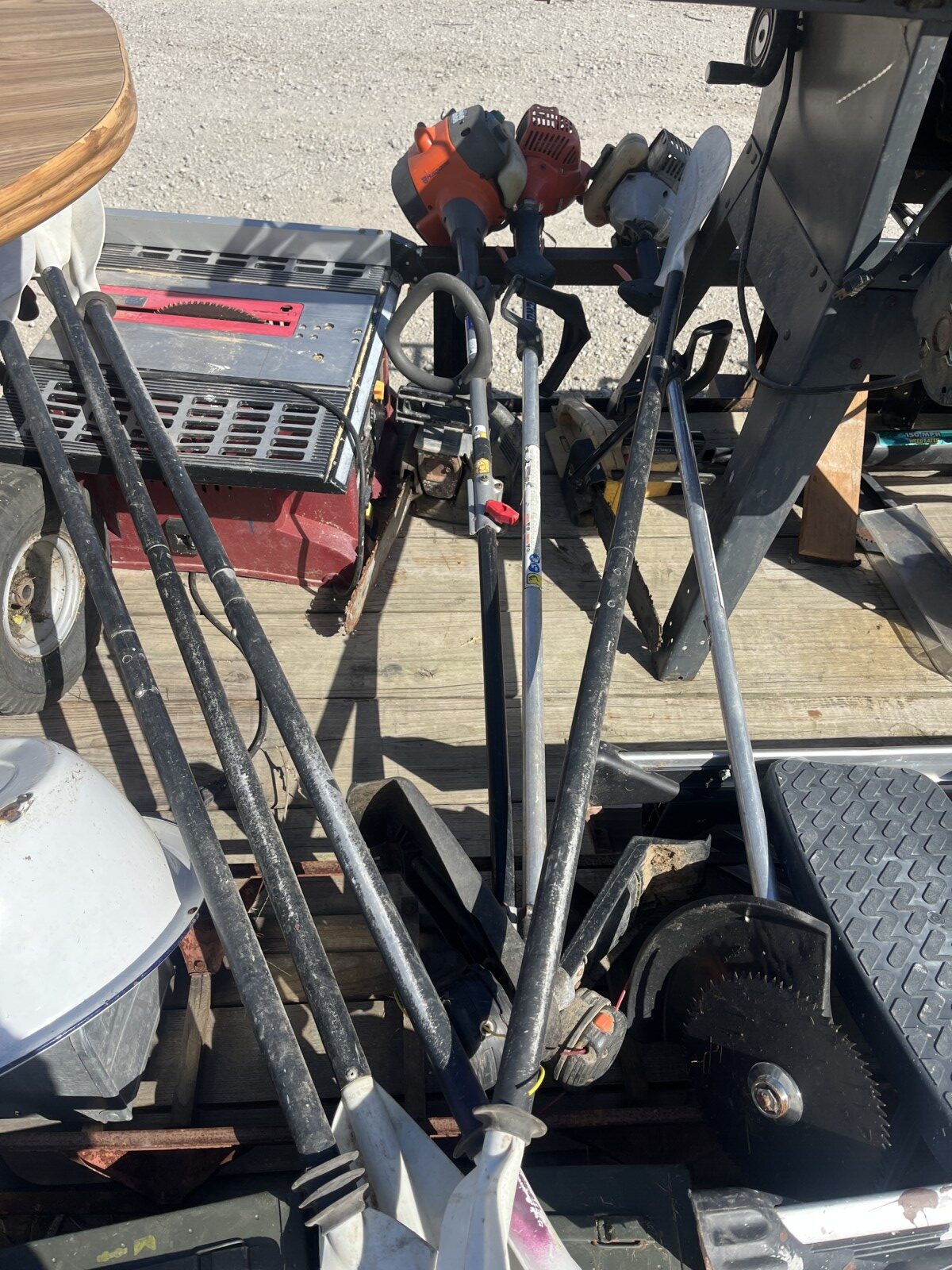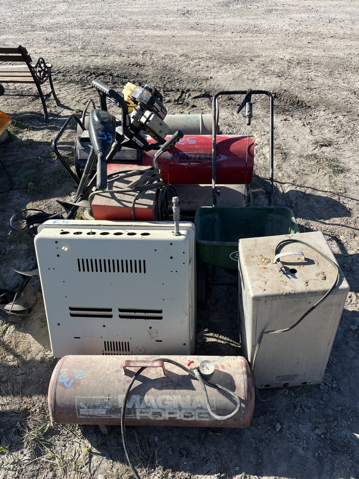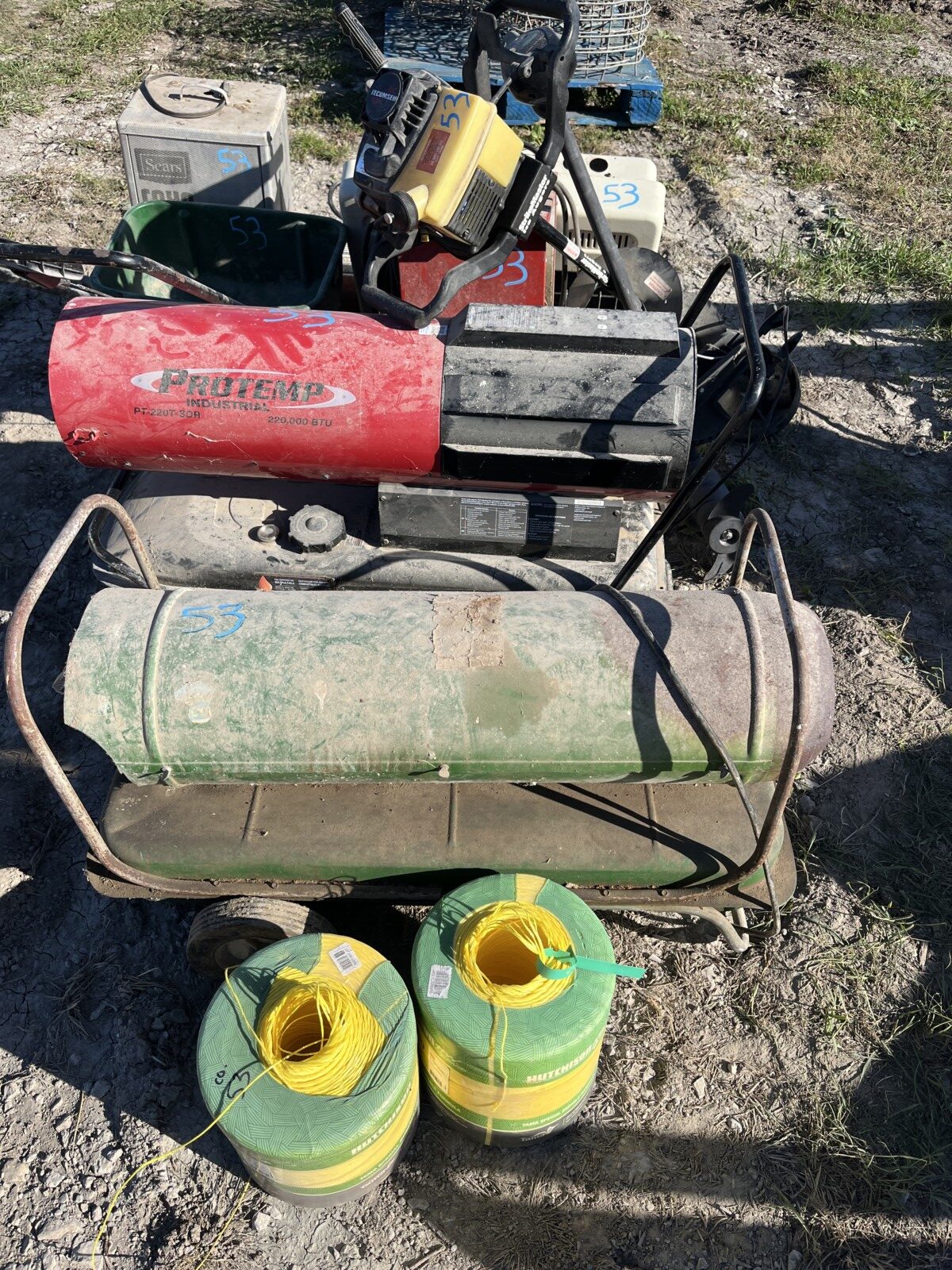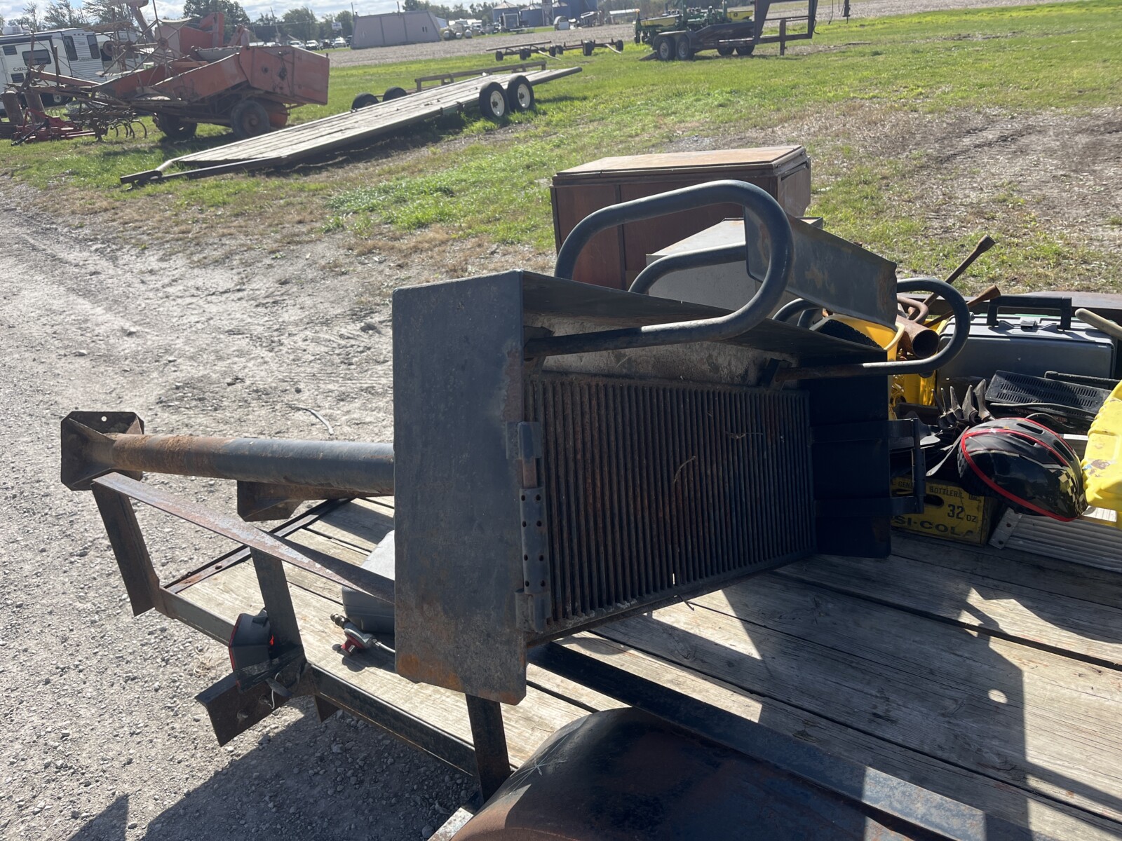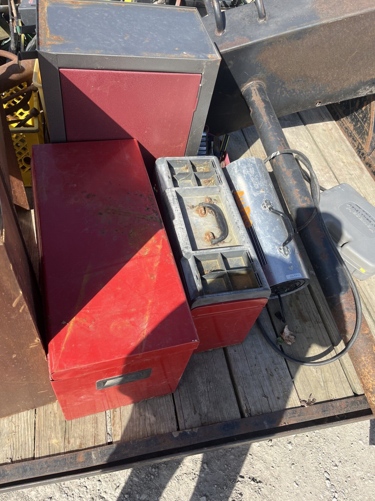 kerosene heaters; battery charger; ice augor; Scotts yard sprayer; air tanks; Tool boxes; table saw; chain saws; drills; misc. tools; air hose on reel; shovels; rakes; Predator 6500 generator up to 14.5 hrs. run time, gas only; clevis; bolts; (2) jack stands; pump; metal shelf; tin; lumber; ext. cords; (3) LP tanks; (2) 20′ Shipping Containers; ladders; saw; shop vac; weed eaters; clamps; metal shelves w/ doors; tin vegetable cages; canoe; motorcycle helmet; chain saw helmet; Lee powder measurer; Lee powder scale; Lee loader; well pumps; truck tool box; Cub Cadet shredder, chipper, vac; bumper hitch Dodge; Jacks; shovels; park style grill; cement trial; Gravely ZT XL-42, 69.9 hrs, Kawasaki FR651V; weed eaters, some for just parts; ladders; tiller; All-Pro heater; smokers; trolling motor; John Deere E110 riding lawn mower, 187 hrs;