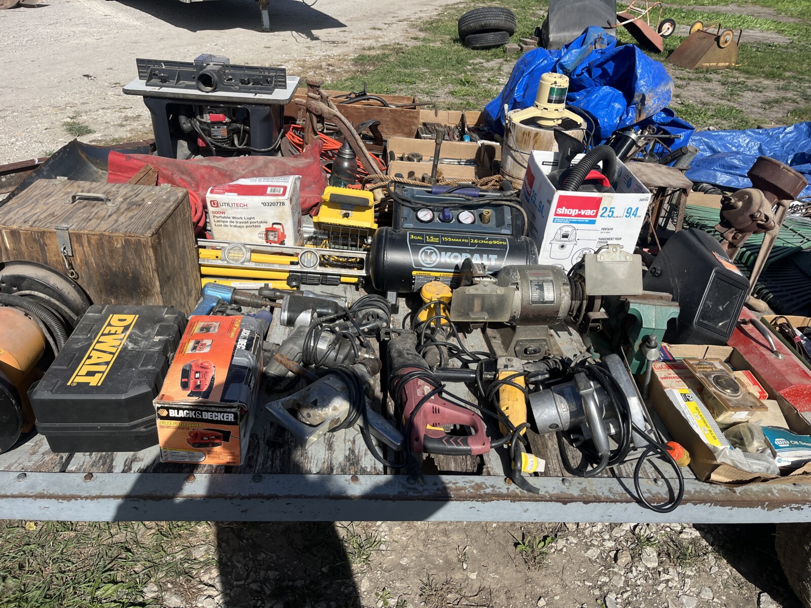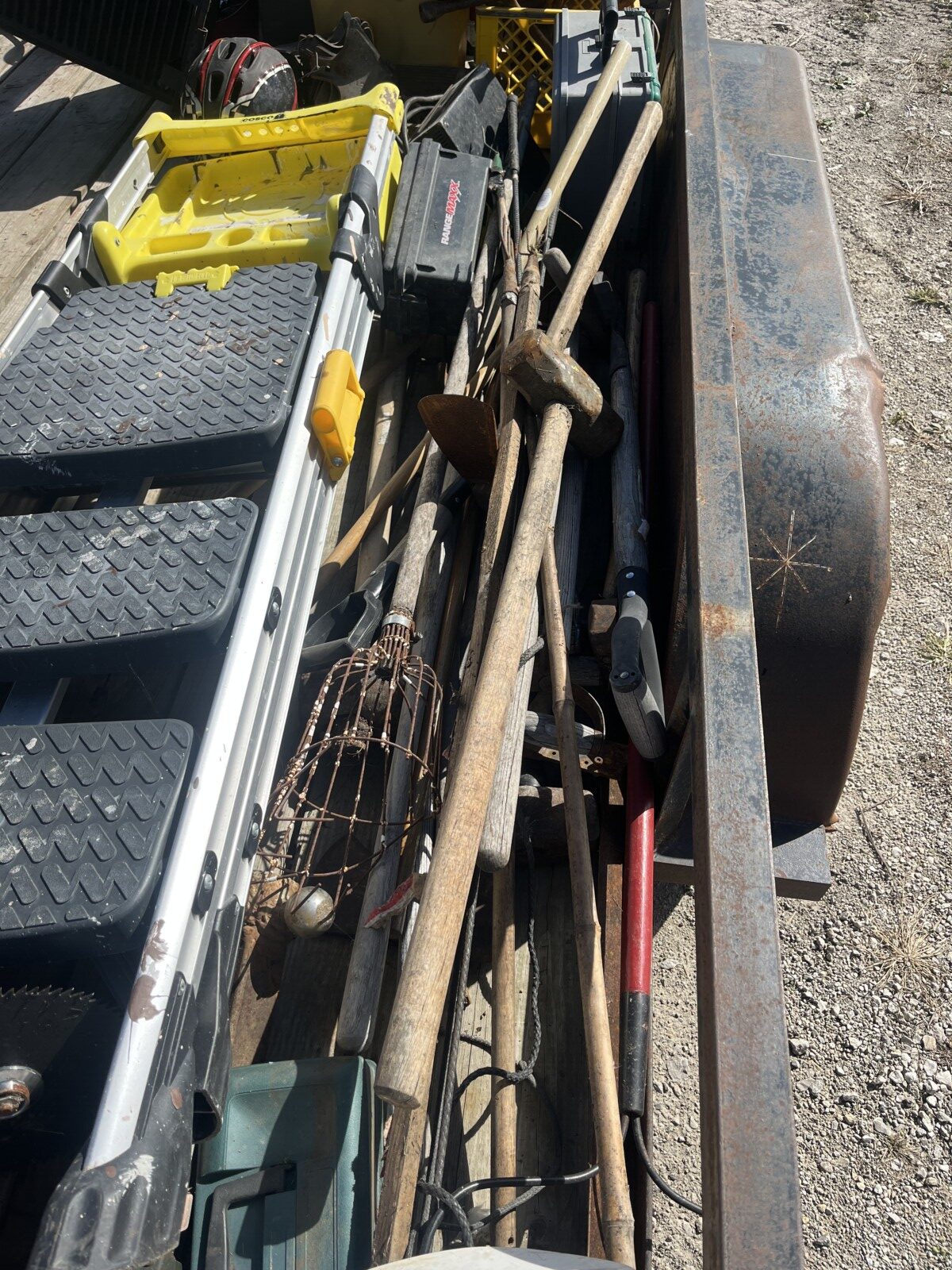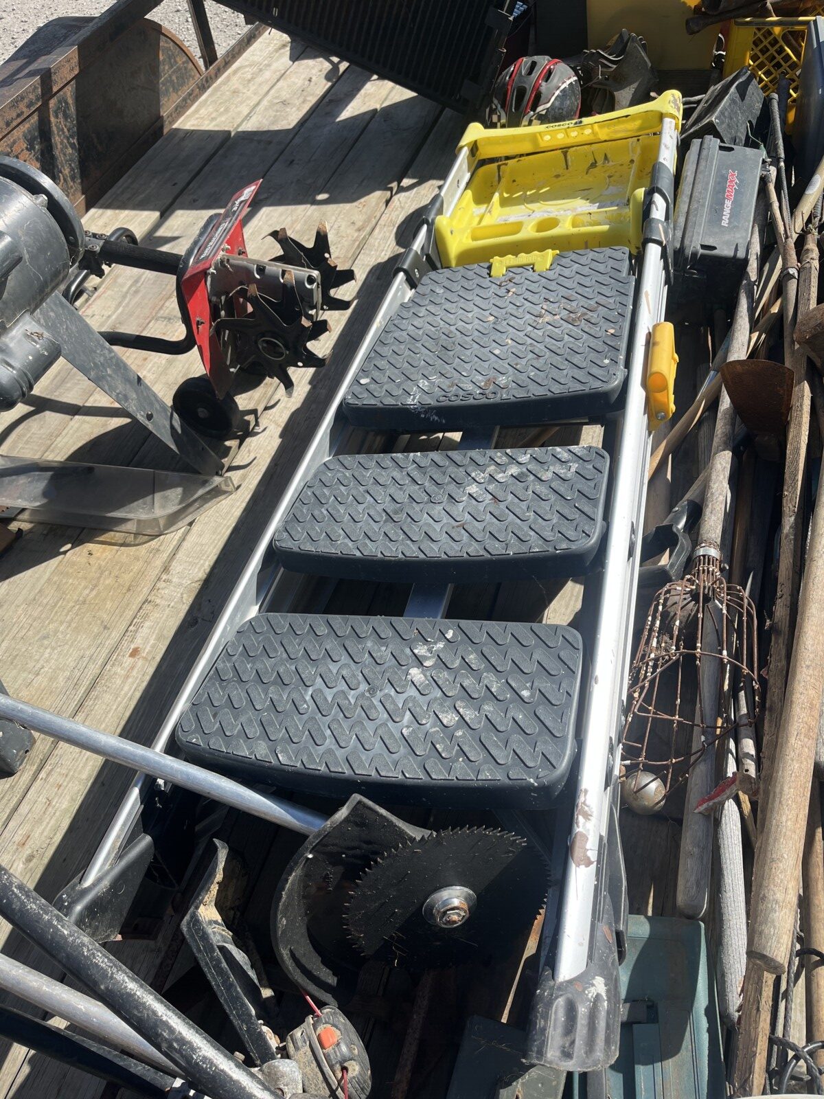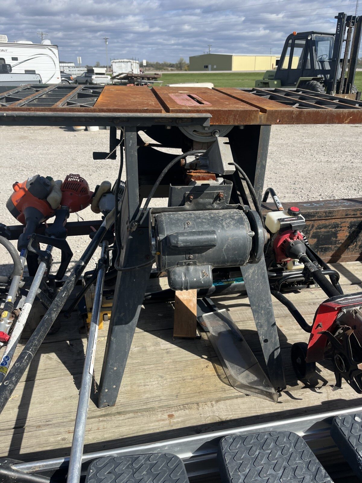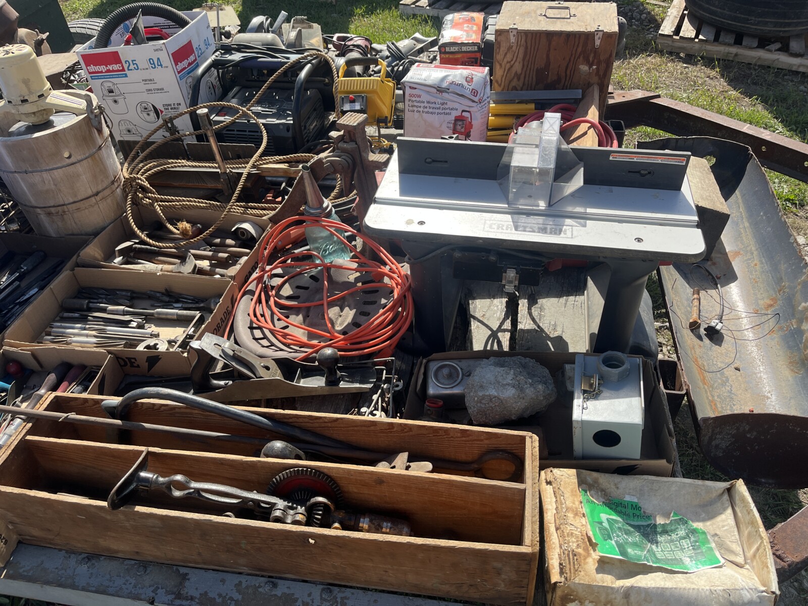 kerosene heaters; battery charger; ice augor; Scotts yard sprayer; air tanks; Tool boxes; table saw; chain saws; drills; misc. tools; air hose on reel; shovels; rakes; Predator 6500 generator up to 14.5 hrs. run time, gas only; clevis; bolts; (2) jack stands; pump; metal shelf; tin; lumber; ext. cords; (3) LP tanks; (2) 20′ Shipping Containers; ladders; saw; shop vac; weed eaters; clamps; metal shelves w/ doors; tin vegetable cages; canoe; motorcycle helmet; chain saw helmet; Lee powder measurer; Lee powder scale; Lee loader; well pumps; truck tool box; Cub Cadet shredder, chipper, vac; bumper hitch Dodge; Jacks; shovels; park style grill; cement trial; Gravely ZT XL-42, 69.9 hrs, Kawasaki FR651V; weed eaters, some for just parts; ladders; tiller; All-Pro heater; smokers; trolling motor; John Deere E110 riding lawn mower, 187 hrs;
