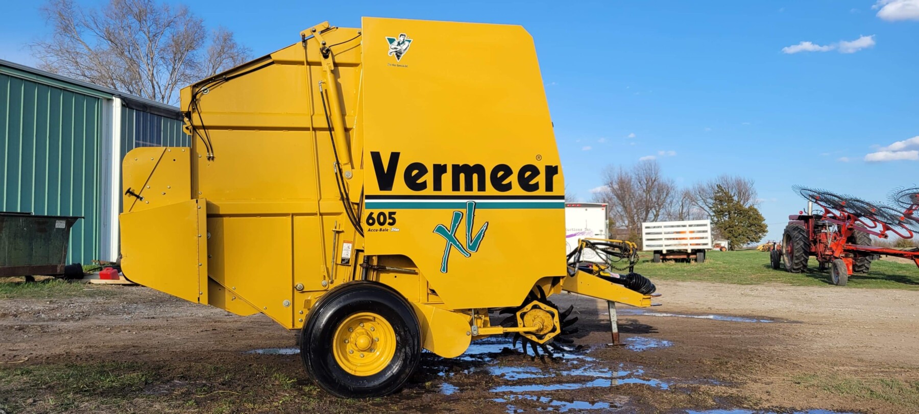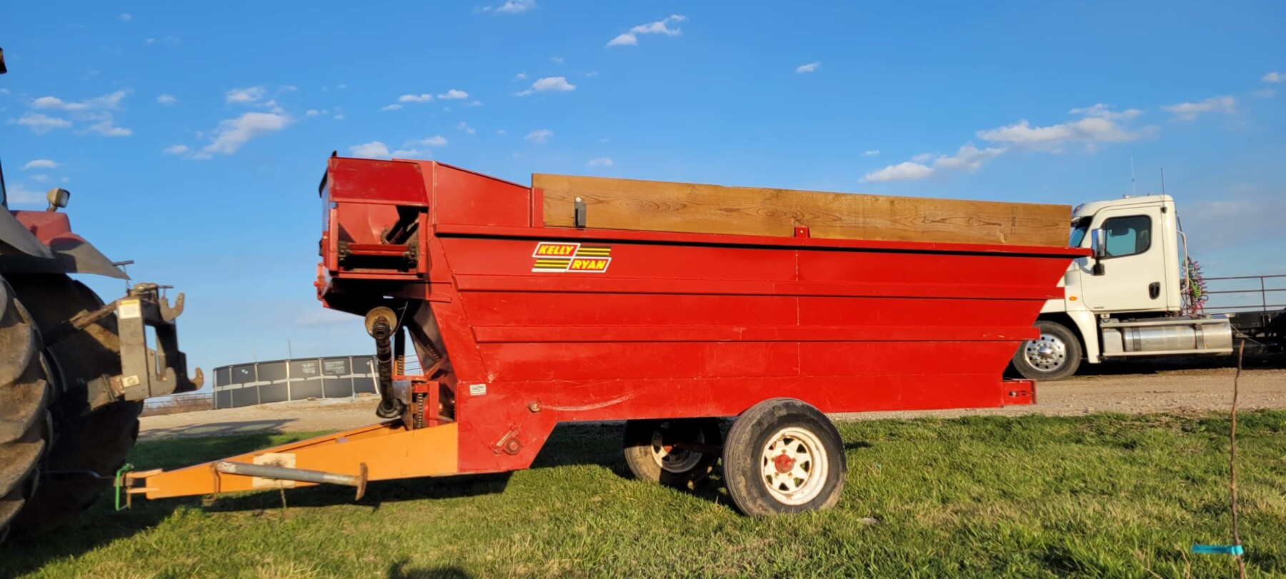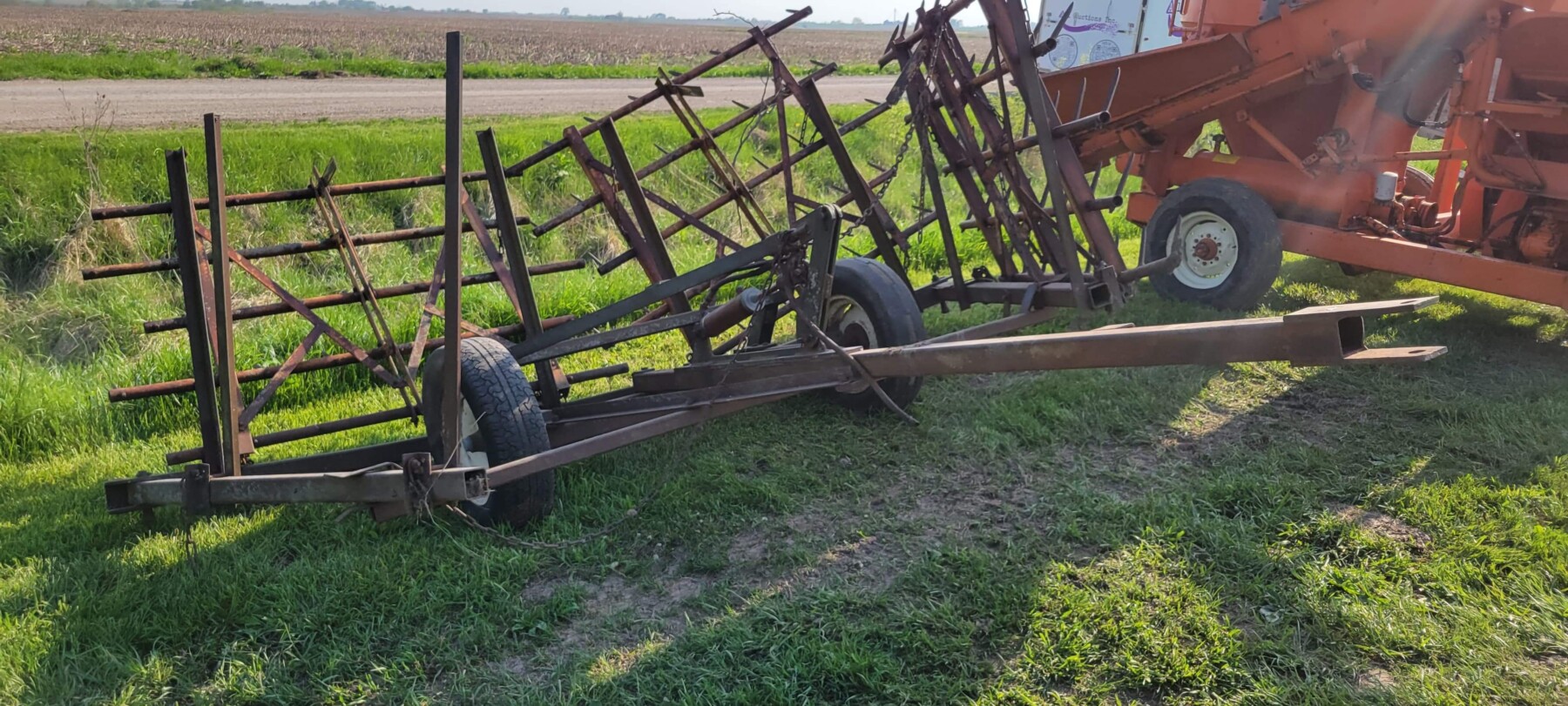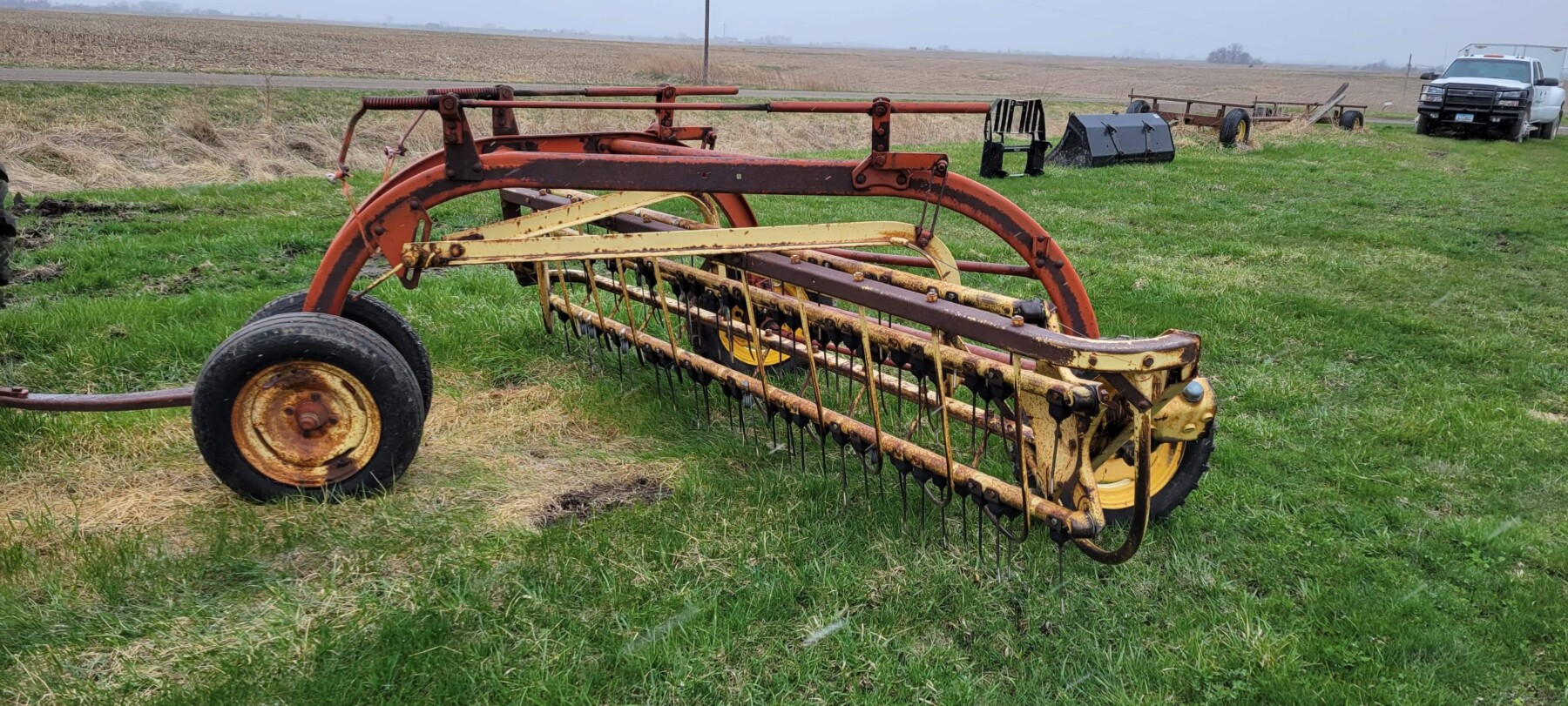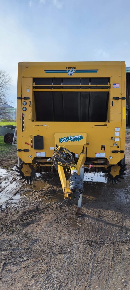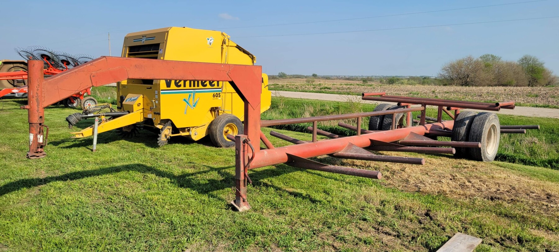 520 Ford New Holland manure spreader, good floor, good chain, 540 pto; NVHL Bison 3 way blade, stout; (2) hydraulic hay bale unrollers, 3 pt; 258 New Holland rake w/ dolly wheels; International 490 disc, 22′; 500 gal. fuel barrel w/ pump; 300 gal fuel barrel w/ pump; 16’x10′ portable shed, steel sides and roof; Feed Train 3000 bulk bin on wheels, 3200 lbs; Westfield grain auger W80 pto hand crank, 8″; hay rack (needs work) w/ good running gears; 4 section harrow cart; Bear Cat 950 grinder mixer; 3pt quick hitch; end gate seeder; MYD Handy cake feeder; International 710 5 bottom plow, 16″; (12) 24′ trusses, 26′ at base with over hang; JD 4 row planter; Powder River squeeze chute; old wooden doors; Schulte FX-1800, 15′ batwing, serial#C18511332711; Kuhn FC 353 GC disc mower conditioner pull type (needs repairs); Kuhn SR112 speed rake; Kuhn GMD 700-G2, HD 9′, 3pt disc mower; 8 bale pipe hay hauler; 605 Vermeer baler w/ Accu bale monitor; OMI chain harrow, serial #000775; WW steel stock trailer; small amount of smalls