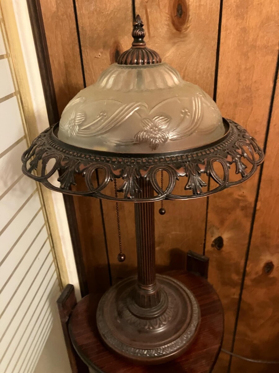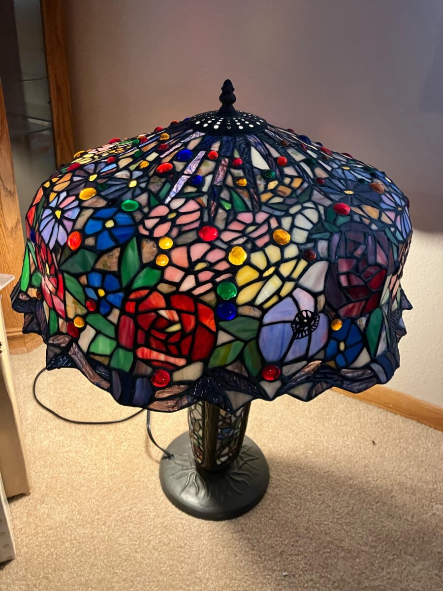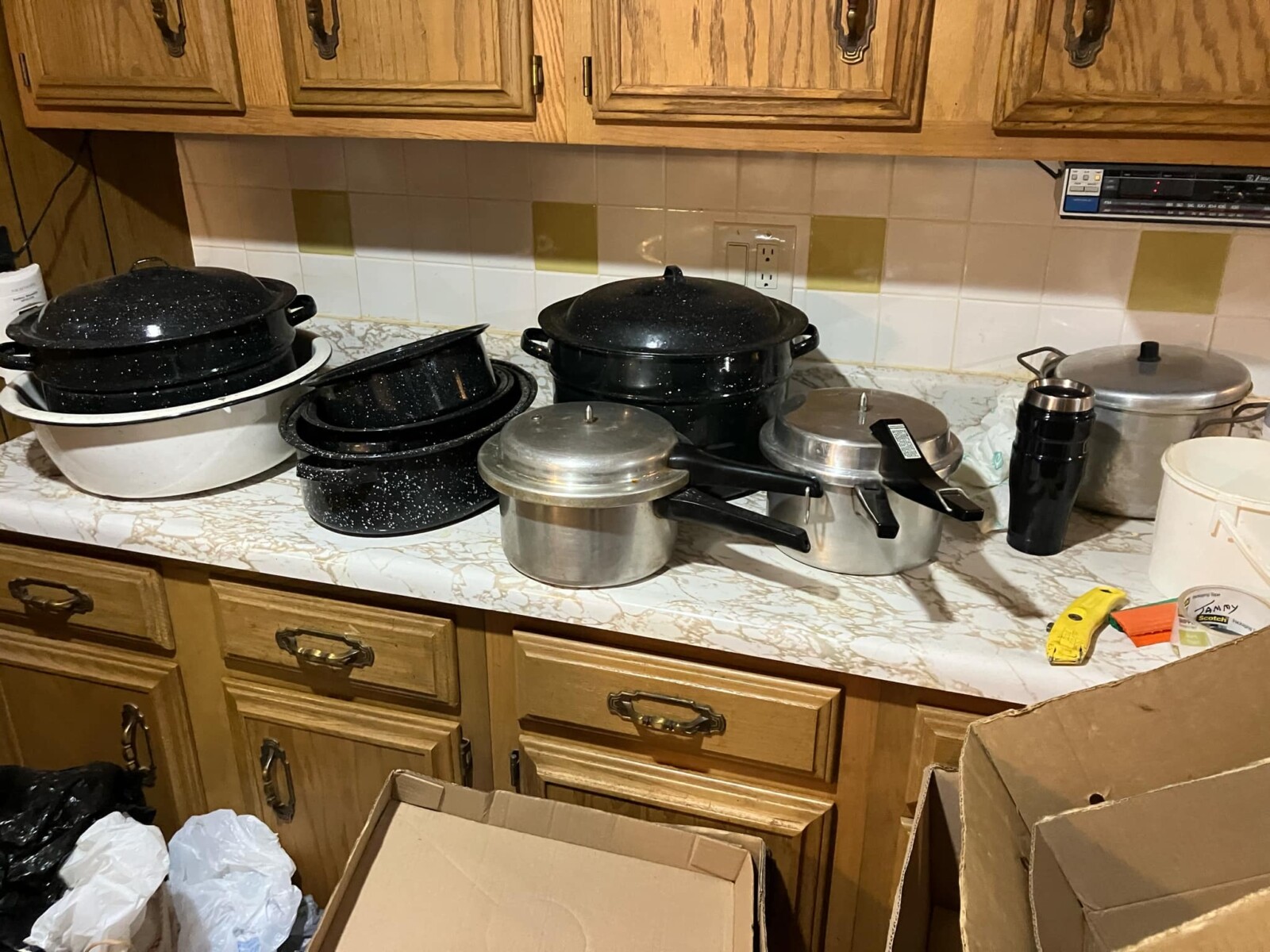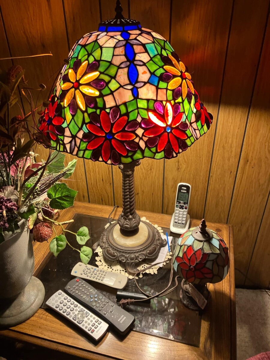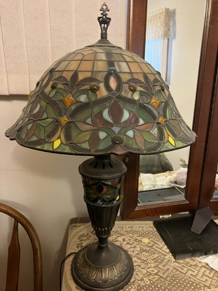 (3) Flat screen, 17″,24″, 32″; Curio cabinet; Terry Redlin print “Our Friends”; Terry Redlin print “Sunday Morning”; Tiffany style floor lamp; multiple Tiffany style table lamps, (2) matching; (2) Hurricane lamps; antique clock w/ key; Glider Rocker w/ matching footstool; blue swivel rocker; burgandy recliner; brown Lazy Boy recliner; bunk beds (2sets); 5 drawer chest of drawers; large 9 drawer dresser w/ trifold mirror; white Wicker makeup vanity; kids colorful shelves w/ 2 drawers & small wardrobe; Occasional round table; wooden drop leaf kitchen table w/ 4 chairs; bedding and quilts, Chenille bedspread; misc. antiques; luggage “Gordache” (2 piece); Kenmore side by side refrigerator; TV Pampered Chef; lots of Tupperware; lots of canning jars, Kerr & Ball; canning supplies; butter churn; blue Correlle dishes, gold Correlle dishes; cake pans; cookie sheets; casserole dishes and much more;