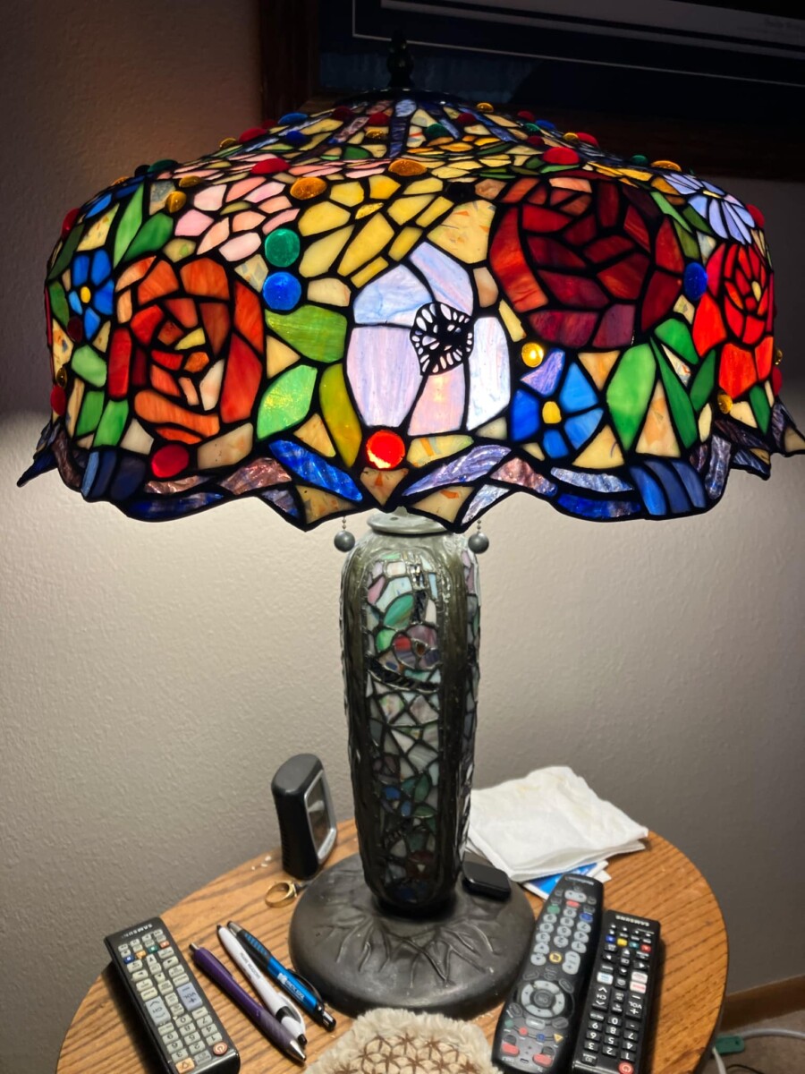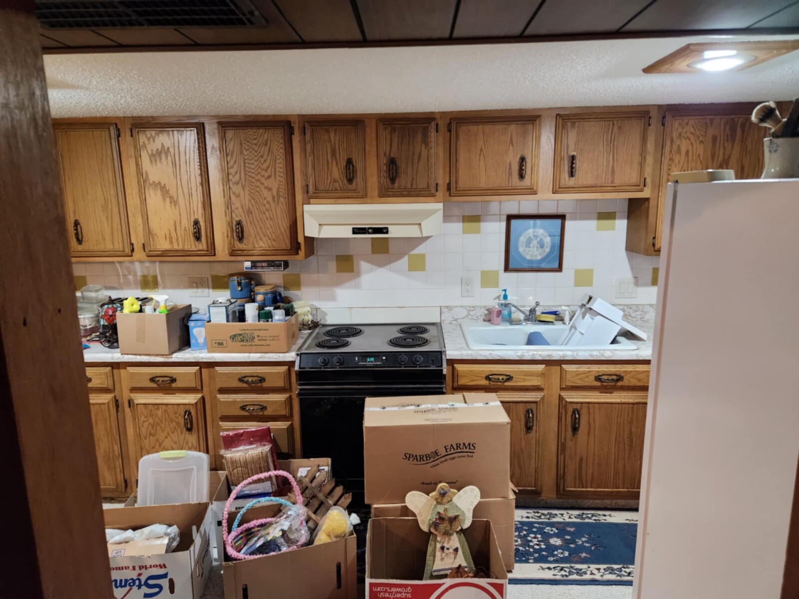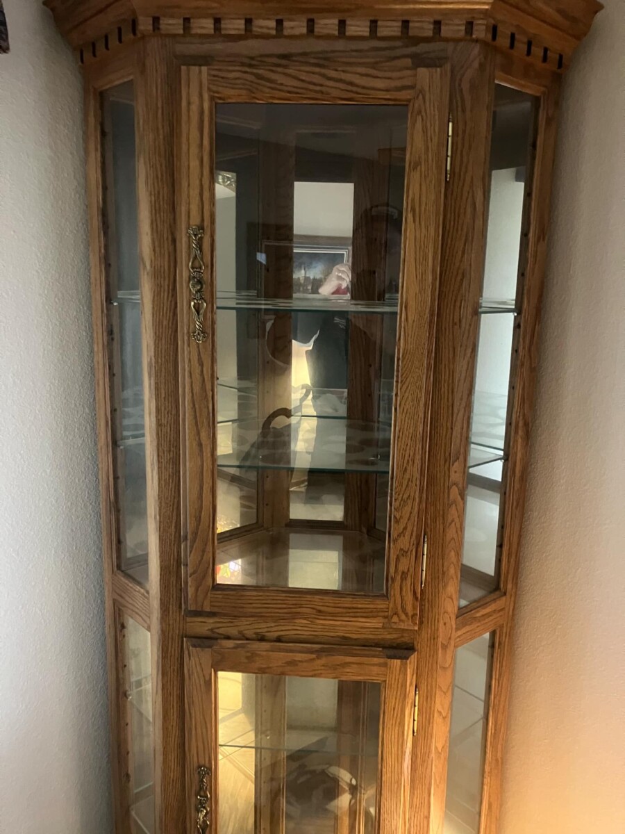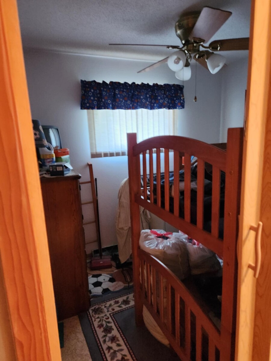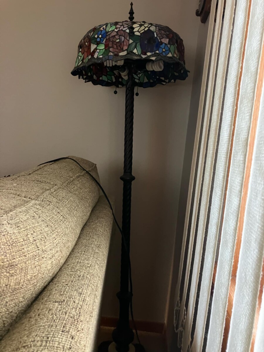 (3) Flat screen, 17″,24″, 32″; Curio cabinet; Terry Redlin print “Our Friends”; Terry Redlin print “Sunday Morning”; Tiffany style floor lamp; multiple Tiffany style table lamps, (2) matching; (2) Hurricane lamps; antique clock w/ key; Glider Rocker w/ matching footstool; blue swivel rocker; burgandy recliner; brown Lazy Boy recliner; bunk beds (2sets); 5 drawer chest of drawers; large 9 drawer dresser w/ trifold mirror; white Wicker makeup vanity; kids colorful shelves w/ 2 drawers & small wardrobe; Occasional round table; wooden drop leaf kitchen table w/ 4 chairs; bedding and quilts, Chenille bedspread; misc. antiques; luggage “Gordache” (2 piece); Kenmore side by side refrigerator; TV Pampered Chef; lots of Tupperware; lots of canning jars, Kerr & Ball; canning supplies; butter churn; blue Correlle dishes, gold Correlle dishes; cake pans; cookie sheets; casserole dishes and much more;