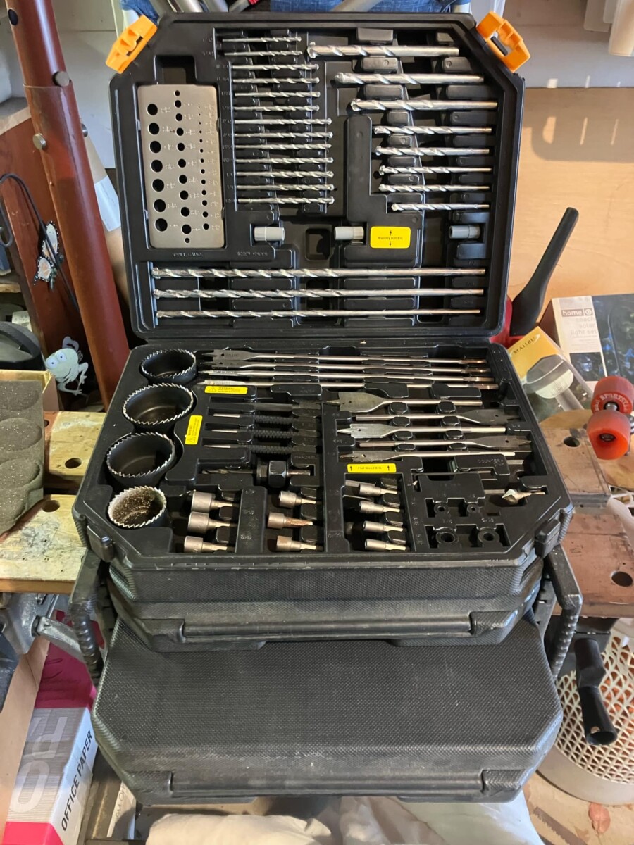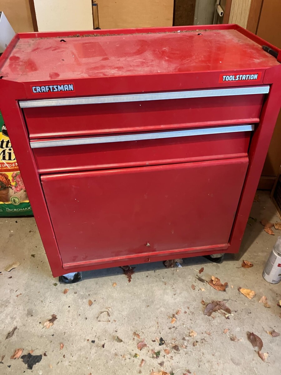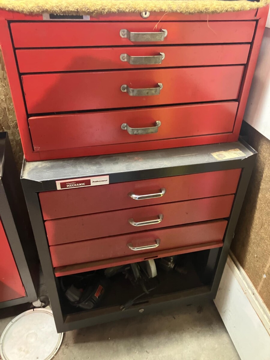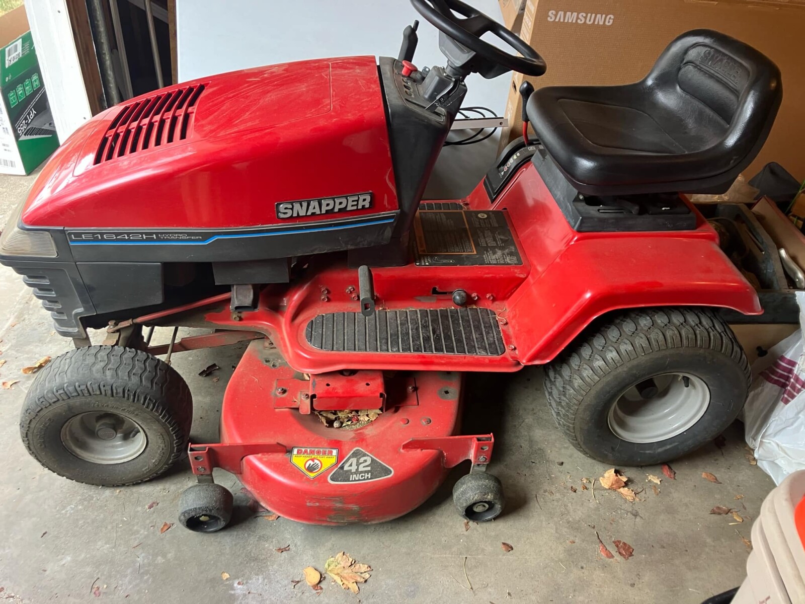 1994 Snapper 42″ hydrostat lawn mower; Echo weed eater, like new; Craftsman toolbox; Makita saws all; Skilsaw; Master Mechanic Homak toolbox, and side cart; Black & Decker workmate; Large case drill bit set; Skil Table saw; Tool Shop compound miter saw;