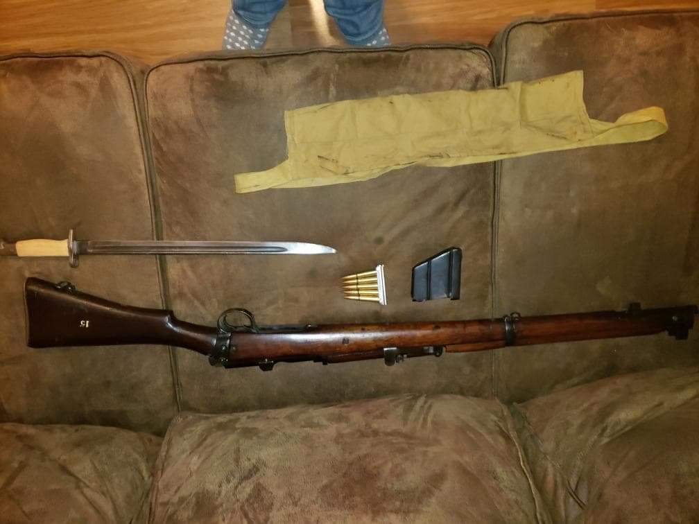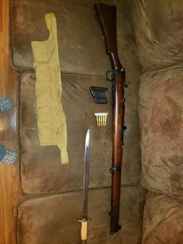 2-20 gauge Remington 870 shotguns; 1-12 gauge Remington 870 trap shotgun very nice wood; 1-Marlin 39A .22 Rifle; 1-Marlin 39D .22 Rifle; 2-High Standard .22 auto handguns; .45 gauge Muzzleloader that is a Mosin Nagant made in 1944 to kill Nazis, excellent condition; 1- Lee Enfield No. 1 Mark 3, comes with bayonet, stripper clips and over 120 rounds of ammunition.