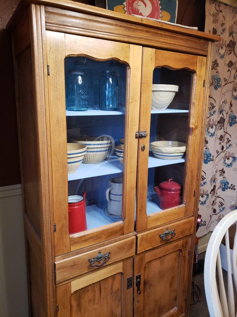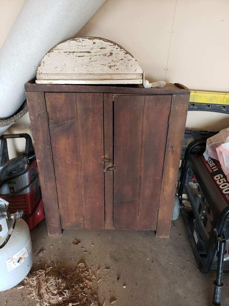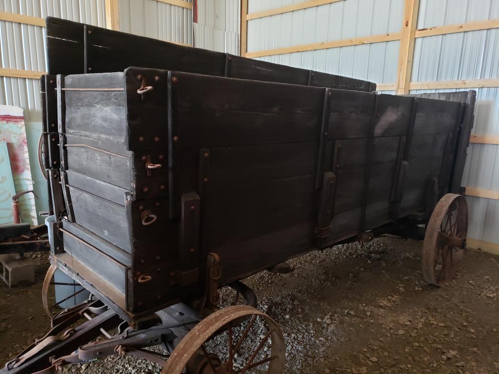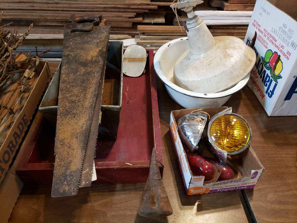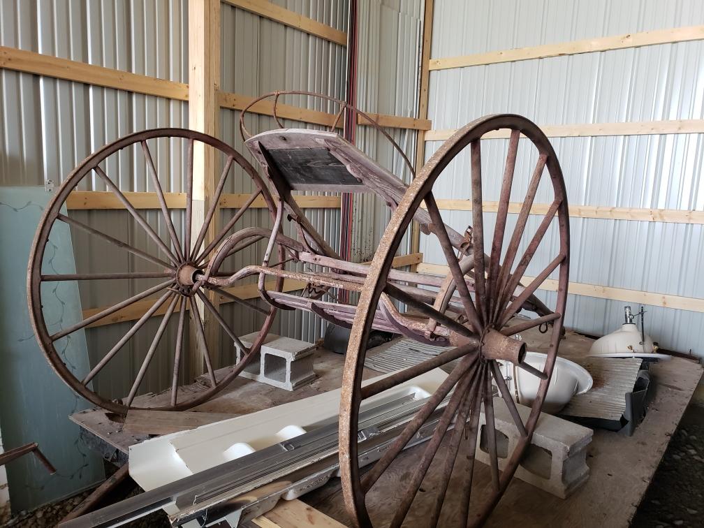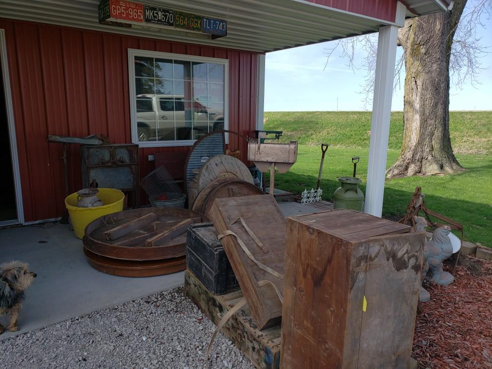 Wooden corn picking wagon; wooden sulky; steel wheels; oil lamps; horse-drawn/hand implements; farm tools; showcase cabinet with cast iron feet; beautiful pocket doors; stacks of various length barn board and other wood; (2) pie cabinets, one with tin door inserts; other cabinets; crocks; stoneware; corn shellers; chairs; wash tubs; scale; cream cans; very nice wooden ice refrigerator
