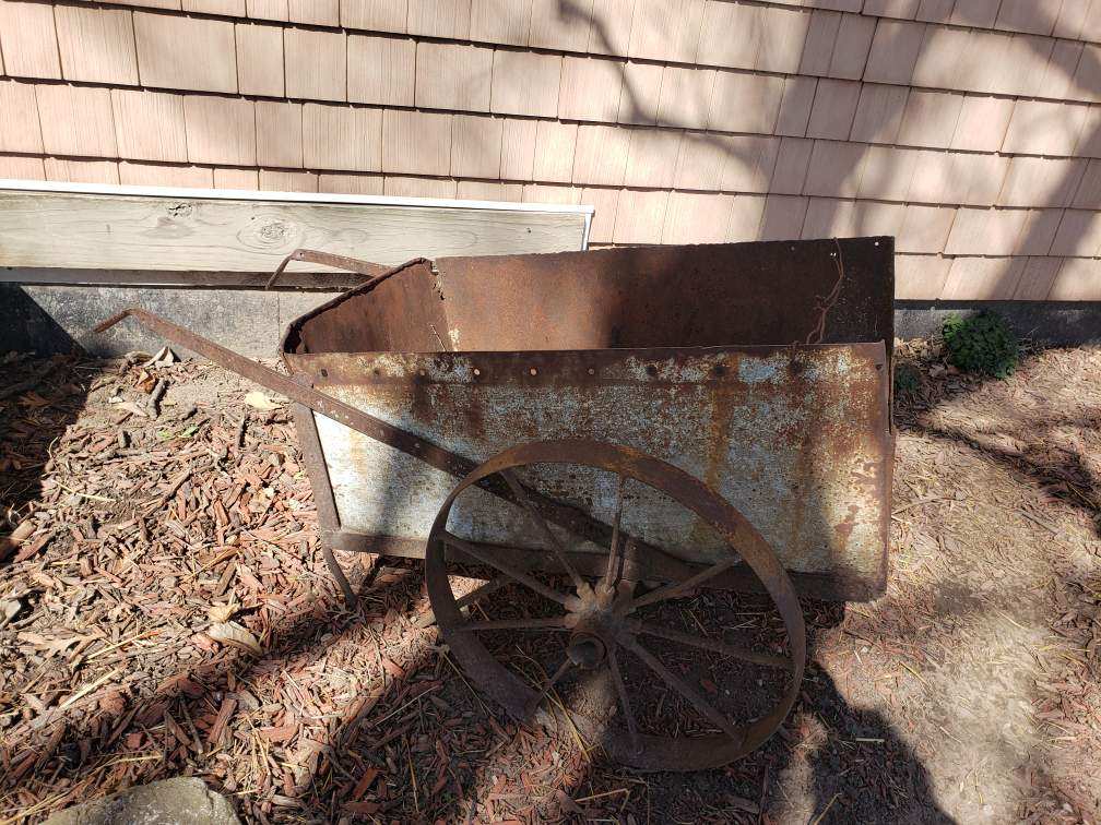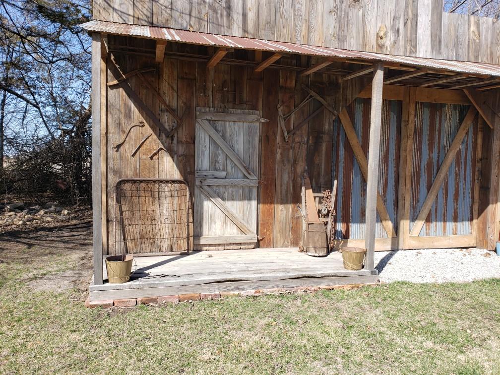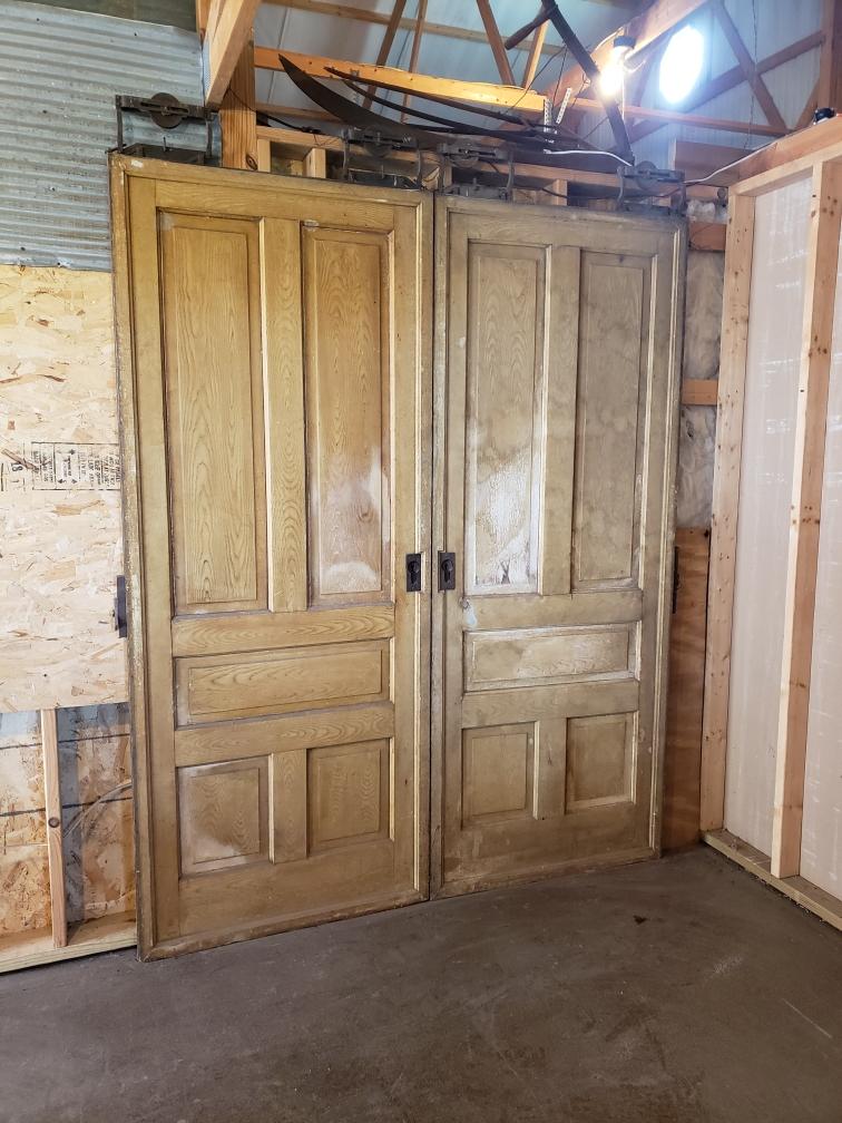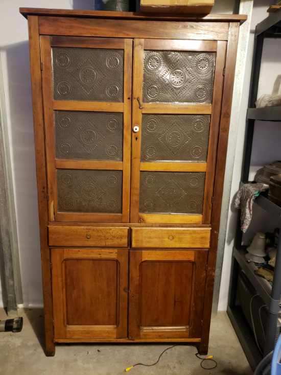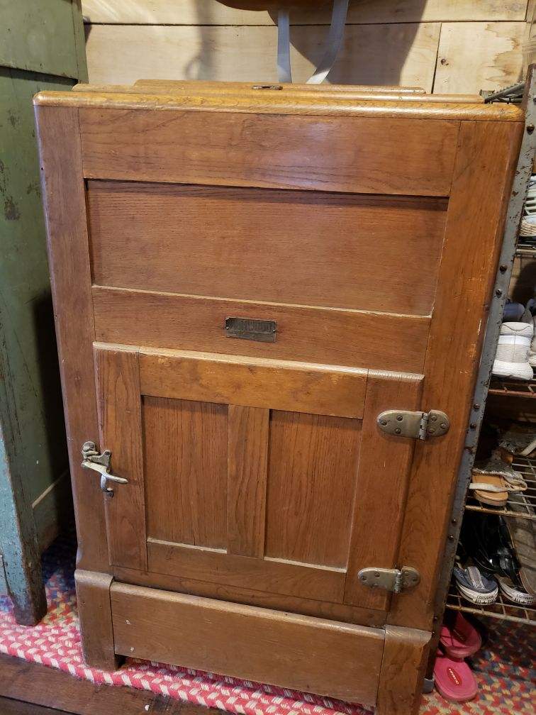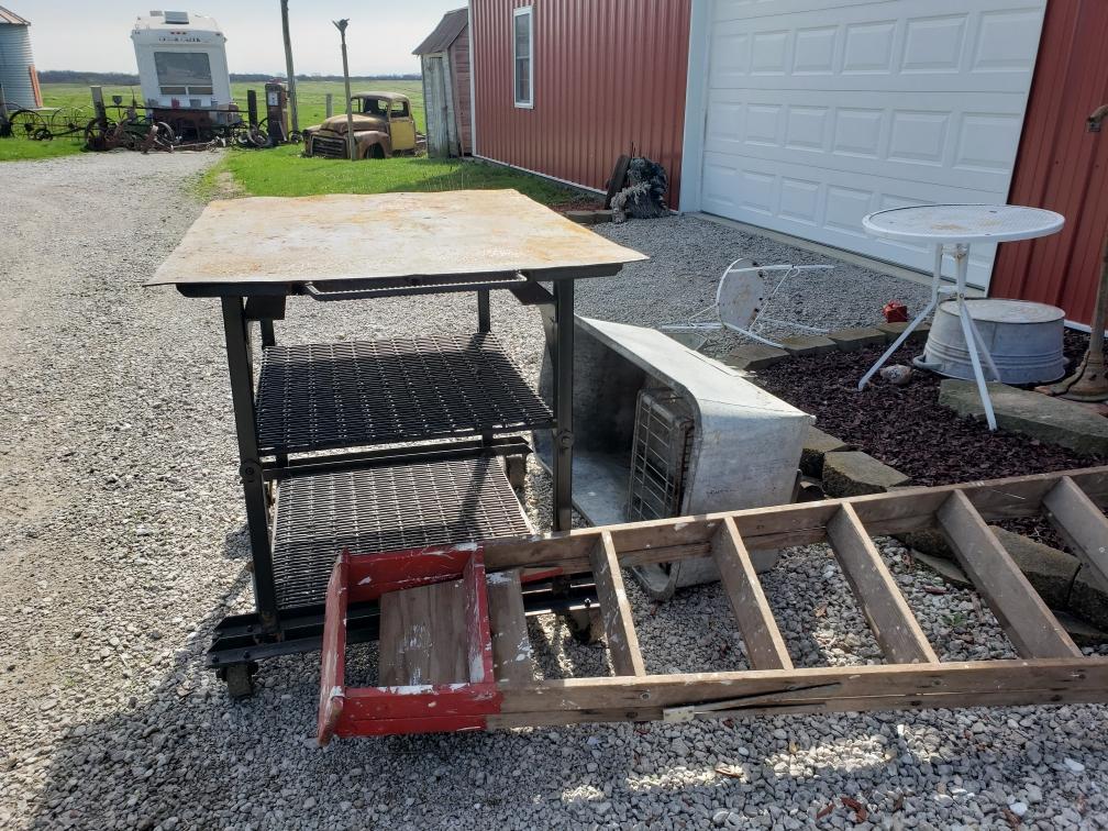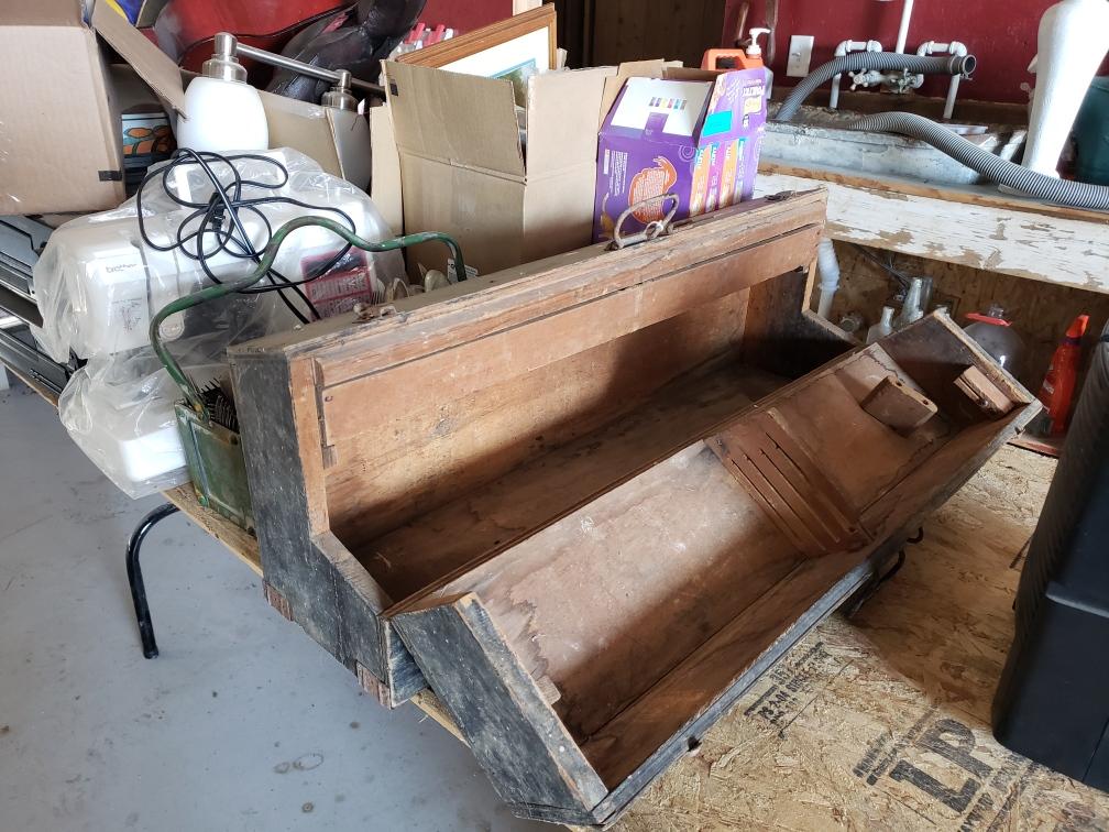 Wooden corn picking wagon; wooden sulky; steel wheels; oil lamps; horse-drawn/hand implements; farm tools; showcase cabinet with cast iron feet; beautiful pocket doors; stacks of various length barn board and other wood; (2) pie cabinets, one with tin door inserts; other cabinets; crocks; stoneware; corn shellers; chairs; wash tubs; scale; cream cans; very nice wooden ice refrigerator