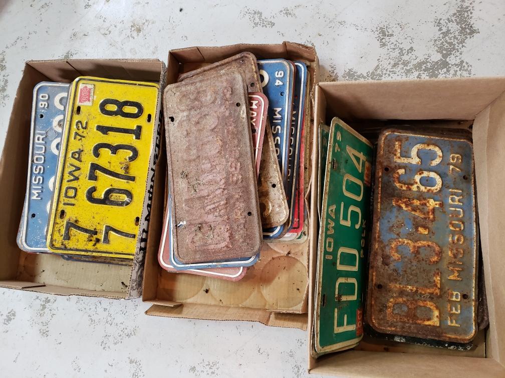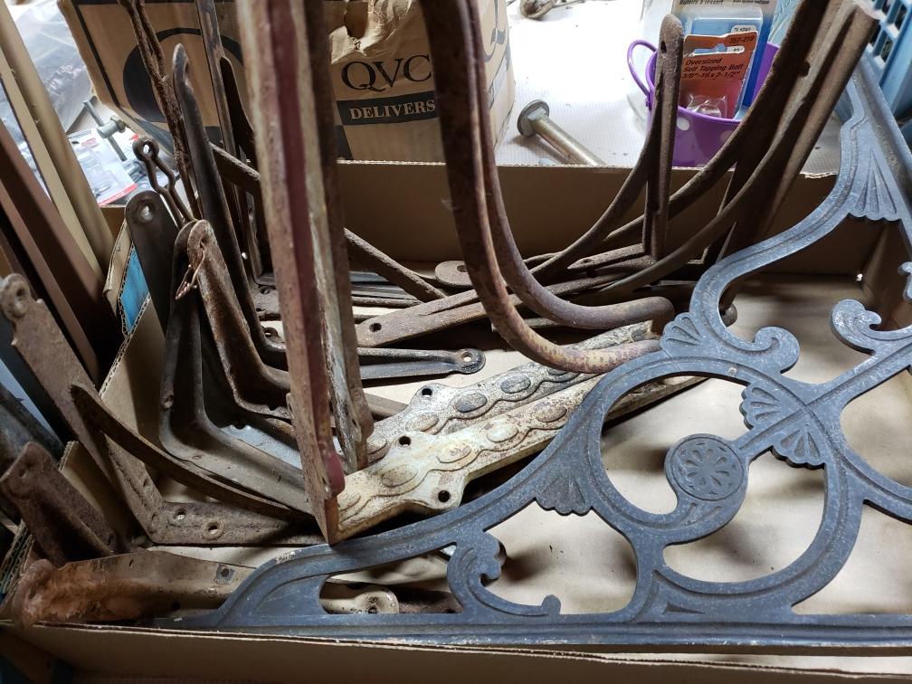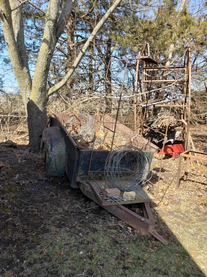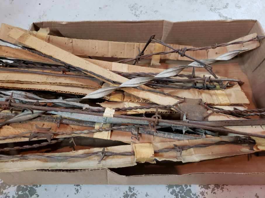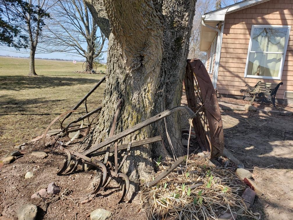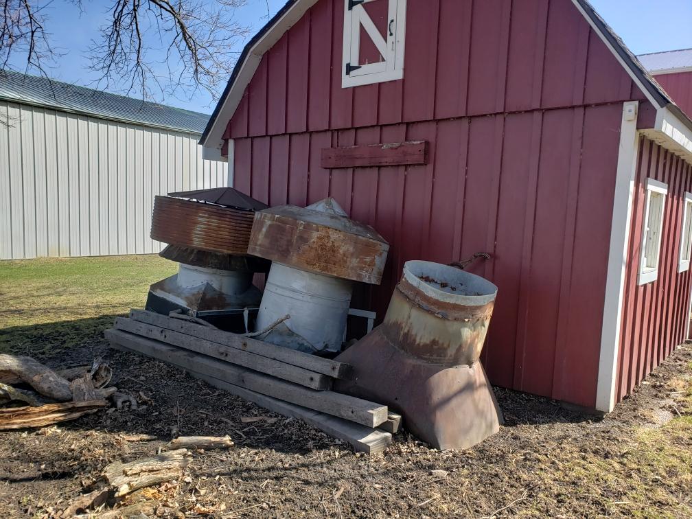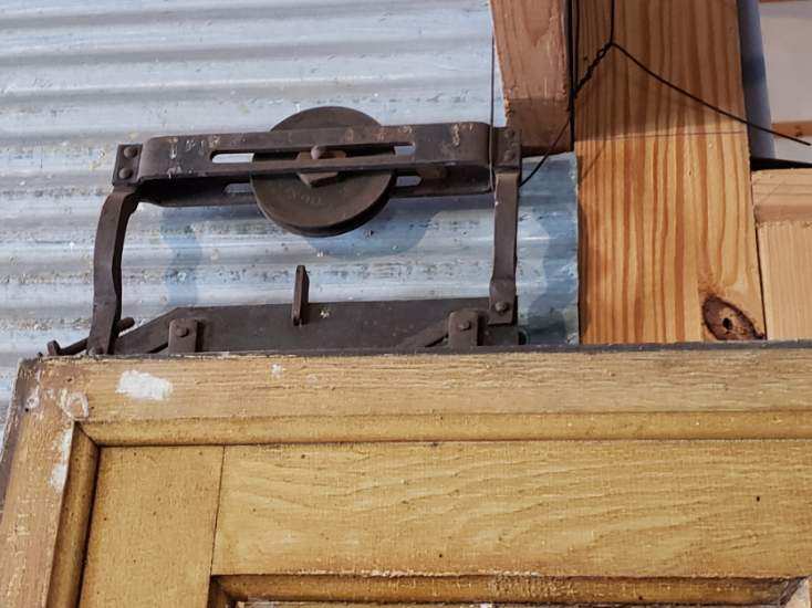 Wooden corn picking wagon; wooden sulky; steel wheels; oil lamps; horse-drawn/hand implements; farm tools; showcase cabinet with cast iron feet; beautiful pocket doors; stacks of various length barn board and other wood; (2) pie cabinets, one with tin door inserts; other cabinets; crocks; stoneware; corn shellers; chairs; wash tubs; scale; cream cans; very nice wooden ice refrigerator