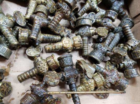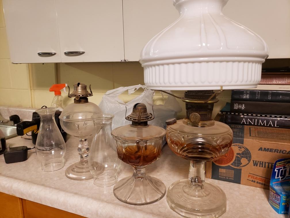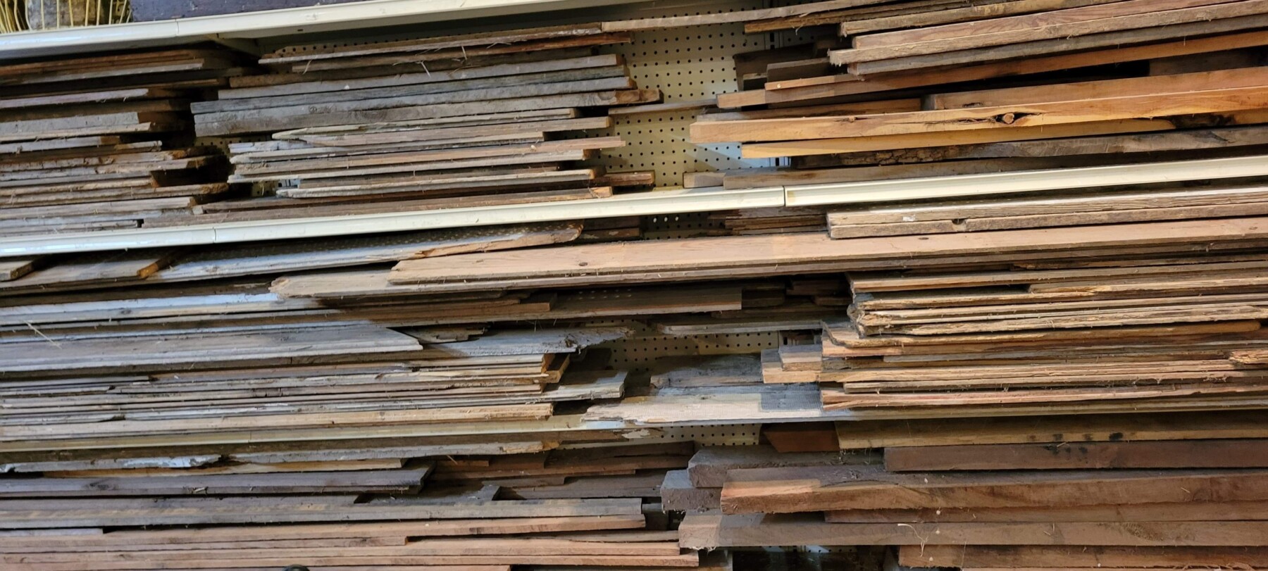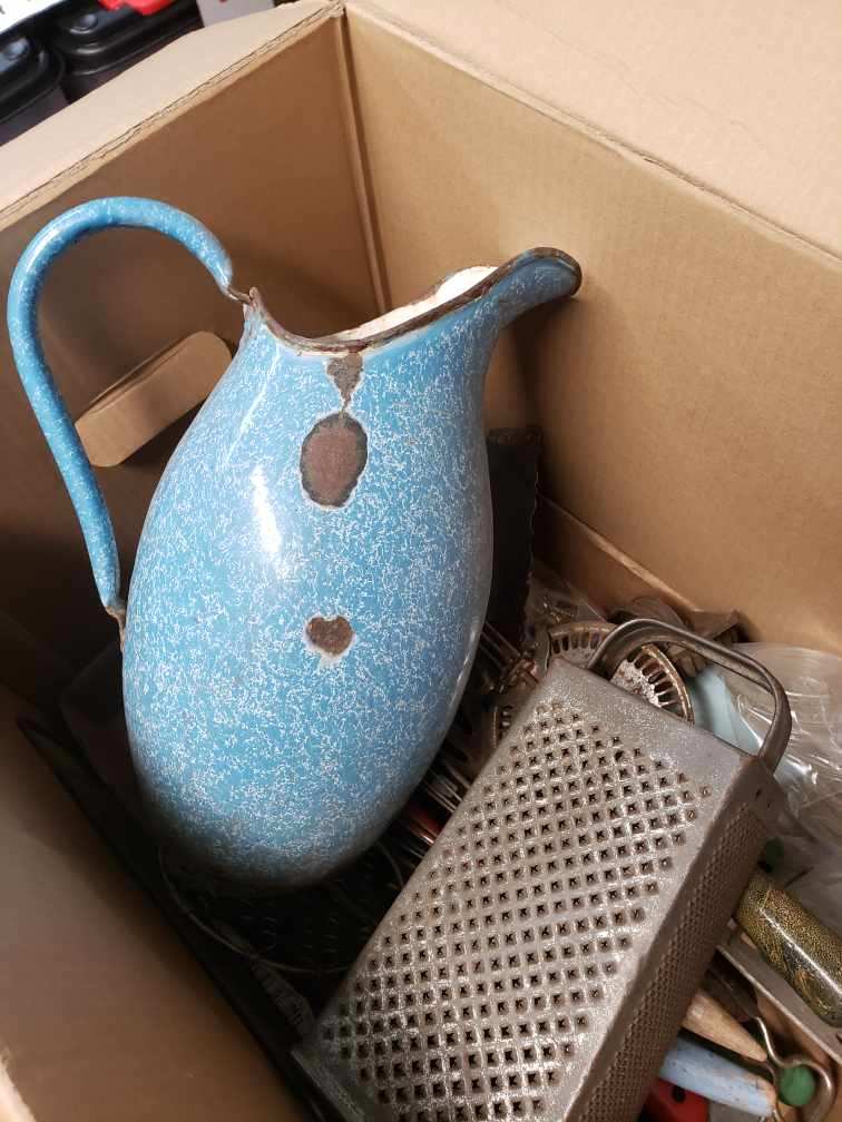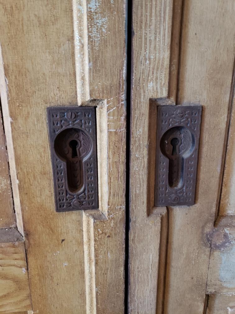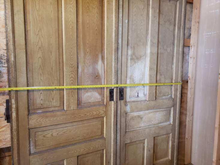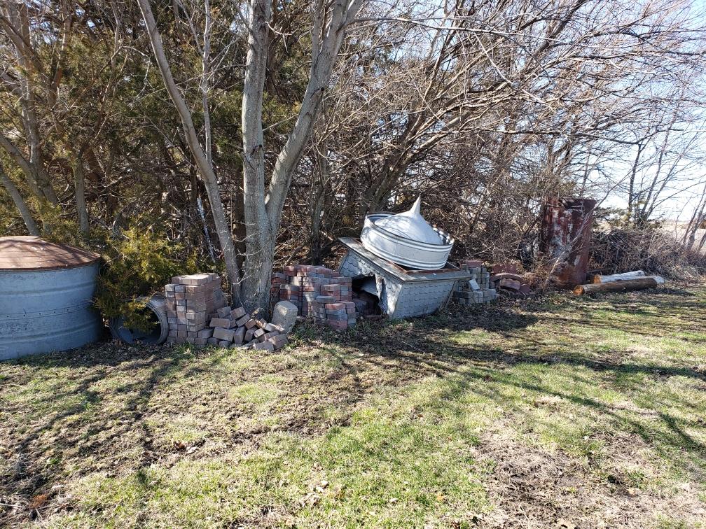 Wooden corn picking wagon; wooden sulky; steel wheels; oil lamps; horse-drawn/hand implements; farm tools; showcase cabinet with cast iron feet; beautiful pocket doors; stacks of various length barn board and other wood; (2) pie cabinets, one with tin door inserts; other cabinets; crocks; stoneware; corn shellers; chairs; wash tubs; scale; cream cans; very nice wooden ice refrigerator