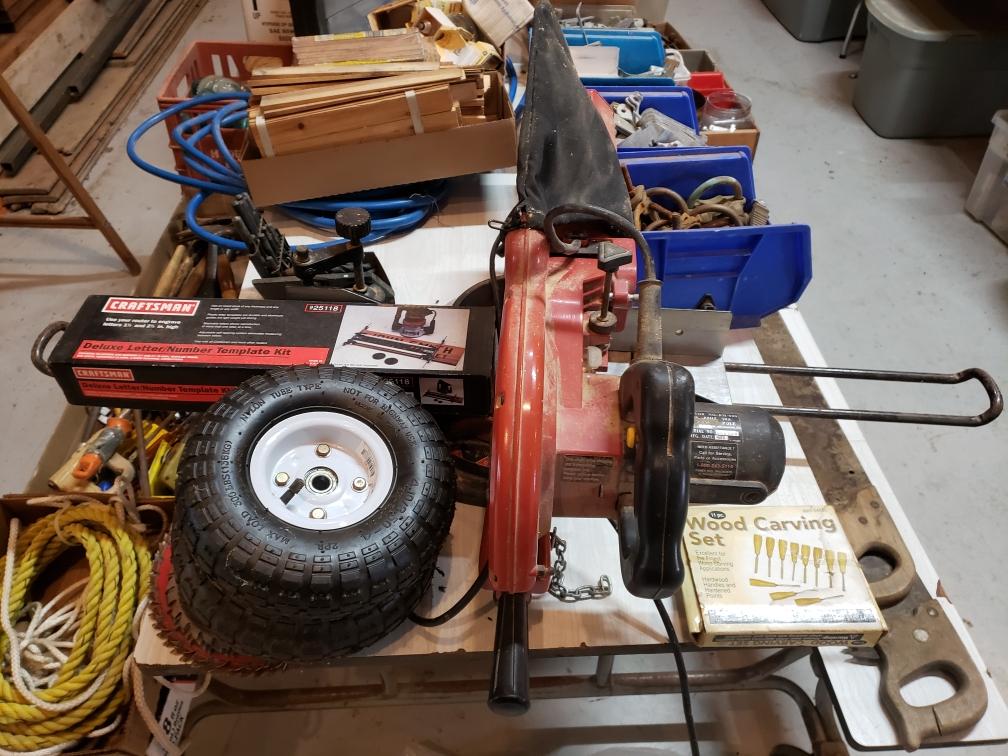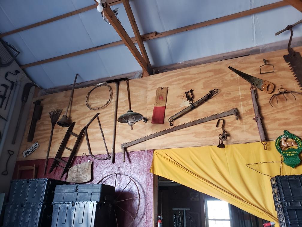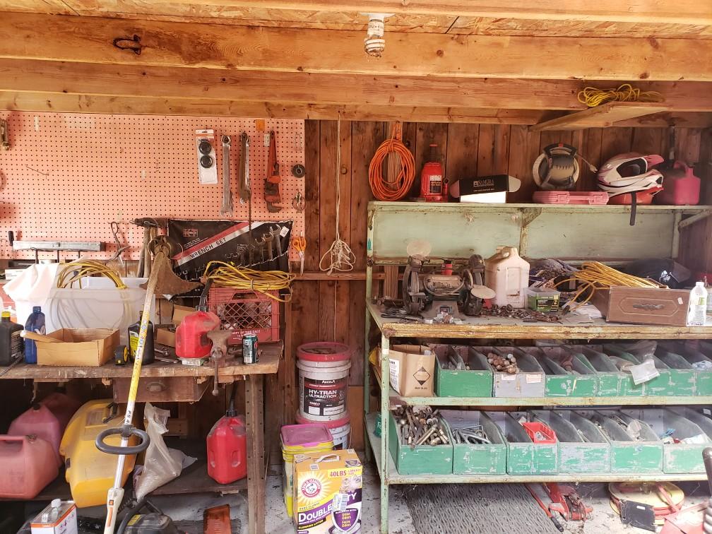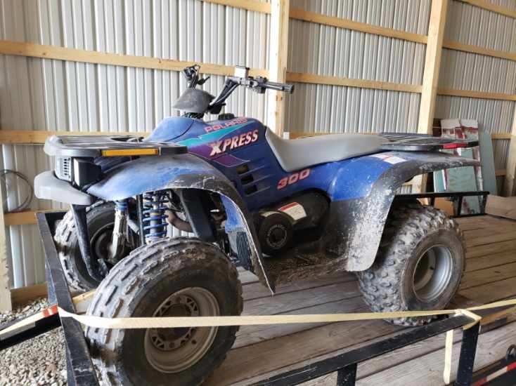 1997 Polaris Express 300 2×4 atv in very nice condition; rear-tine tiller; power washers; shop tools; work benches; garden tools; huge collection antique barb wire;