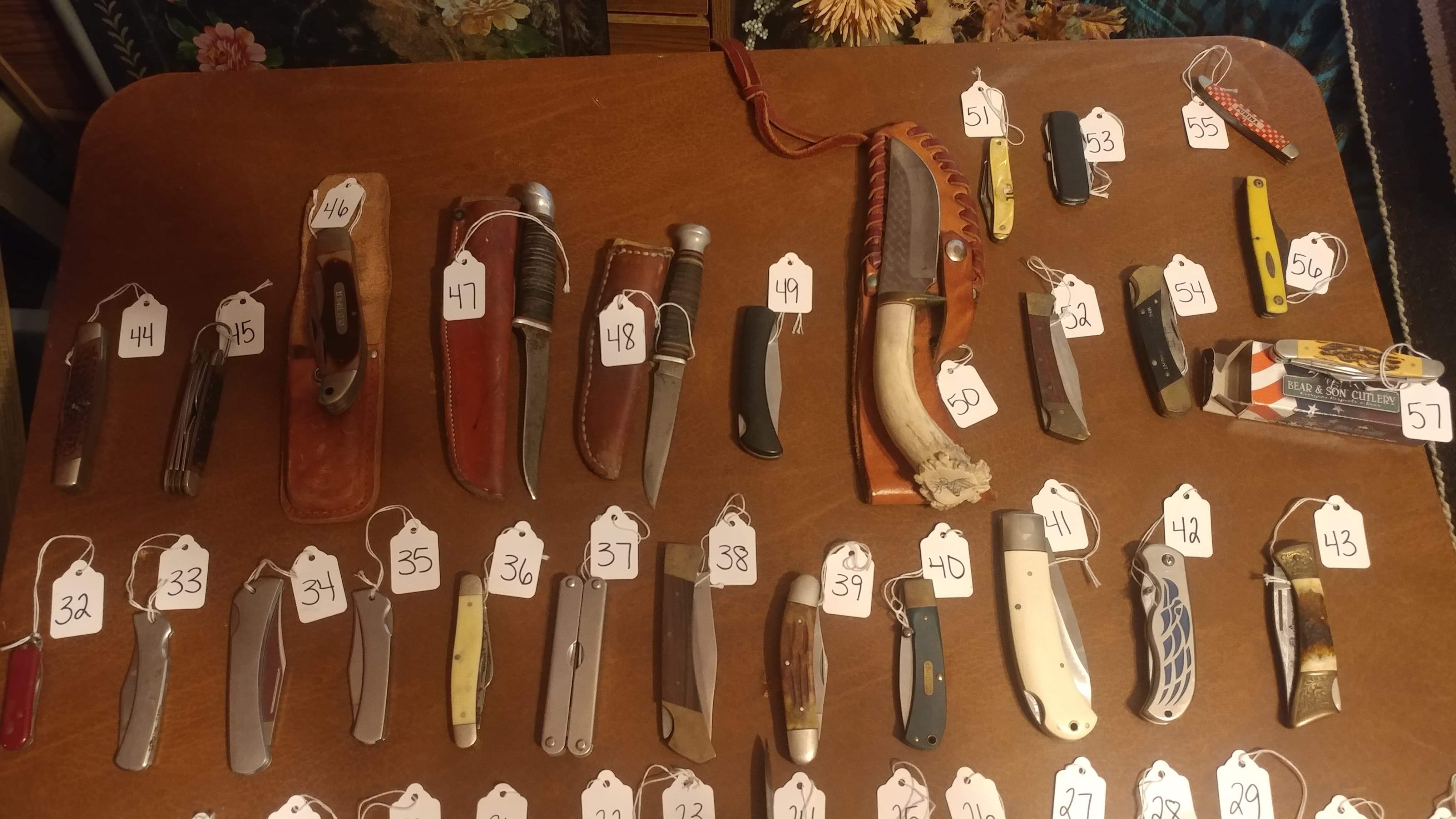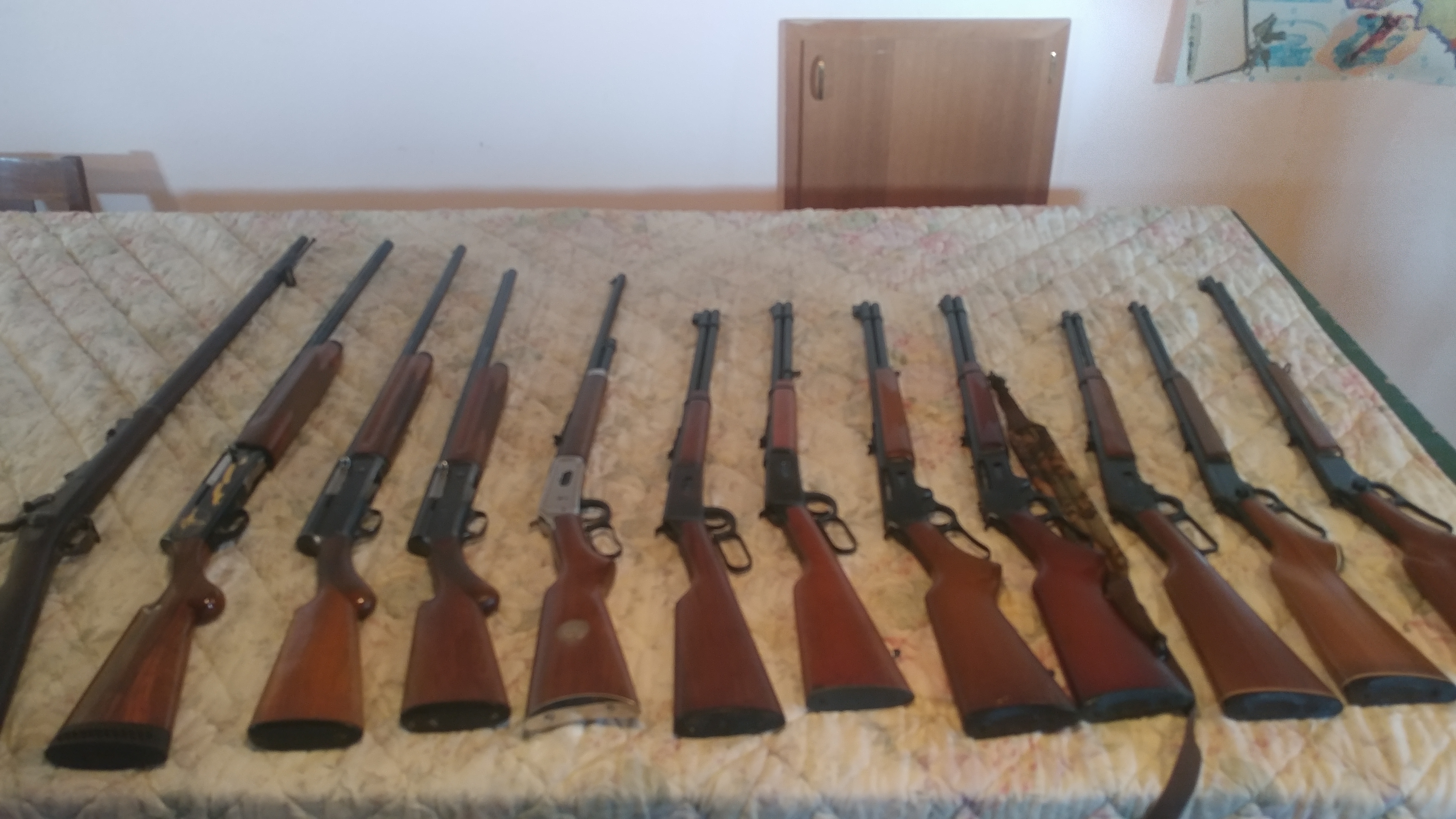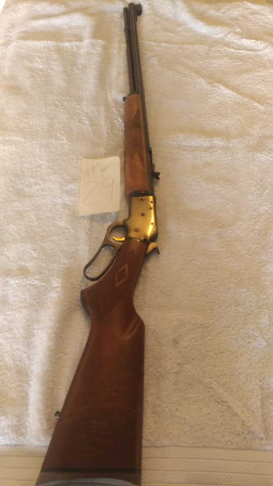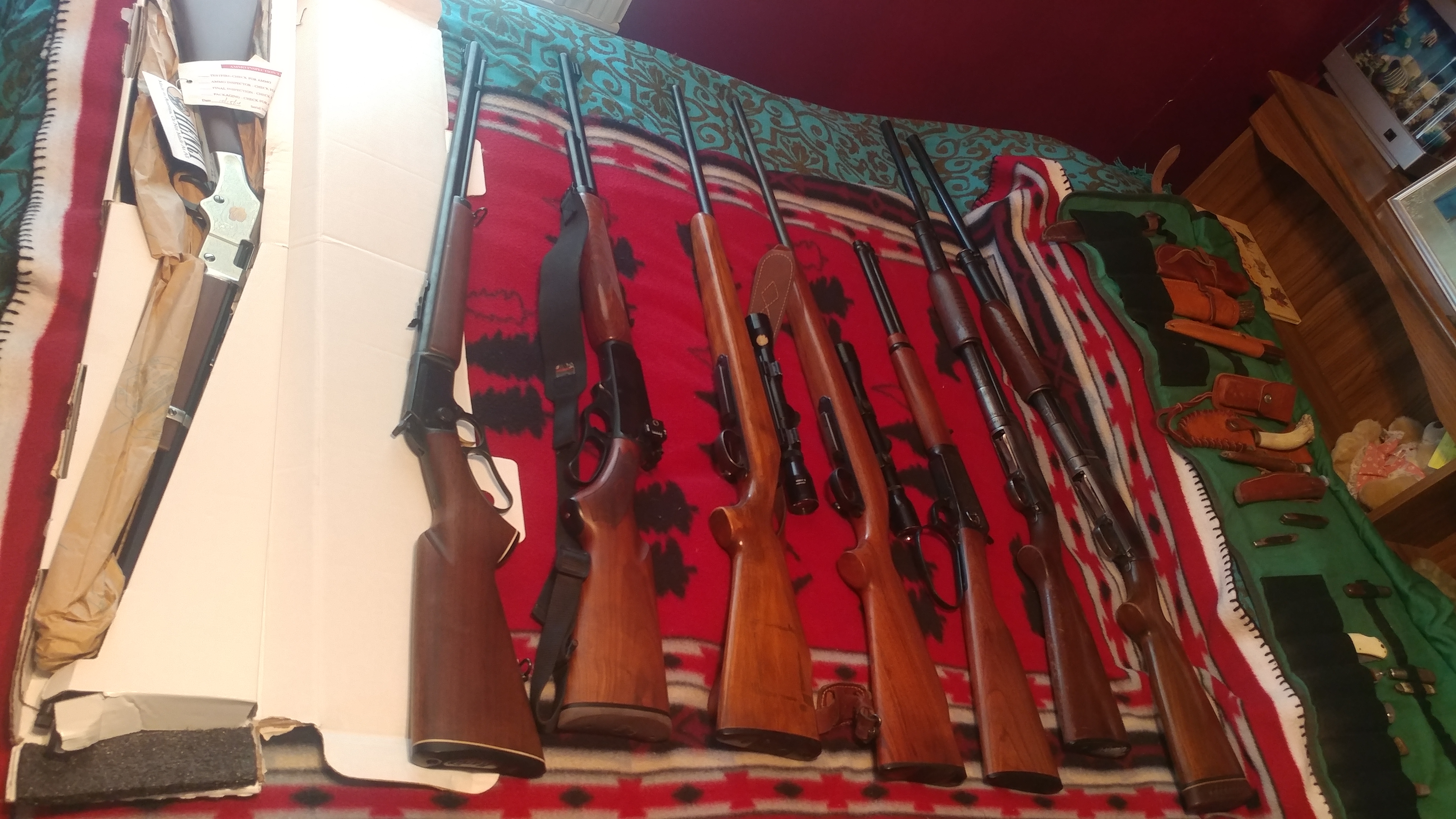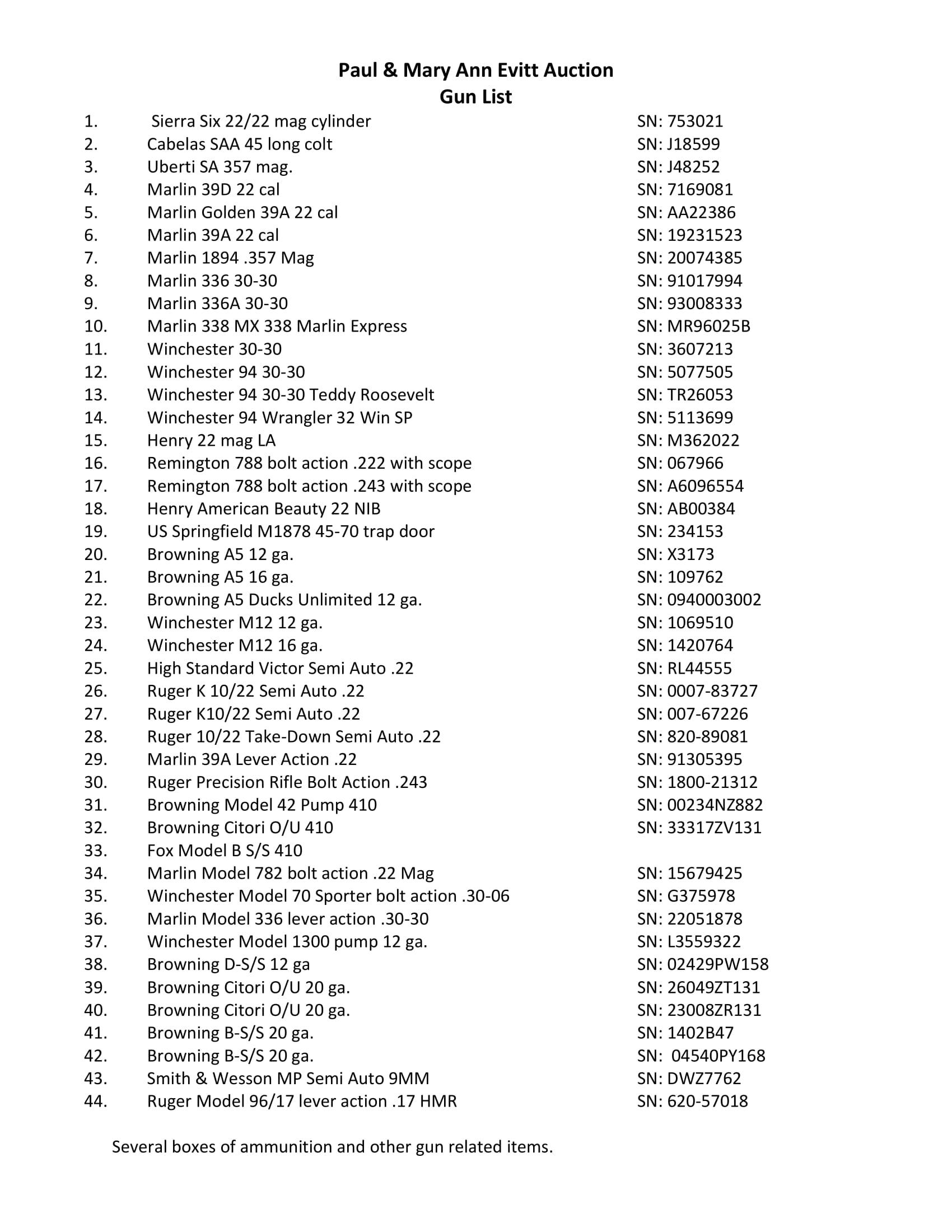 Sierra Six 22/22 mag cylinder ; Cabela’s SAA 45 long colt ; Uberti SA 357 mag. ; Marlin 39D 22 cal ; Marlin Golden 39A 22 cal ; Marlin 39A 22 cal ; Marlin 1894 .357 Mag ; Marlin 336 30-30 ; Marlin 336A 30-30 ; Marlin 338 MX 338 Marlin Express ; Winchester 30-30 ; Winchester 94 30-30 ; Winchester 94 30-30 Teddy Roosevelt ; Winchester 94 Wrangler 32 Win SP ; Henry 22 mag LA ; Remington 788 bolt action .222 with scope ; Remington 788 bolt action .243 with scope ; Henry American Beauty 22 NIB ; US Springfield M1878 45-70 trap door ; Browning A5 12 ga. ; Browning A5 16 ga. ; Browning A5 Ducks Unlimited 12 ga.; Winchester M12 12 ga. ; Winchester M12 16 ga. ; High Standard Victor Semi Auto .22 ; Ruger K 10/22 Semi Auto .22 ; Ruger K10/22 Semi Auto .22 ; Ruger 10/22 Take-Down Semi Auto .22 ; Marlin 39A Lever Action .22 ; Ruger Precision Rifle Bolt Action .243 ; Browning Model 42 Pump 410 ; Browning Citori O/U 410 ; Fox Model B S/S 410;Marlin Model 782 bolt action .22 Mag ; Winchester Model 70 Sporter bolt action .30-06 ; Marlin Model 336 lever action .30-30 ; Winchester Model 1300 pump 12 ga. ; Browning D-S/S 12 ga ; Browning Citori O/U 20 ga. ; Browning Citori O/U 20 ga.; Browning B-S/S 20 ga. ; Browning B-S/S 20 ga. ; Smith & Wesson MP Semi Auto 9MM ; Ruger Model 96/17 lever action .17 HMR ; 100 m/l knives, some folding some sheathed belt knives & others;
