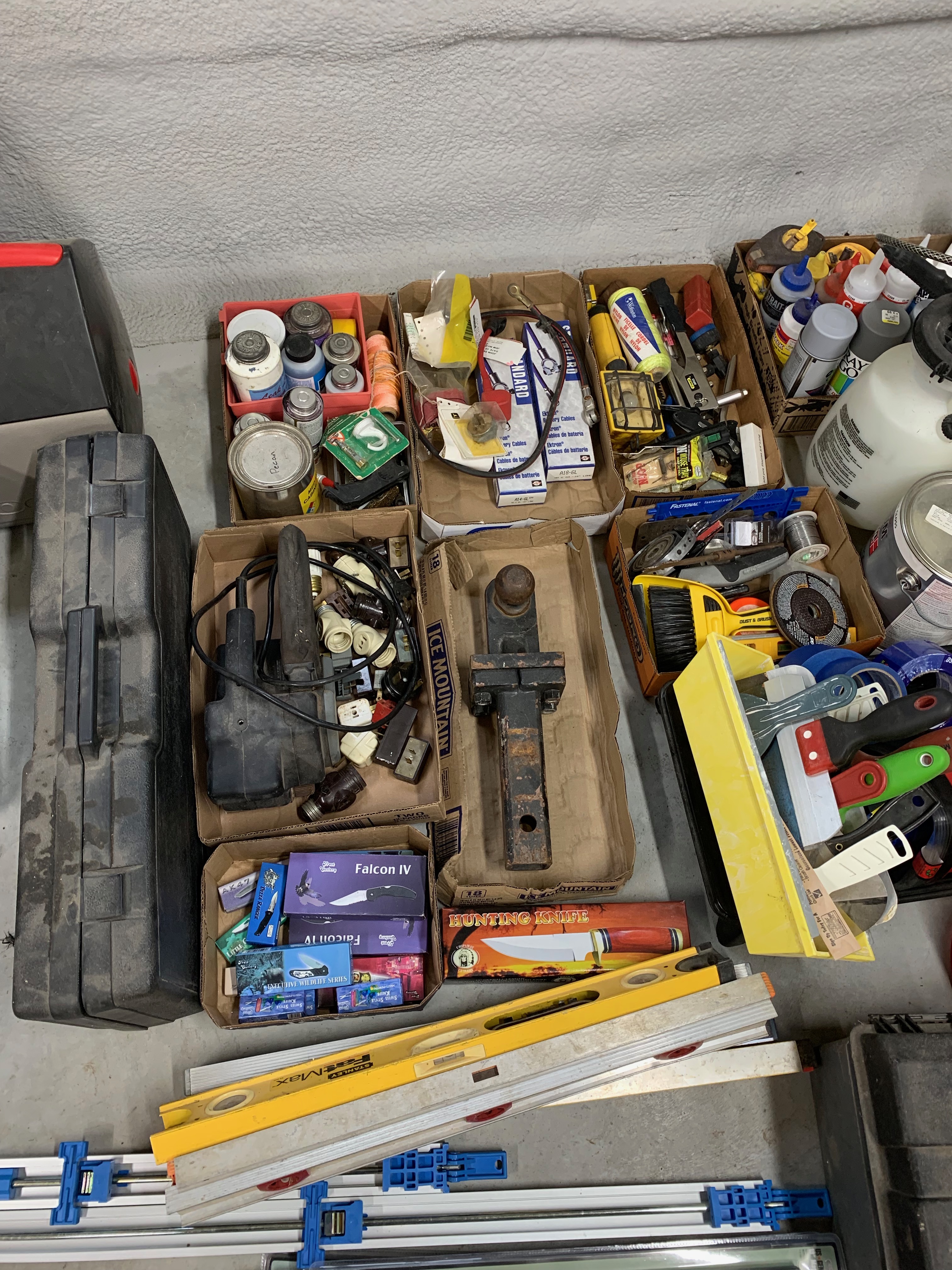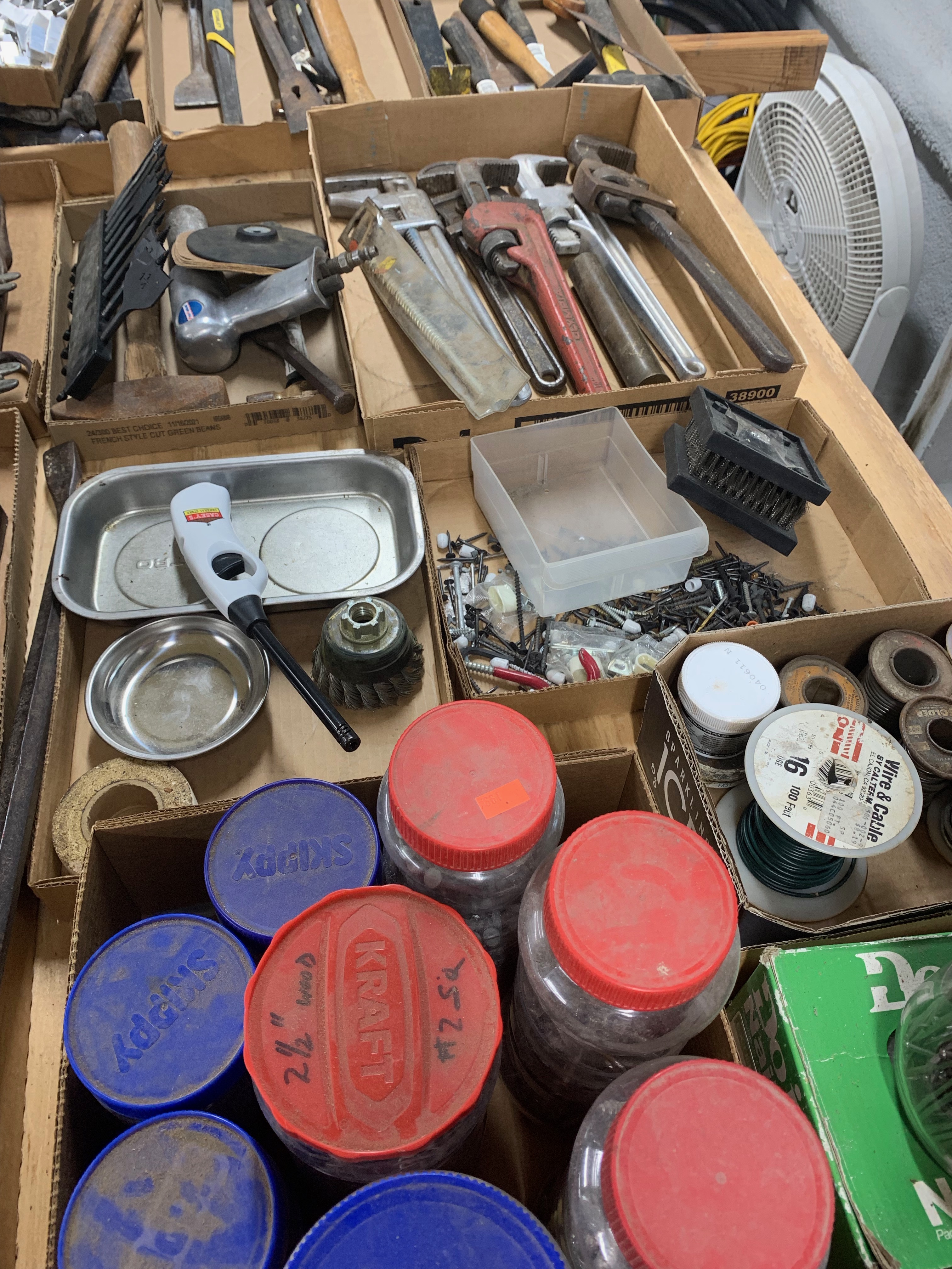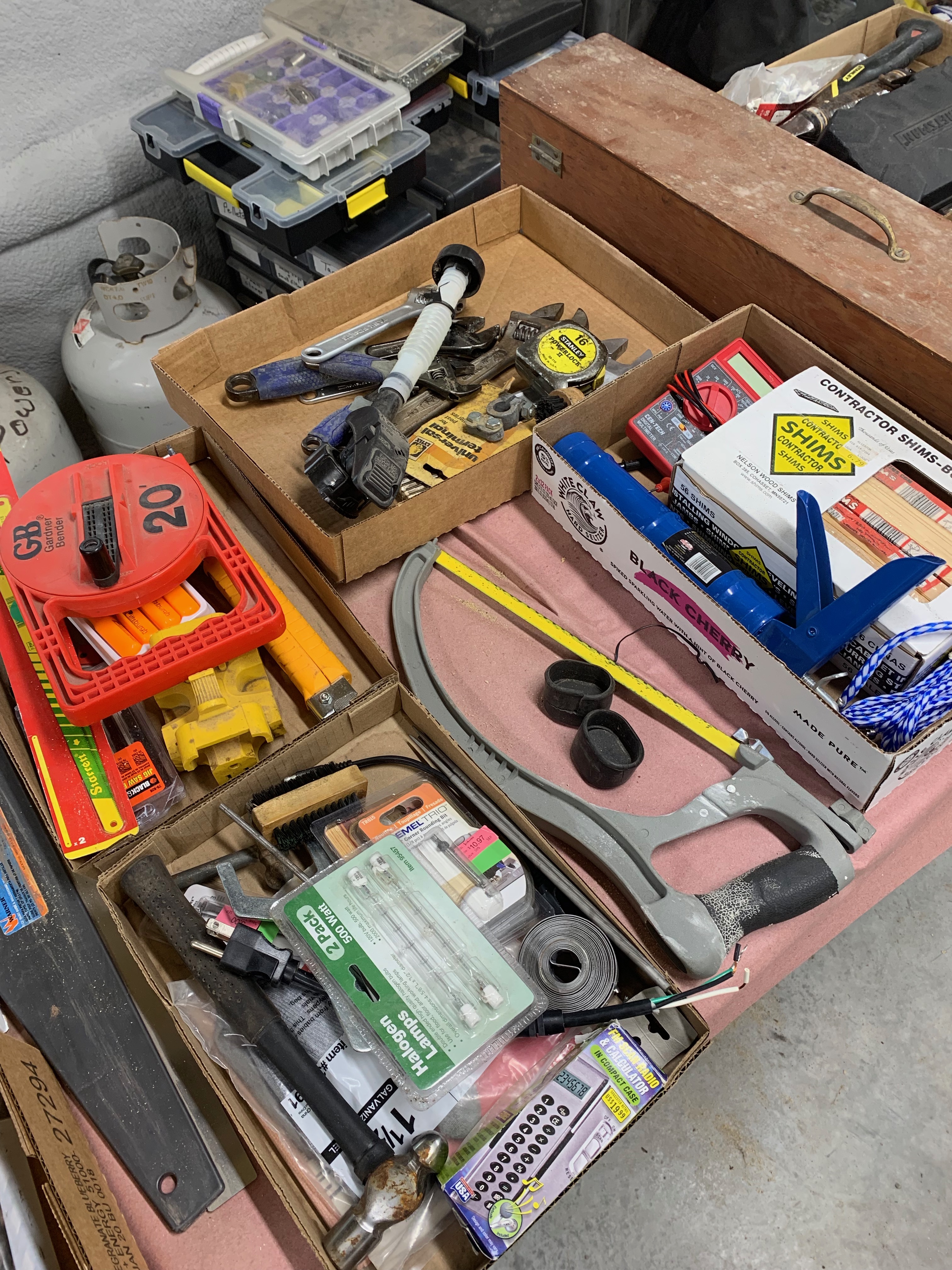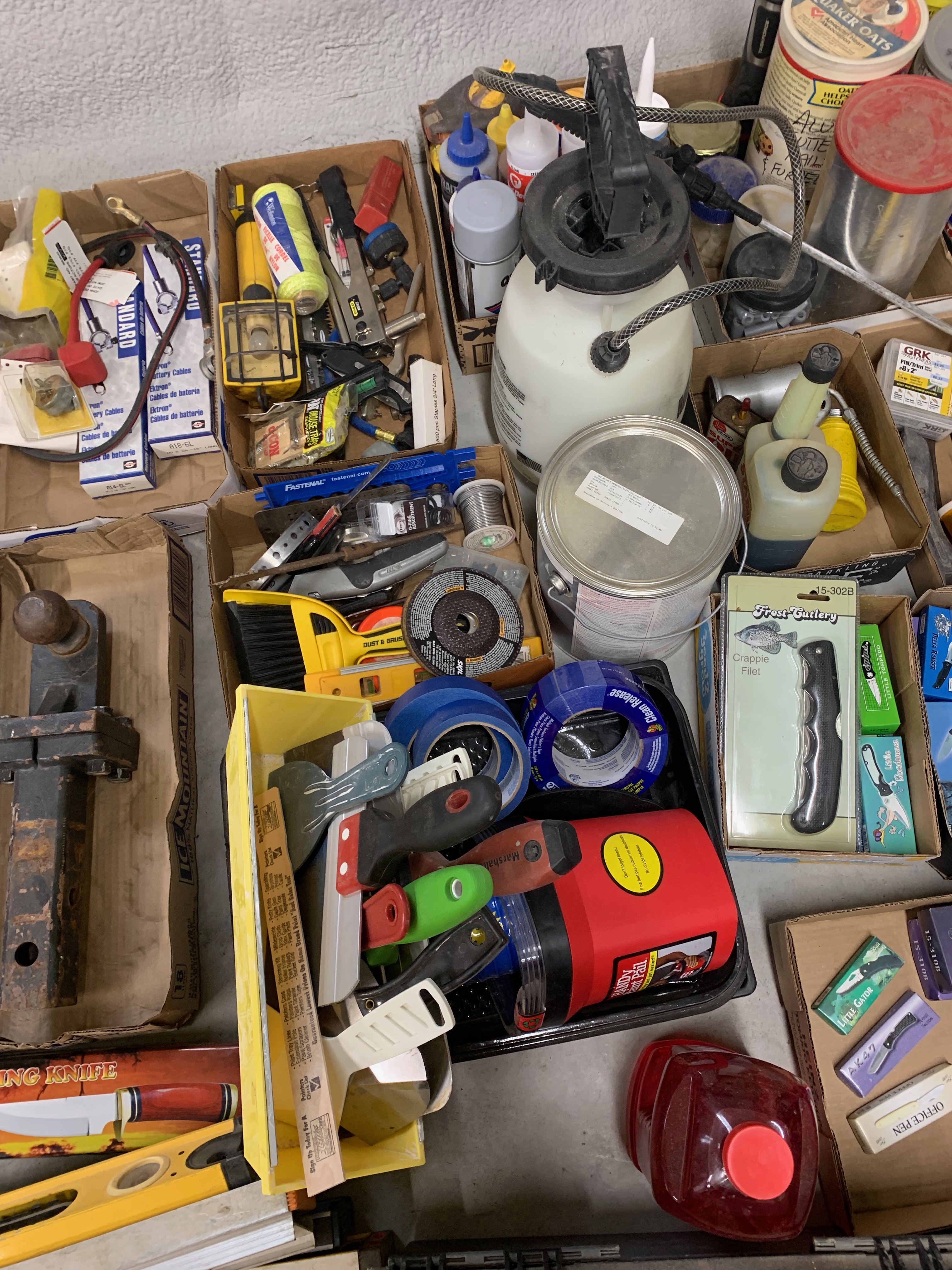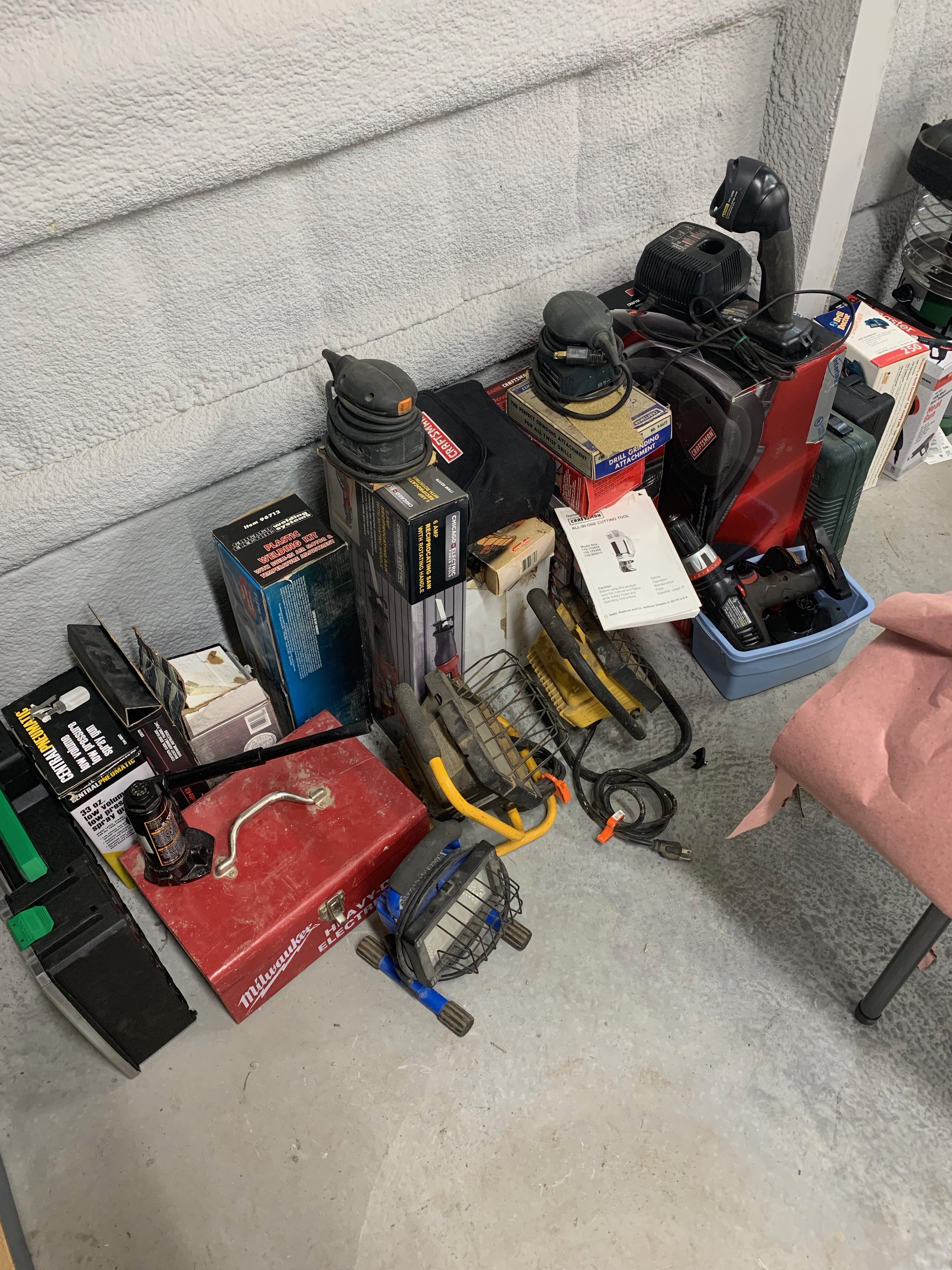 Misc lumber; flats of screw drivers; halogen work lights; Craftsman 2 gal shop vac; reciprocating saw; plastic welding kit; spray gun; multi purpose router guide kit; palm sanders; electrical wire nuts; hydraulic jack; misc craftsman tools; propane heater; Dremel tool; drill doctor; heat gun; hammer drill; small propane tanks; 10 misc cases of small tools; 3 cabinet bolt bins with misc; steam cleaner; Craftsman leaf blower; many flats of assorted knives; tow rope; new bolt organizer; levels; misc putty knives; 50 ft garden hose; nailers; misc hand tools; flats of nails and screws; tap and die set; file cabinet; wire snake; extension cords; hose reel; corded drills; 1⁄2 inch impact gun; cordless craftsman drill; misc yard hand tools; small yard sprayer; fiberglass ladder; work bench; air compressor; shelving; air pigs; hanging storage kits; scroll saw; yard seeder; peg board hooks; step stool; wheel dolly; misc pipe fittings; electrical and plumbing fittings; outdoor house lights; outdoor security light, motion detected; steel ramps; wheel barrow; other misc rack items