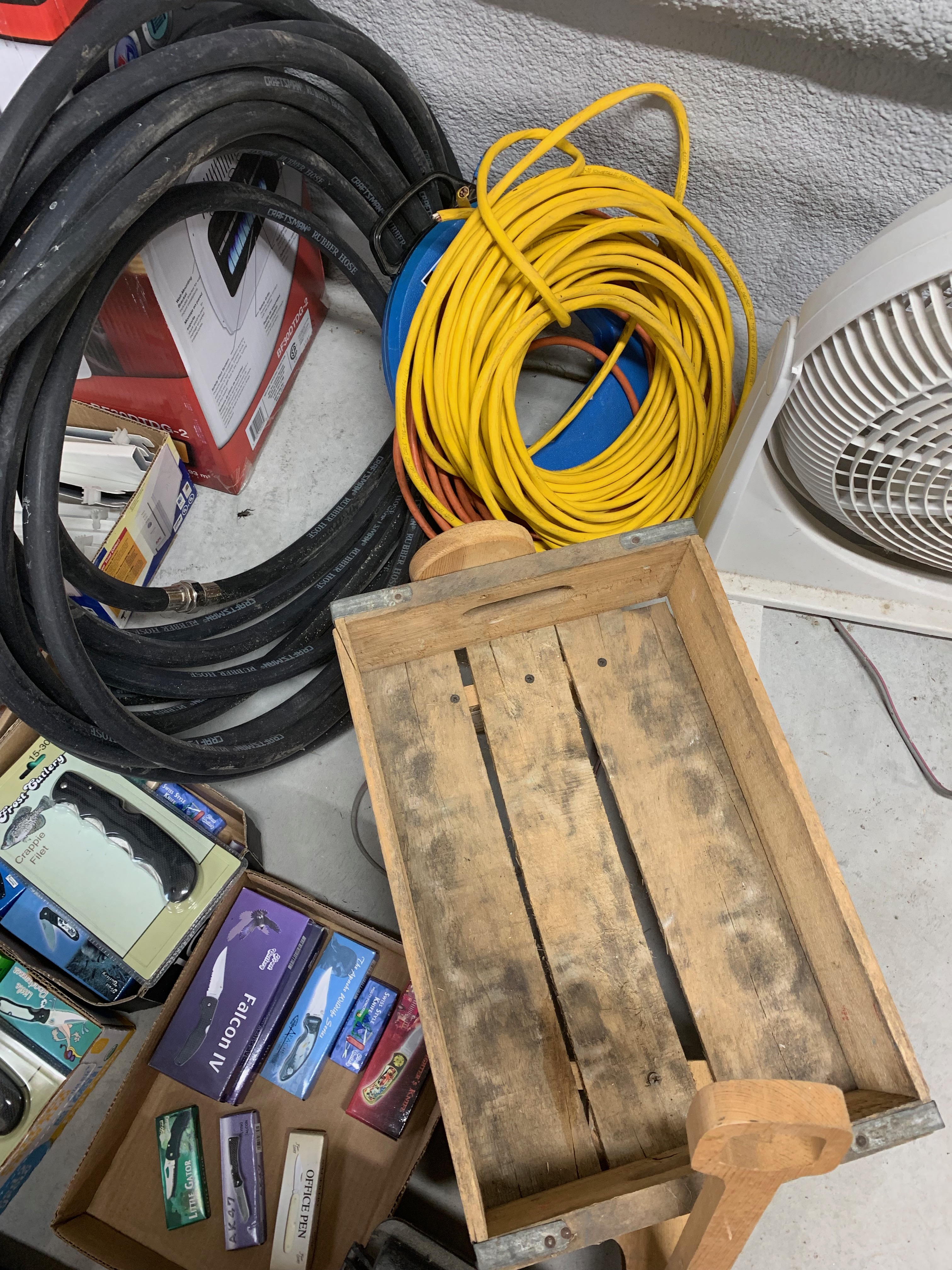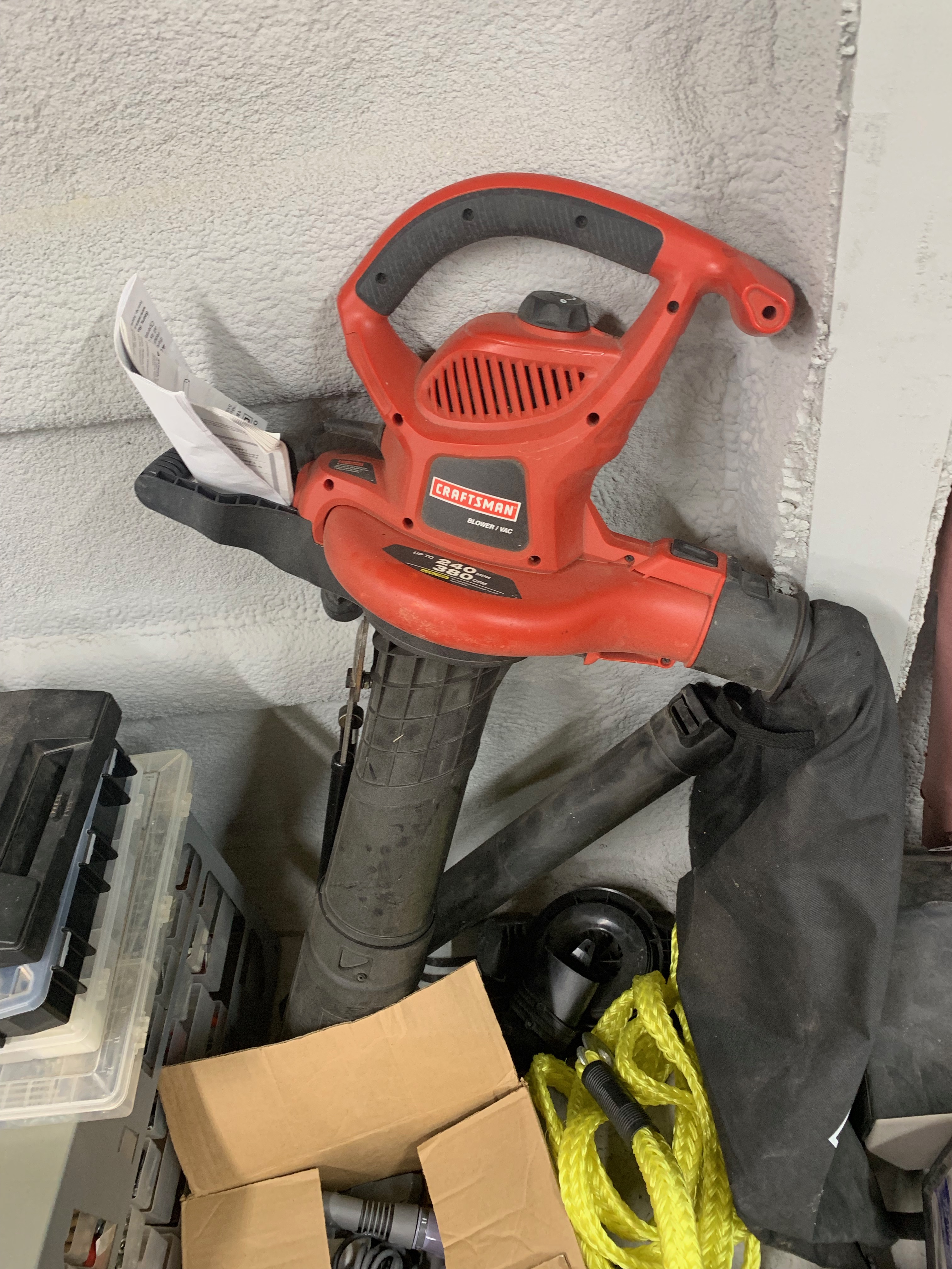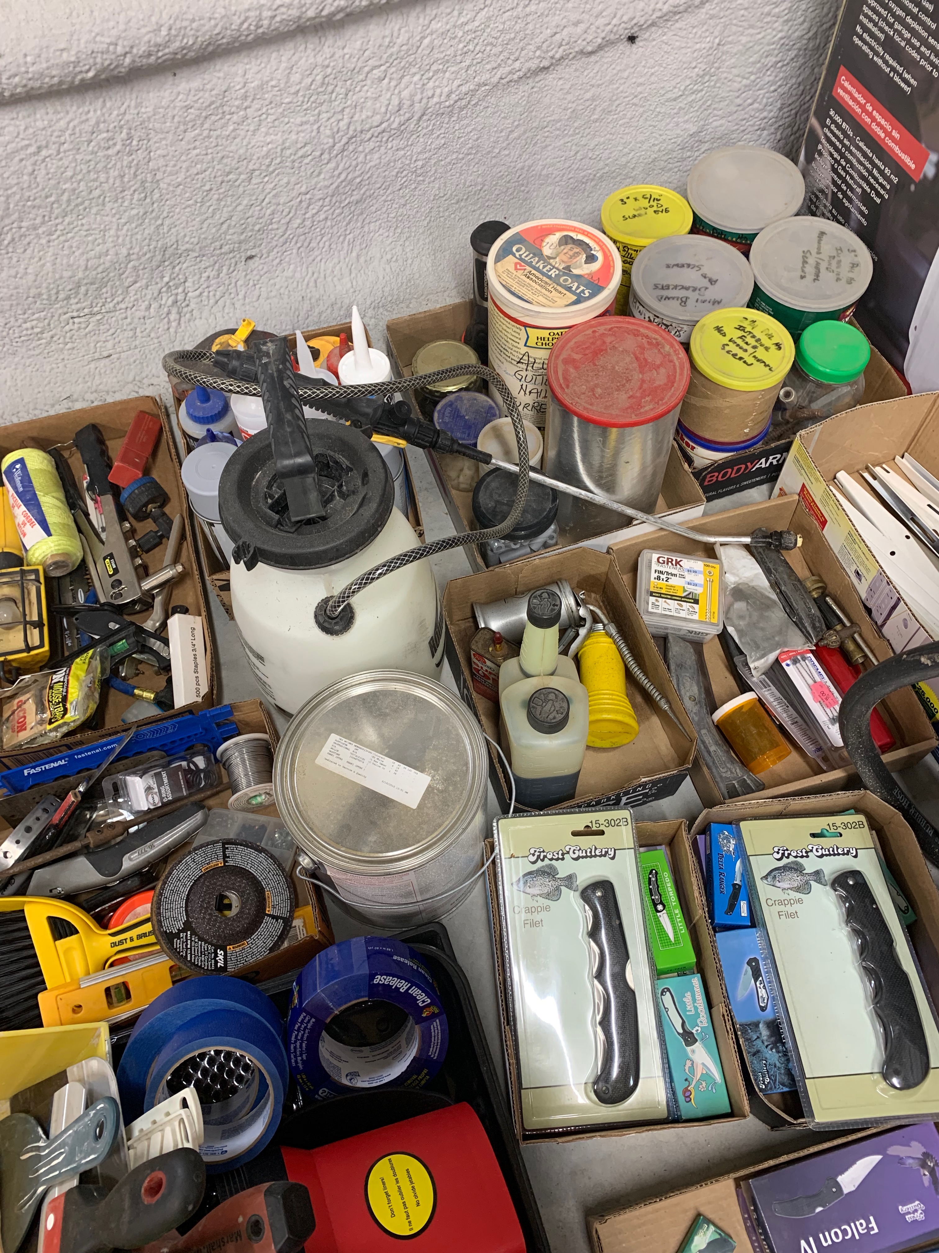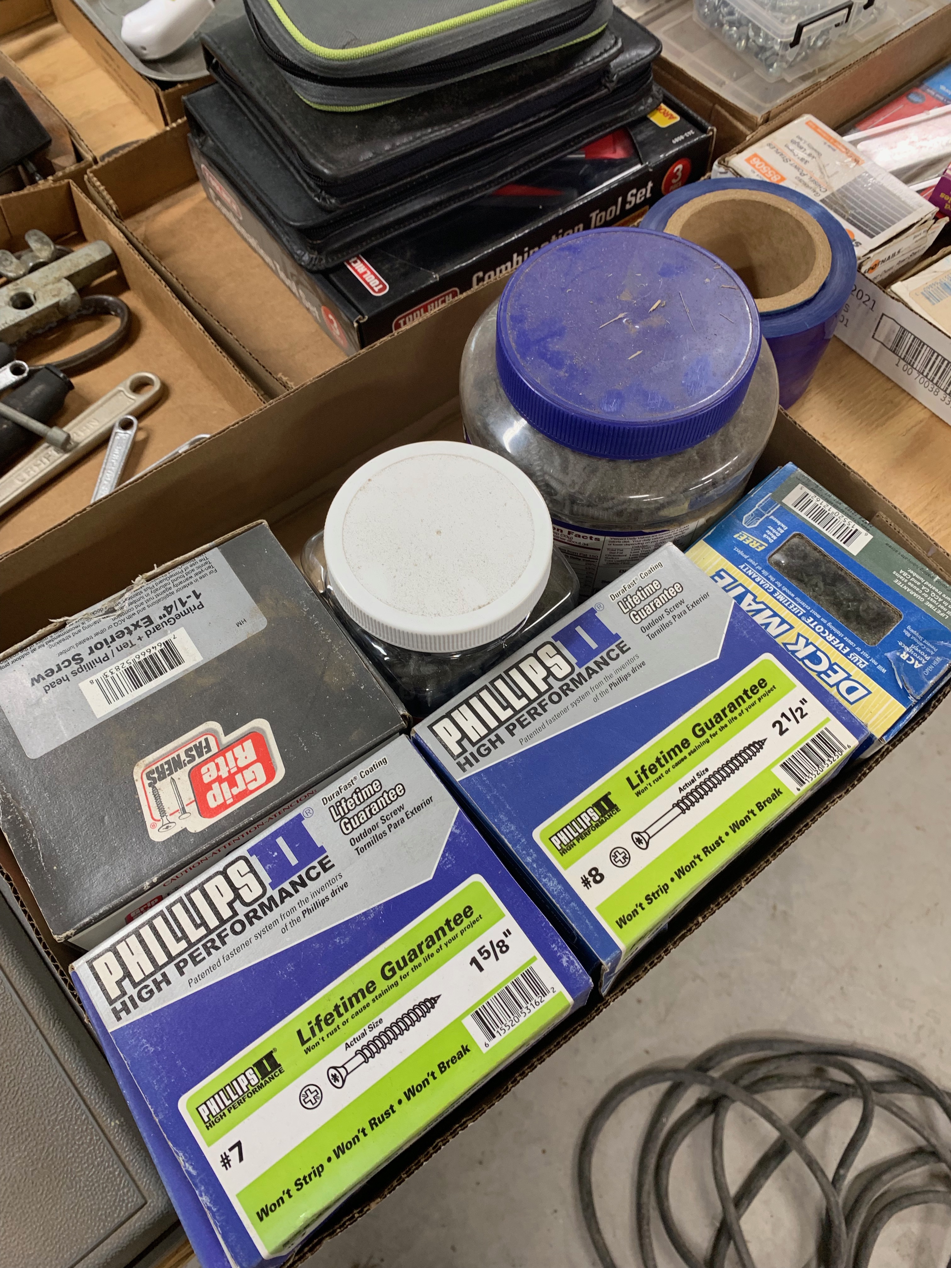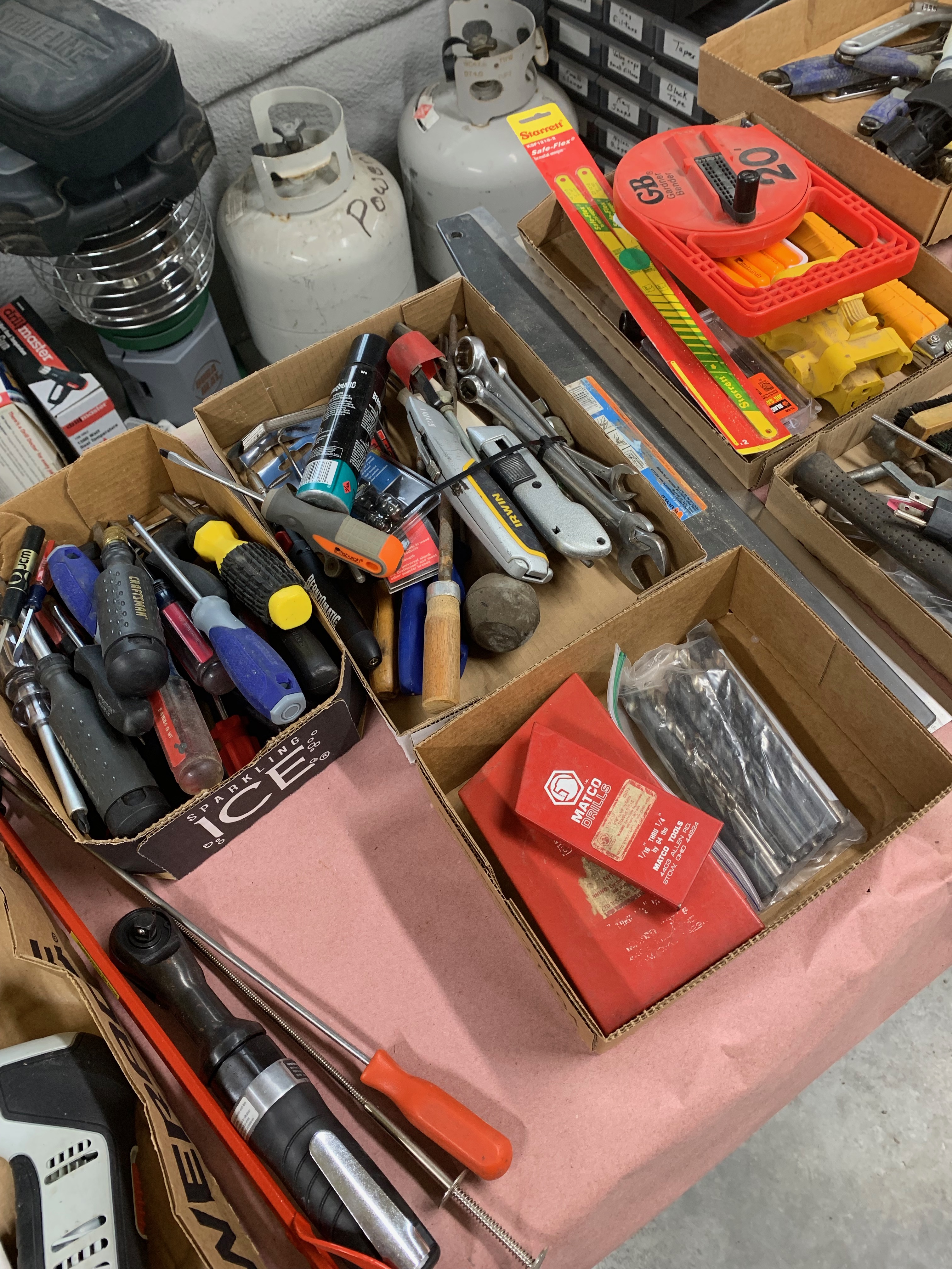 Misc lumber; flats of screw drivers; halogen work lights; Craftsman 2 gal shop vac; reciprocating saw; plastic welding kit; spray gun; multi purpose router guide kit; palm sanders; electrical wire nuts; hydraulic jack; misc craftsman tools; propane heater; Dremel tool; drill doctor; heat gun; hammer drill; small propane tanks; 10 misc cases of small tools; 3 cabinet bolt bins with misc; steam cleaner; Craftsman leaf blower; many flats of assorted knives; tow rope; new bolt organizer; levels; misc putty knives; 50 ft garden hose; nailers; misc hand tools; flats of nails and screws; tap and die set; file cabinet; wire snake; extension cords; hose reel; corded drills; 1⁄2 inch impact gun; cordless craftsman drill; misc yard hand tools; small yard sprayer; fiberglass ladder; work bench; air compressor; shelving; air pigs; hanging storage kits; scroll saw; yard seeder; peg board hooks; step stool; wheel dolly; misc pipe fittings; electrical and plumbing fittings; outdoor house lights; outdoor security light, motion detected; steel ramps; wheel barrow; other misc rack items