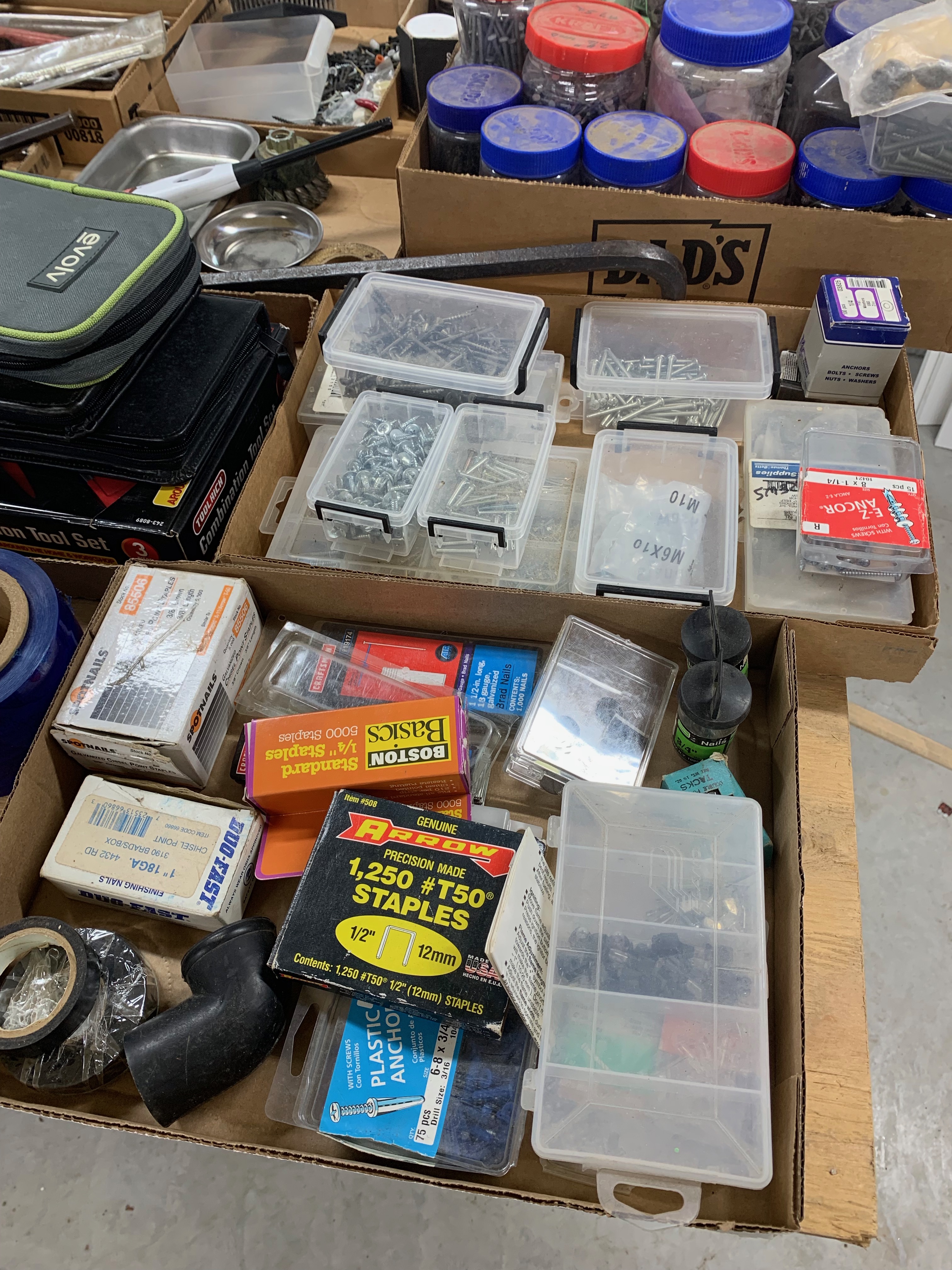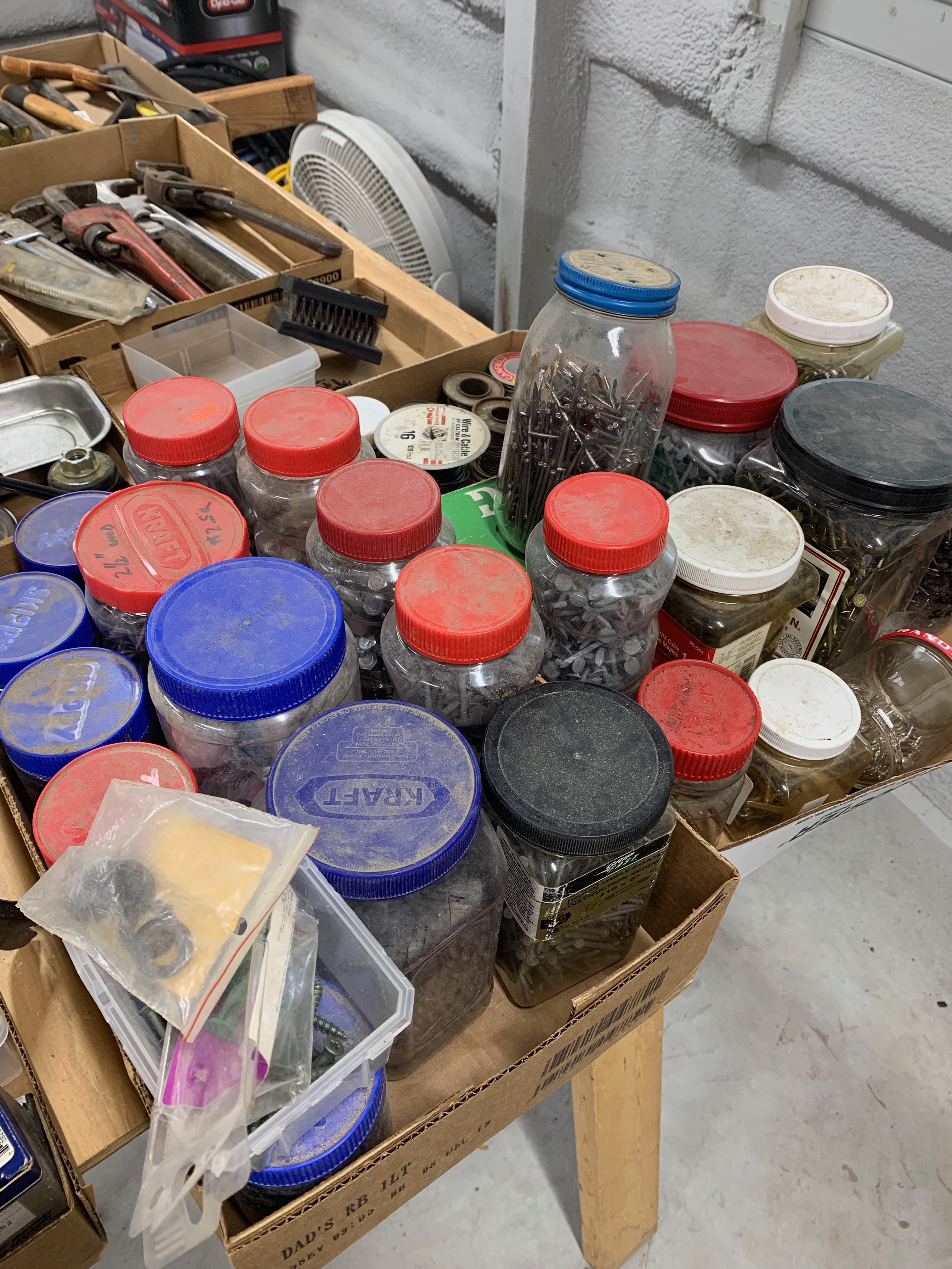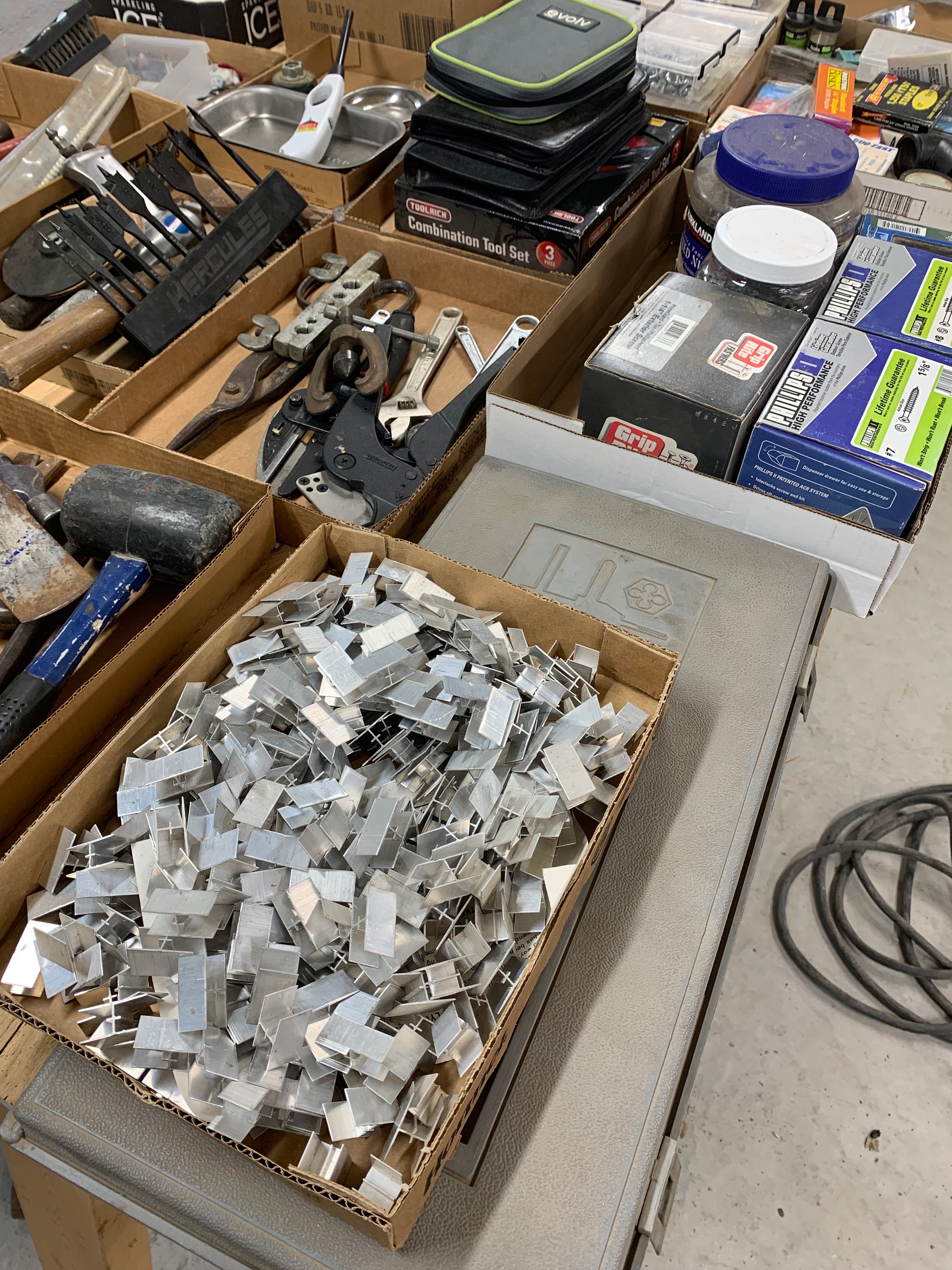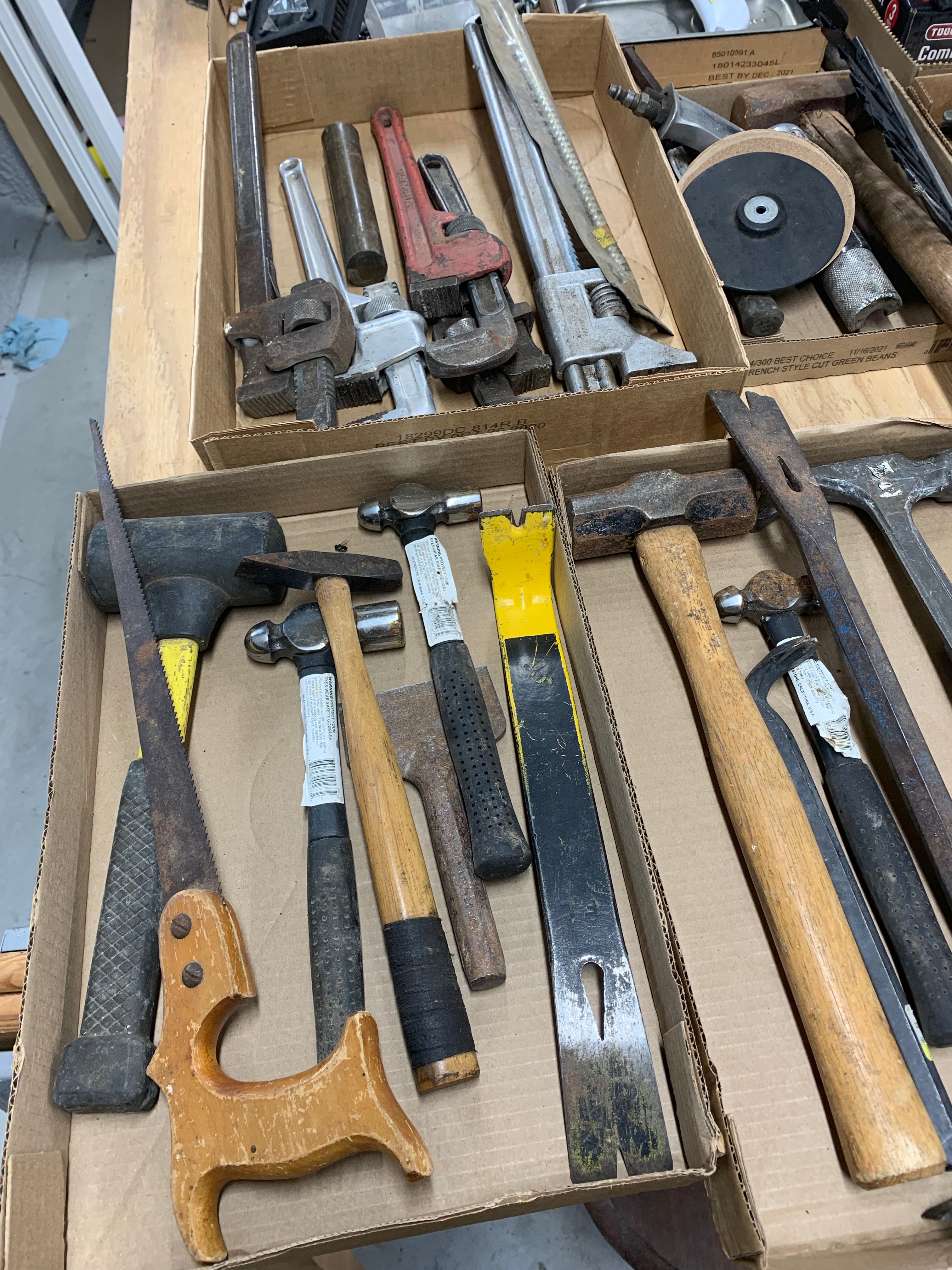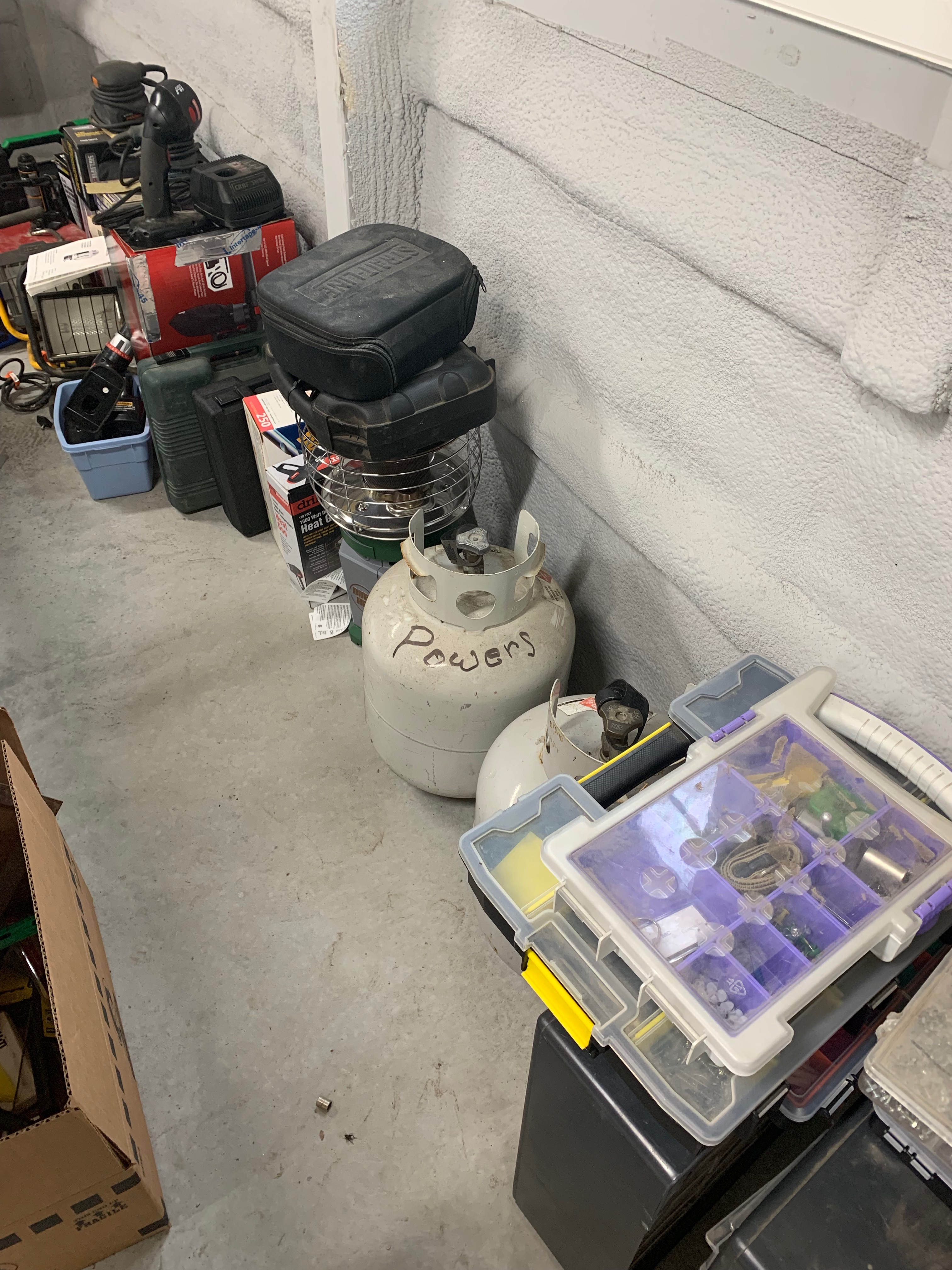 Misc lumber; flats of screw drivers; halogen work lights; Craftsman 2 gal shop vac; reciprocating saw; plastic welding kit; spray gun; multi purpose router guide kit; palm sanders; electrical wire nuts; hydraulic jack; misc craftsman tools; propane heater; Dremel tool; drill doctor; heat gun; hammer drill; small propane tanks; 10 misc cases of small tools; 3 cabinet bolt bins with misc; steam cleaner; Craftsman leaf blower; many flats of assorted knives; tow rope; new bolt organizer; levels; misc putty knives; 50 ft garden hose; nailers; misc hand tools; flats of nails and screws; tap and die set; file cabinet; wire snake; extension cords; hose reel; corded drills; 1⁄2 inch impact gun; cordless craftsman drill; misc yard hand tools; small yard sprayer; fiberglass ladder; work bench; air compressor; shelving; air pigs; hanging storage kits; scroll saw; yard seeder; peg board hooks; step stool; wheel dolly; misc pipe fittings; electrical and plumbing fittings; outdoor house lights; outdoor security light, motion detected; steel ramps; wheel barrow; other misc rack items