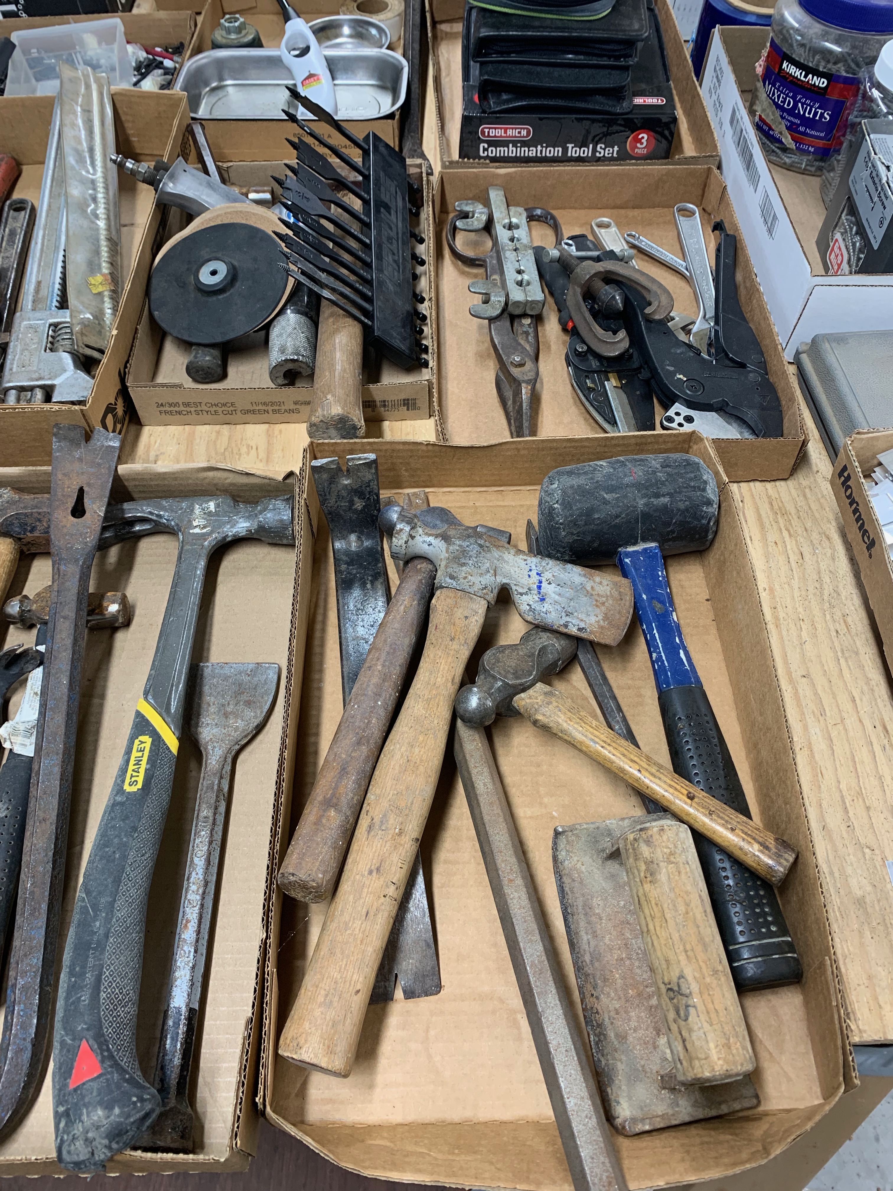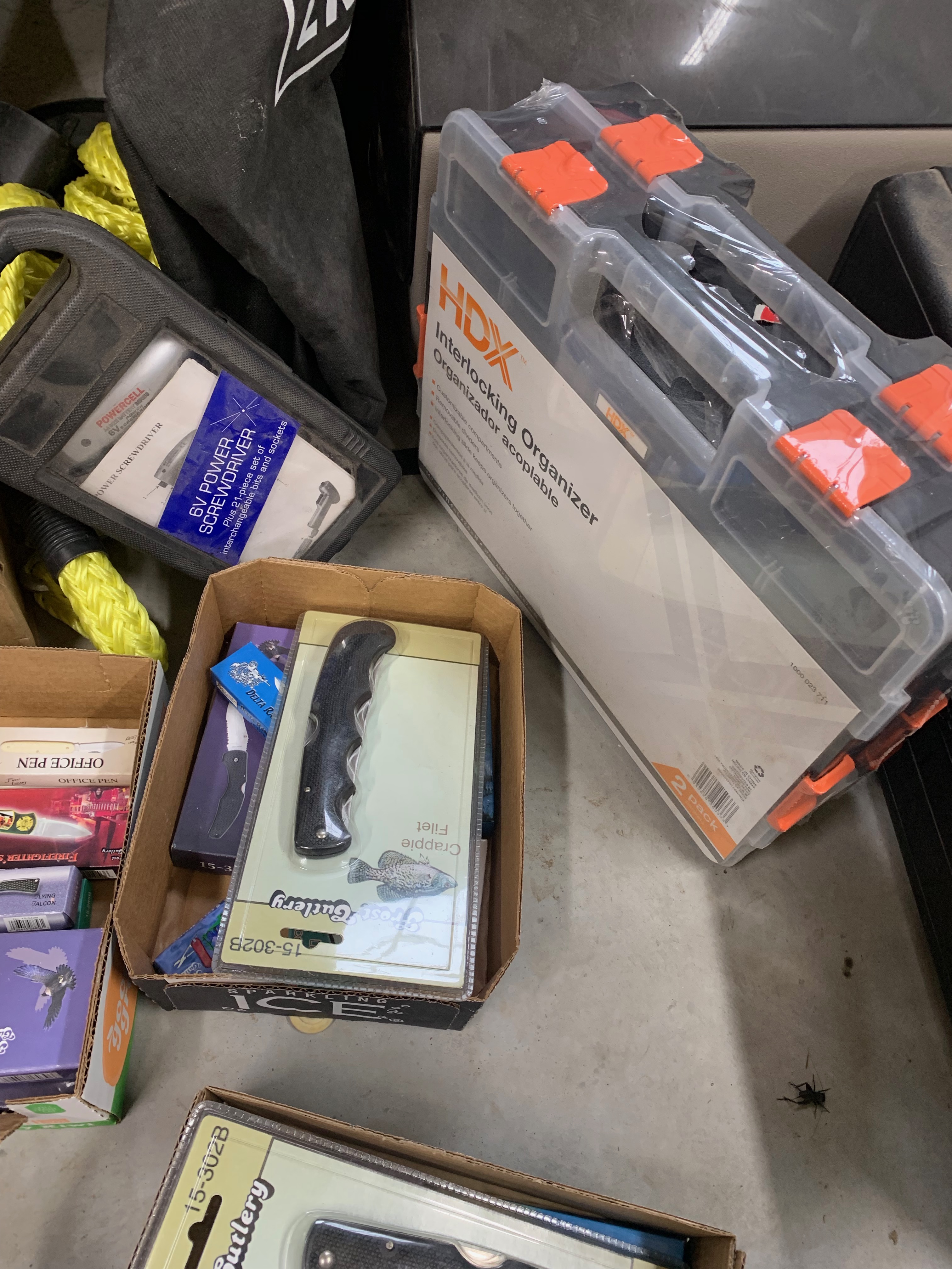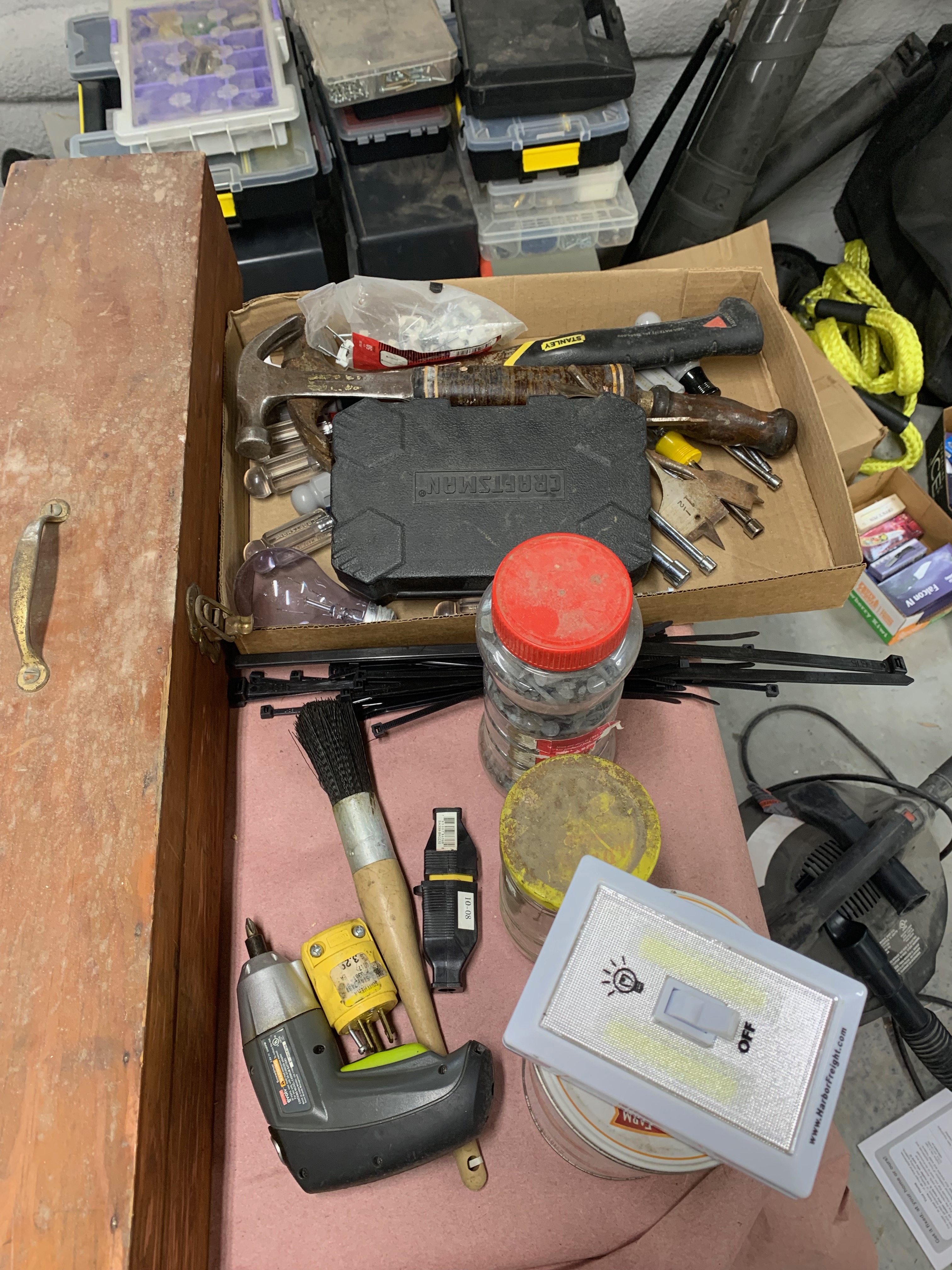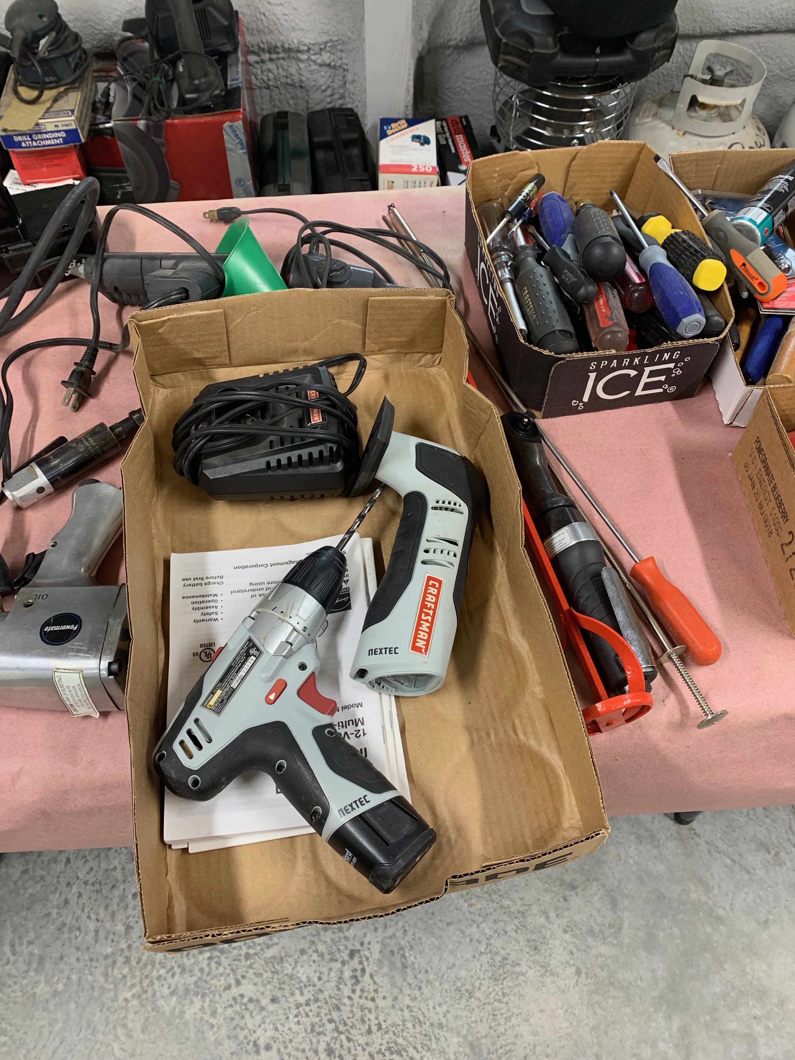 Misc lumber; flats of screw drivers; halogen work lights; Craftsman 2 gal shop vac; reciprocating saw; plastic welding kit; spray gun; multi purpose router guide kit; palm sanders; electrical wire nuts; hydraulic jack; misc craftsman tools; propane heater; Dremel tool; drill doctor; heat gun; hammer drill; small propane tanks; 10 misc cases of small tools; 3 cabinet bolt bins with misc; steam cleaner; Craftsman leaf blower; many flats of assorted knives; tow rope; new bolt organizer; levels; misc putty knives; 50 ft garden hose; nailers; misc hand tools; flats of nails and screws; tap and die set; file cabinet; wire snake; extension cords; hose reel; corded drills; 1⁄2 inch impact gun; cordless craftsman drill; misc yard hand tools; small yard sprayer; fiberglass ladder; work bench; air compressor; shelving; air pigs; hanging storage kits; scroll saw; yard seeder; peg board hooks; step stool; wheel dolly; misc pipe fittings; electrical and plumbing fittings; outdoor house lights; outdoor security light, motion detected; steel ramps; wheel barrow; other misc rack items