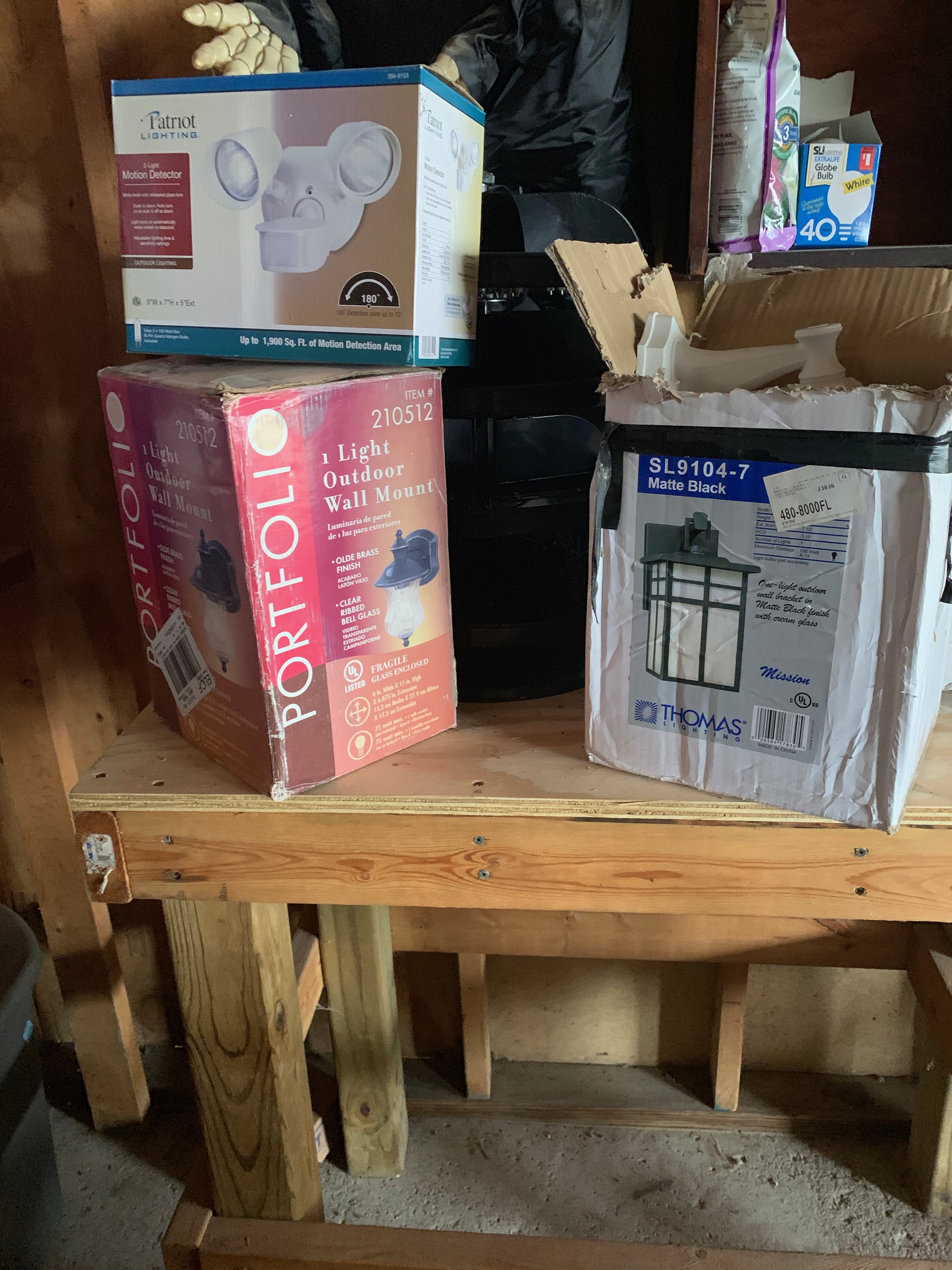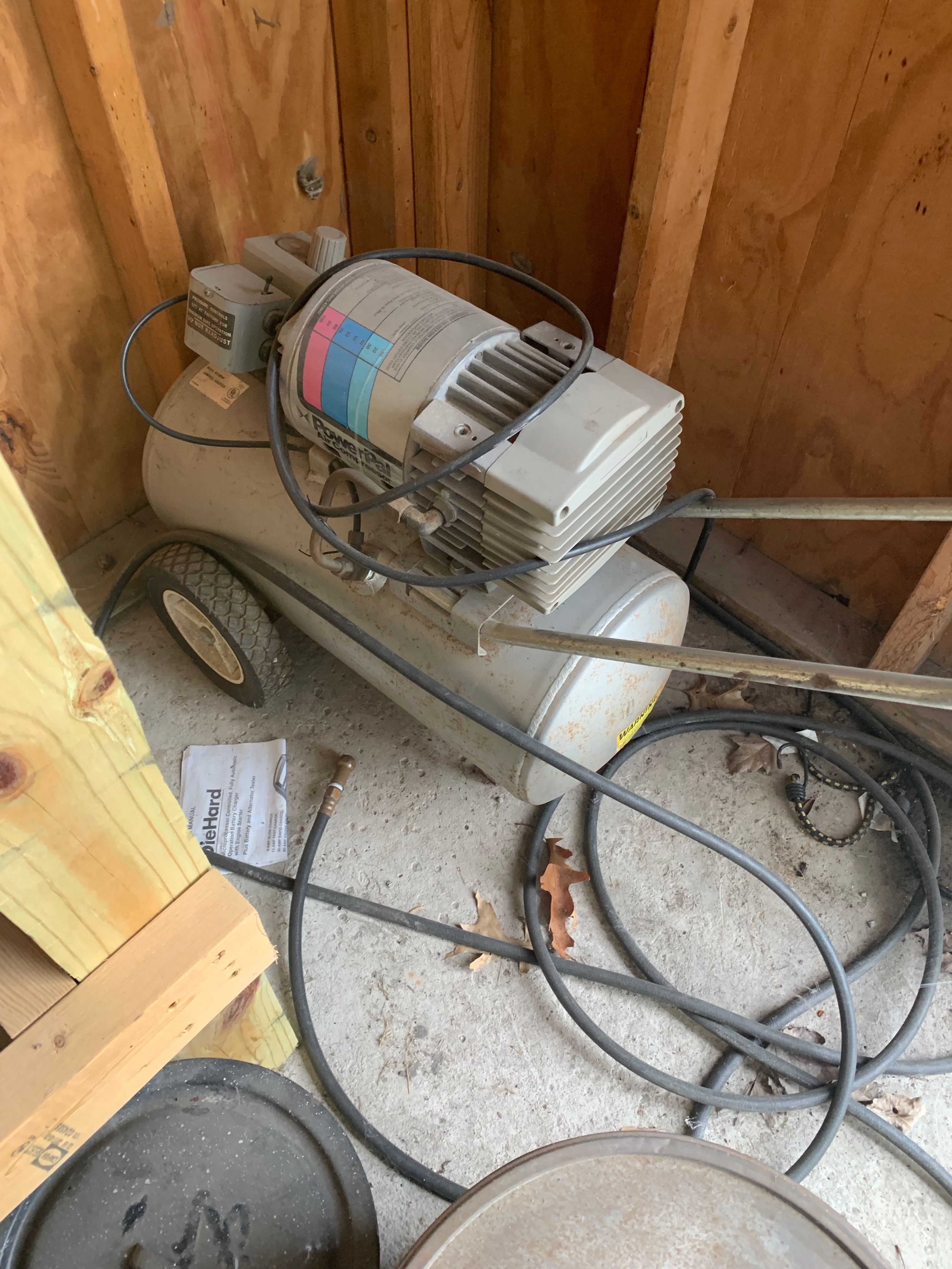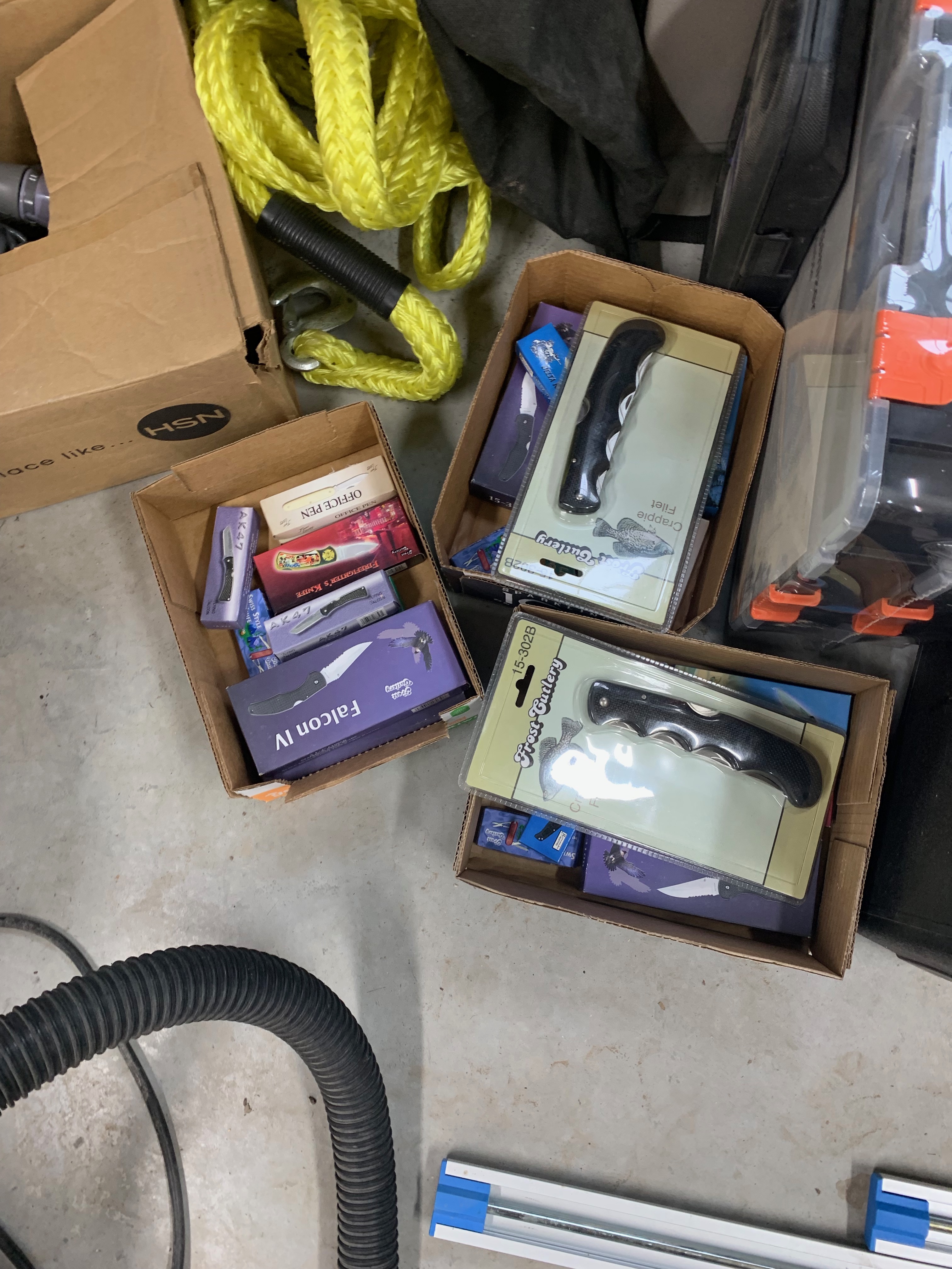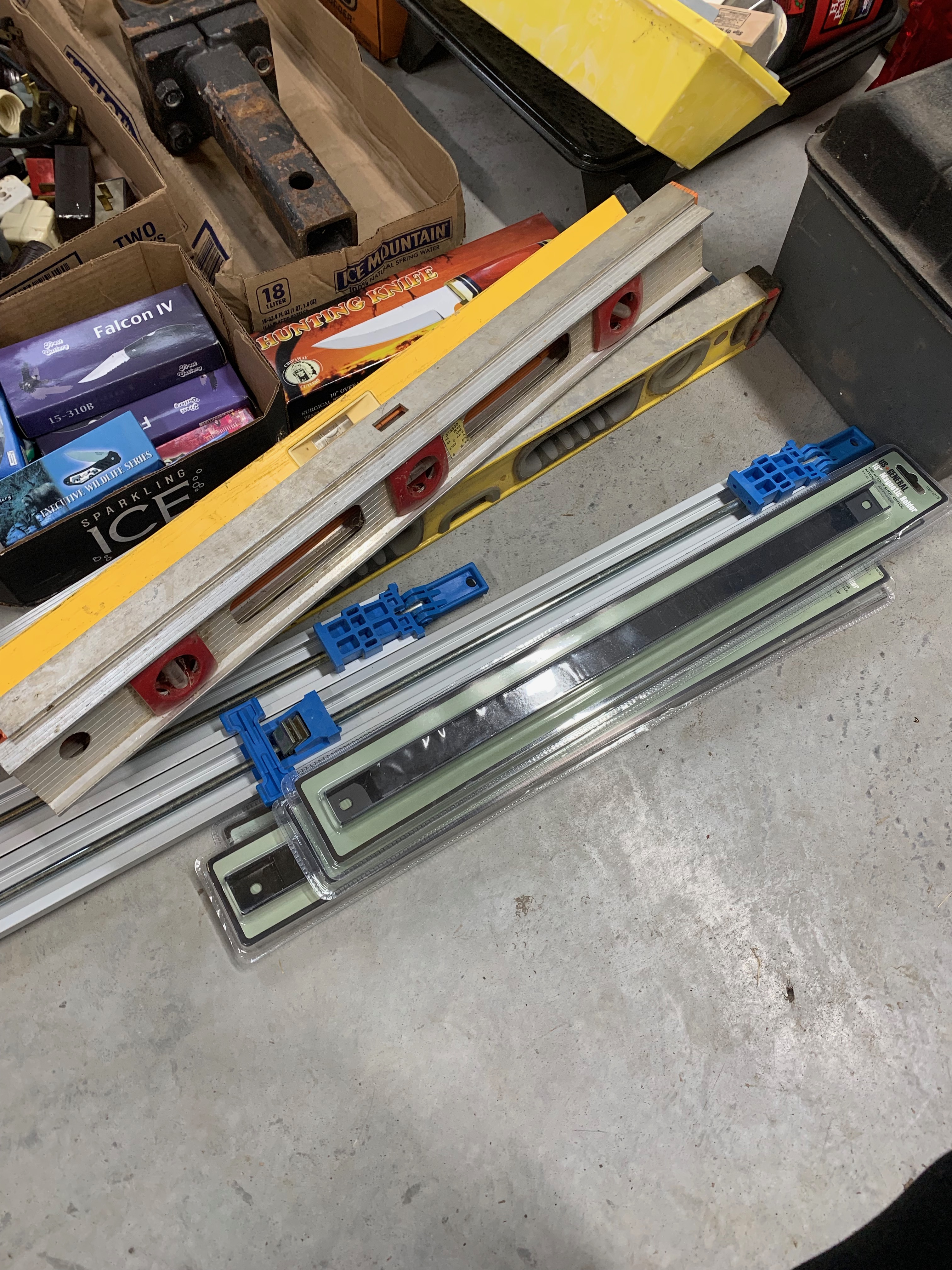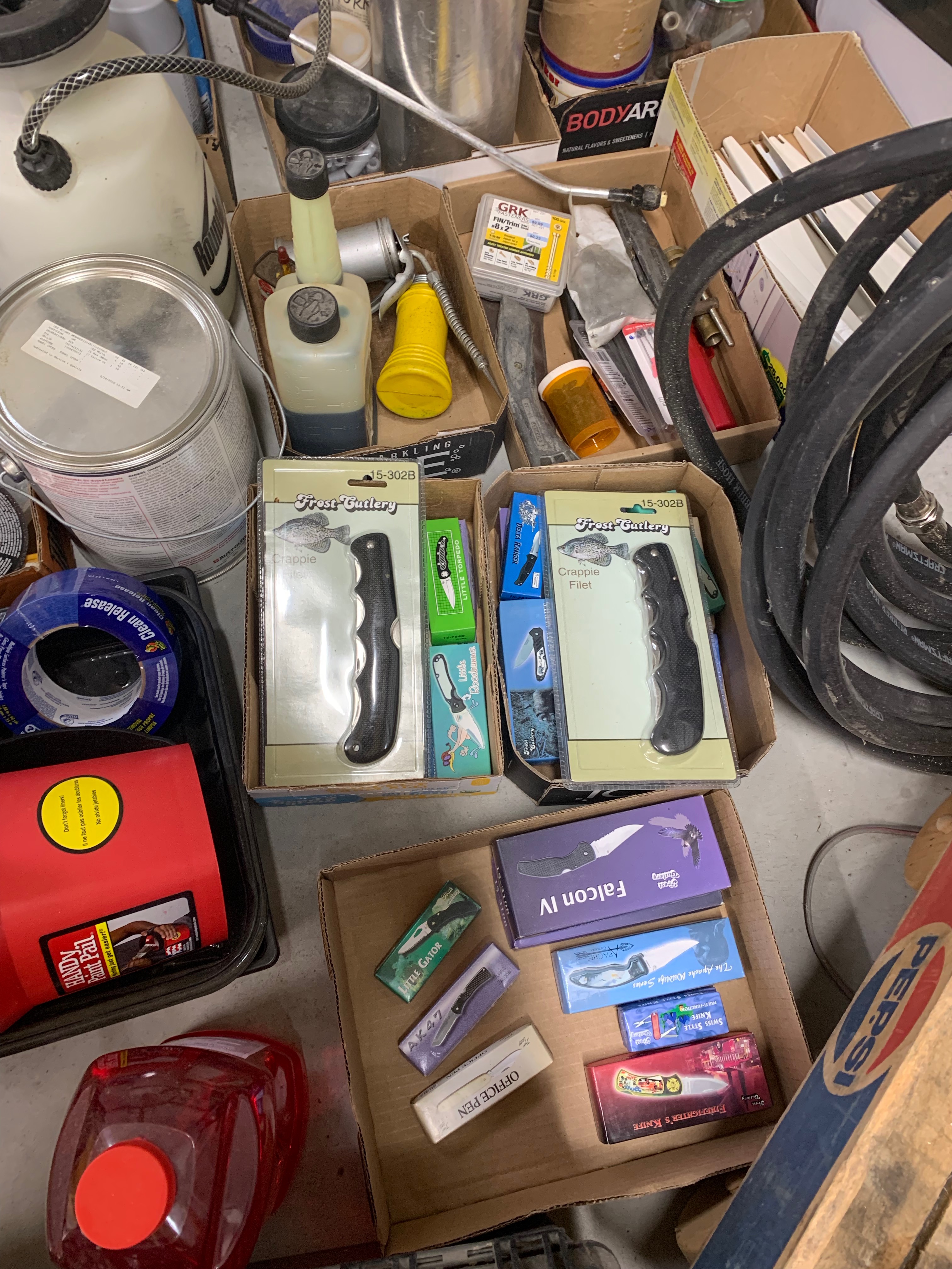 Misc lumber; flats of screw drivers; halogen work lights; Craftsman 2 gal shop vac; reciprocating saw; plastic welding kit; spray gun; multi purpose router guide kit; palm sanders; electrical wire nuts; hydraulic jack; misc craftsman tools; propane heater; Dremel tool; drill doctor; heat gun; hammer drill; small propane tanks; 10 misc cases of small tools; 3 cabinet bolt bins with misc; steam cleaner; Craftsman leaf blower; many flats of assorted knives; tow rope; new bolt organizer; levels; misc putty knives; 50 ft garden hose; nailers; misc hand tools; flats of nails and screws; tap and die set; file cabinet; wire snake; extension cords; hose reel; corded drills; 1⁄2 inch impact gun; cordless craftsman drill; misc yard hand tools; small yard sprayer; fiberglass ladder; work bench; air compressor; shelving; air pigs; hanging storage kits; scroll saw; yard seeder; peg board hooks; step stool; wheel dolly; misc pipe fittings; electrical and plumbing fittings; outdoor house lights; outdoor security light, motion detected; steel ramps; wheel barrow; other misc rack items