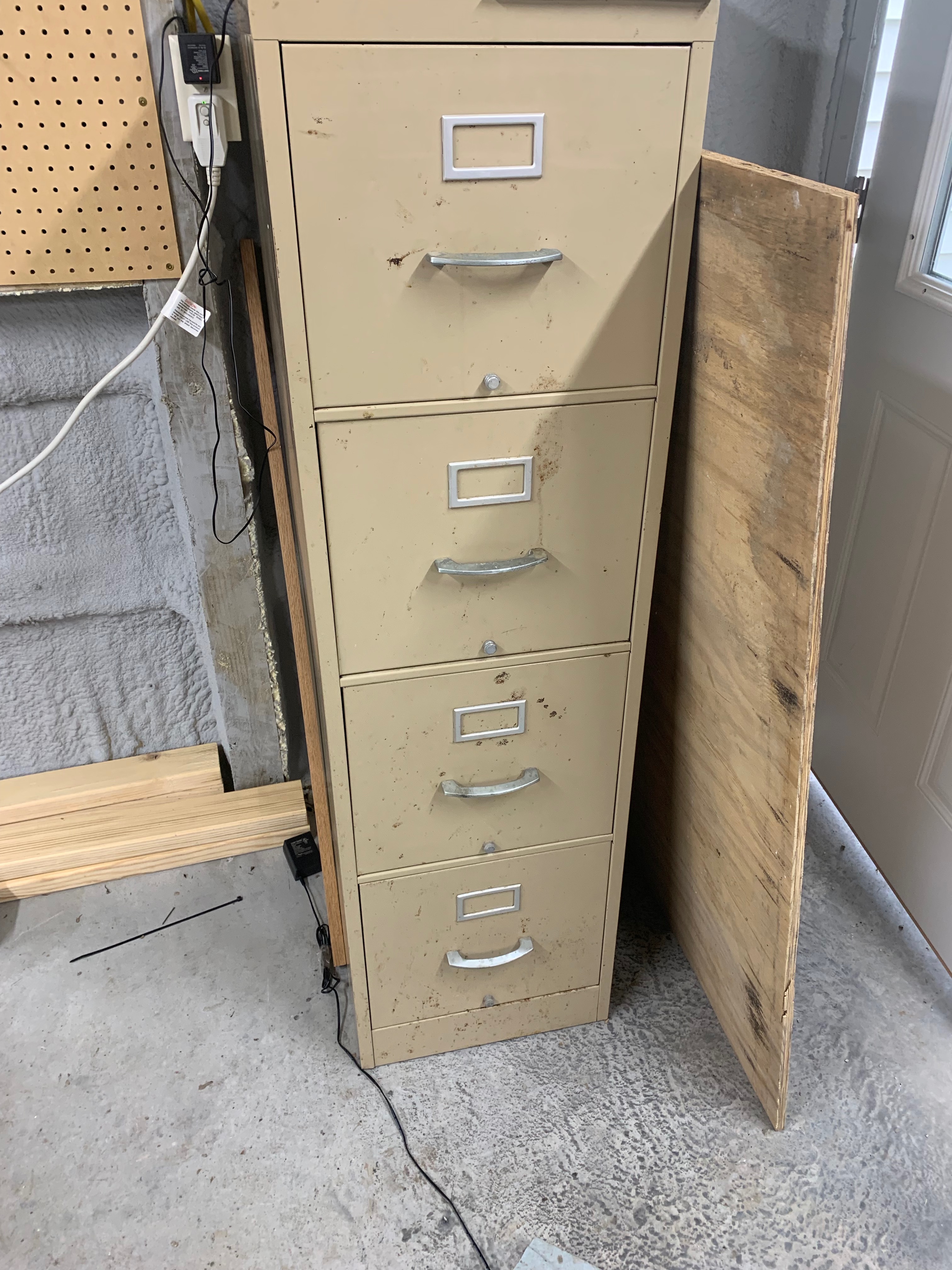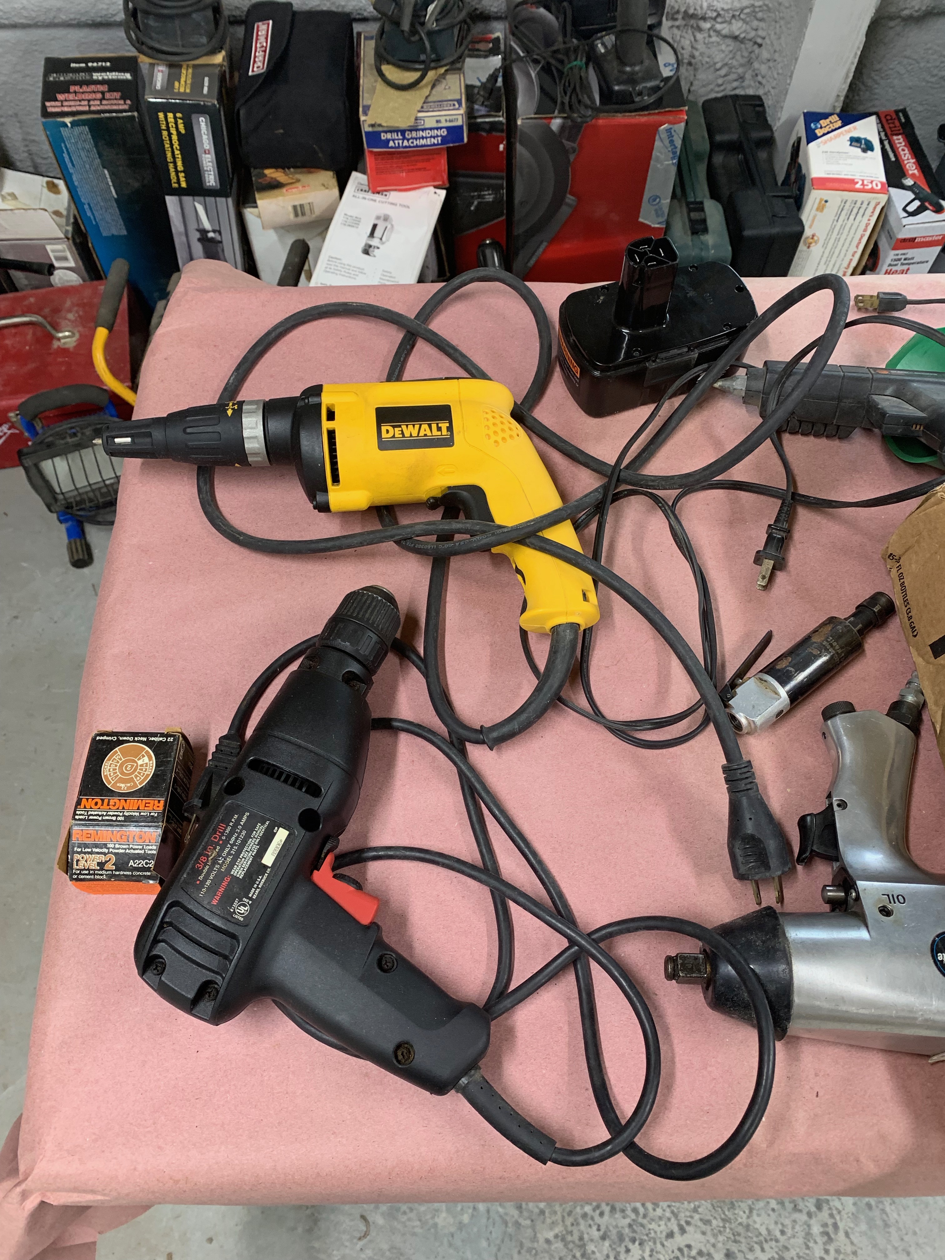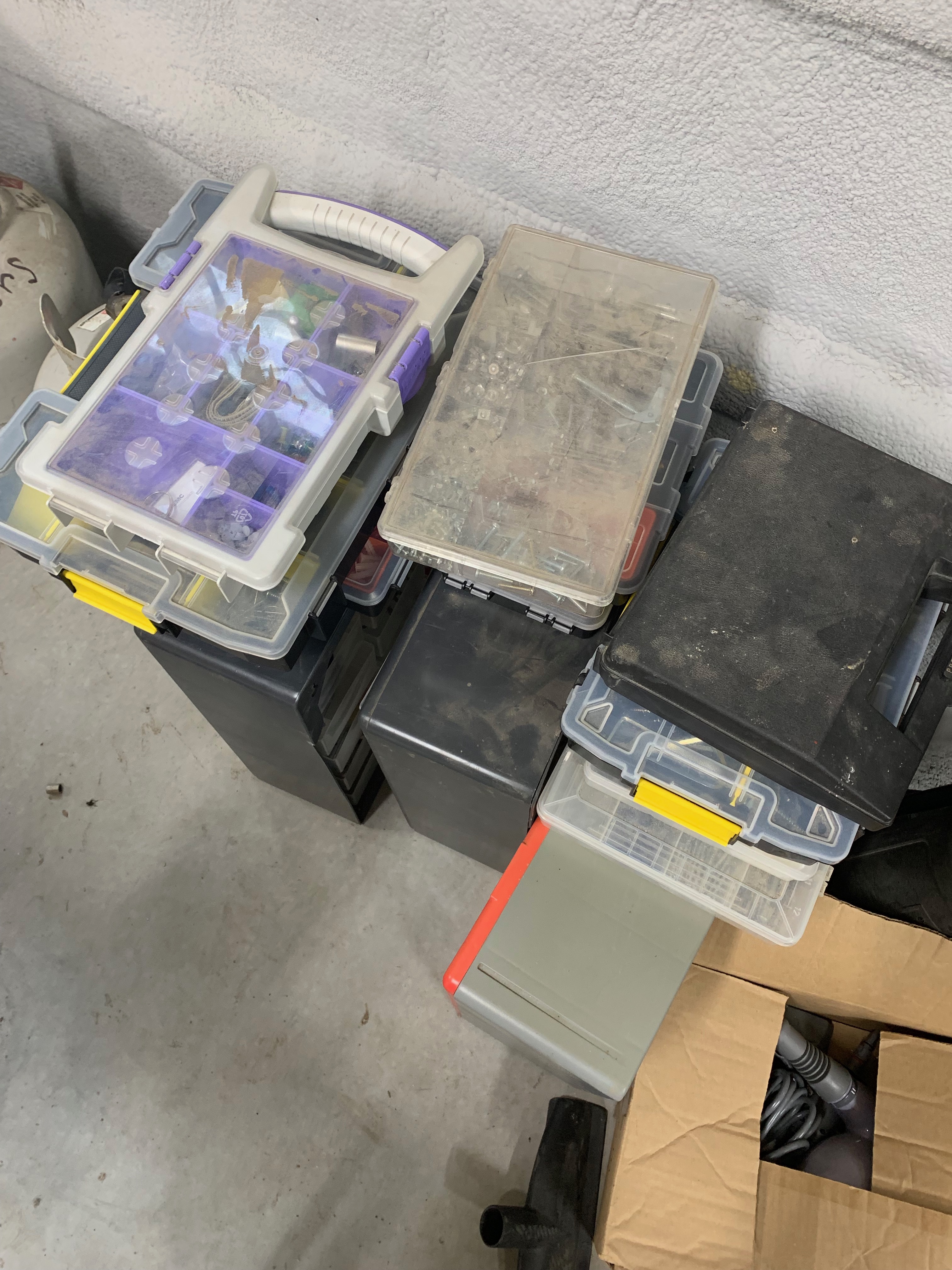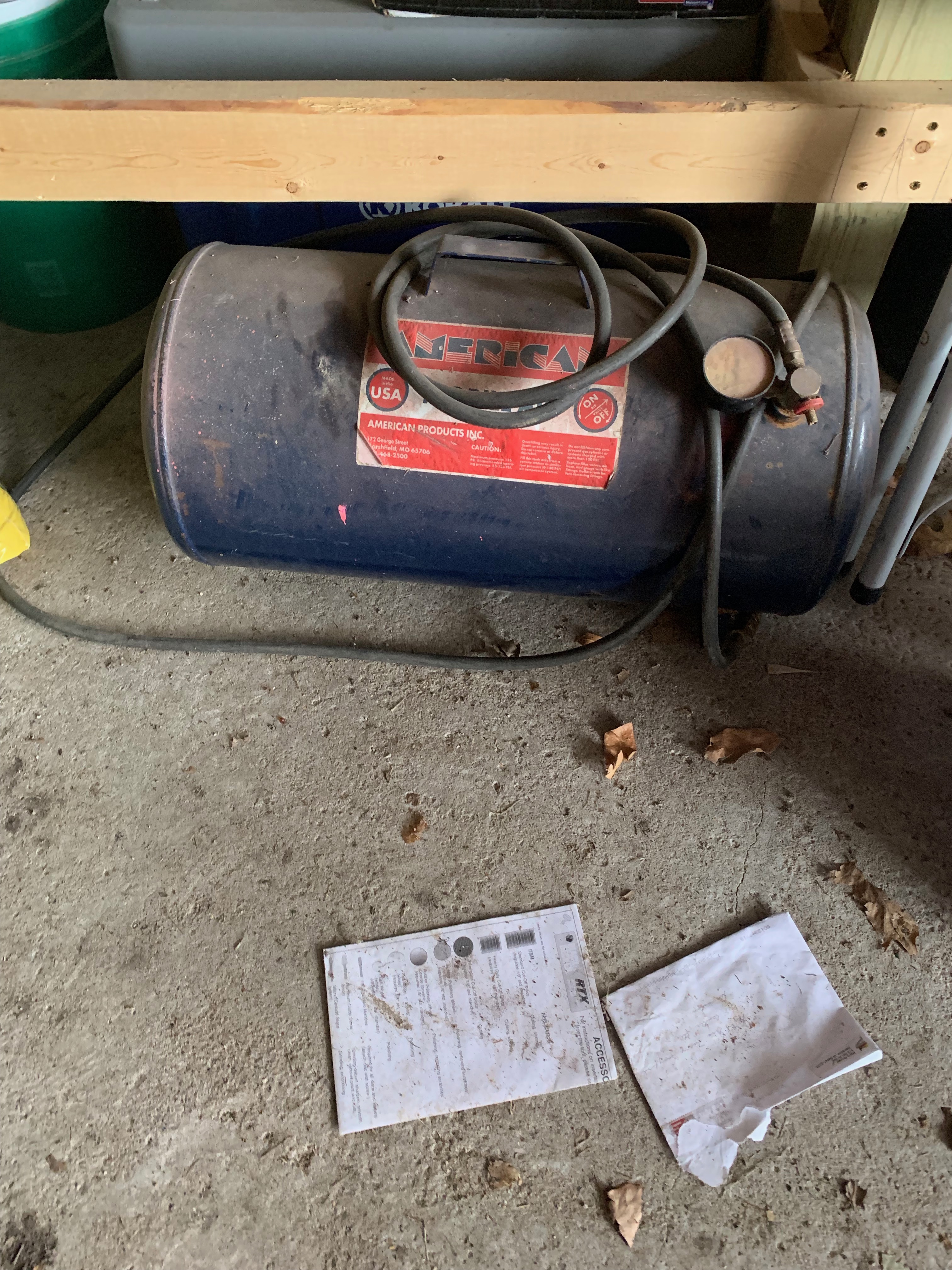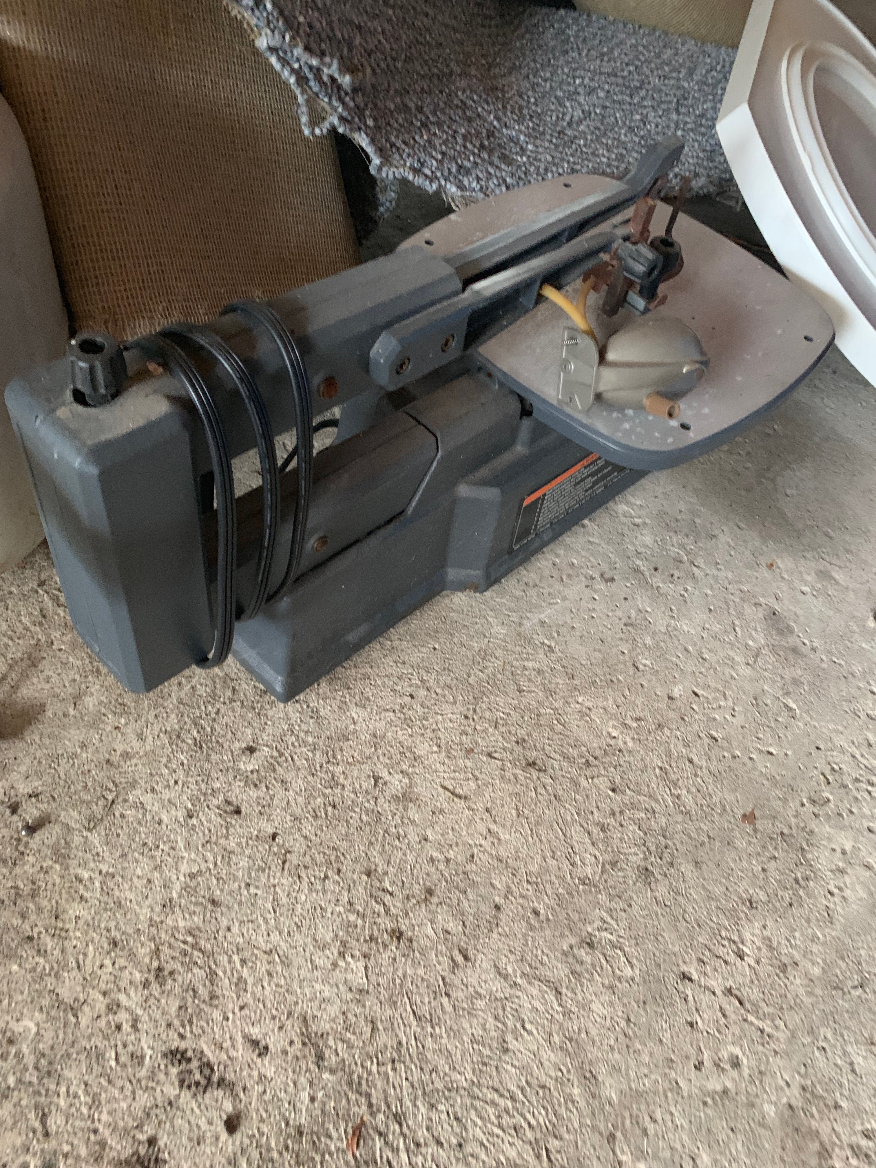 Misc lumber; flats of screw drivers; halogen work lights; Craftsman 2 gal shop vac; reciprocating saw; plastic welding kit; spray gun; multi purpose router guide kit; palm sanders; electrical wire nuts; hydraulic jack; misc craftsman tools; propane heater; Dremel tool; drill doctor; heat gun; hammer drill; small propane tanks; 10 misc cases of small tools; 3 cabinet bolt bins with misc; steam cleaner; Craftsman leaf blower; many flats of assorted knives; tow rope; new bolt organizer; levels; misc putty knives; 50 ft garden hose; nailers; misc hand tools; flats of nails and screws; tap and die set; file cabinet; wire snake; extension cords; hose reel; corded drills; 1⁄2 inch impact gun; cordless craftsman drill; misc yard hand tools; small yard sprayer; fiberglass ladder; work bench; air compressor; shelving; air pigs; hanging storage kits; scroll saw; yard seeder; peg board hooks; step stool; wheel dolly; misc pipe fittings; electrical and plumbing fittings; outdoor house lights; outdoor security light, motion detected; steel ramps; wheel barrow; other misc rack items